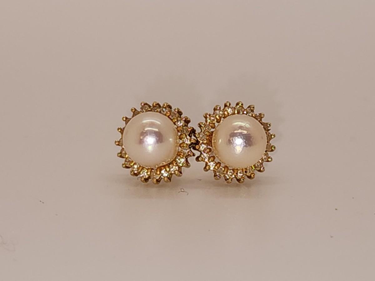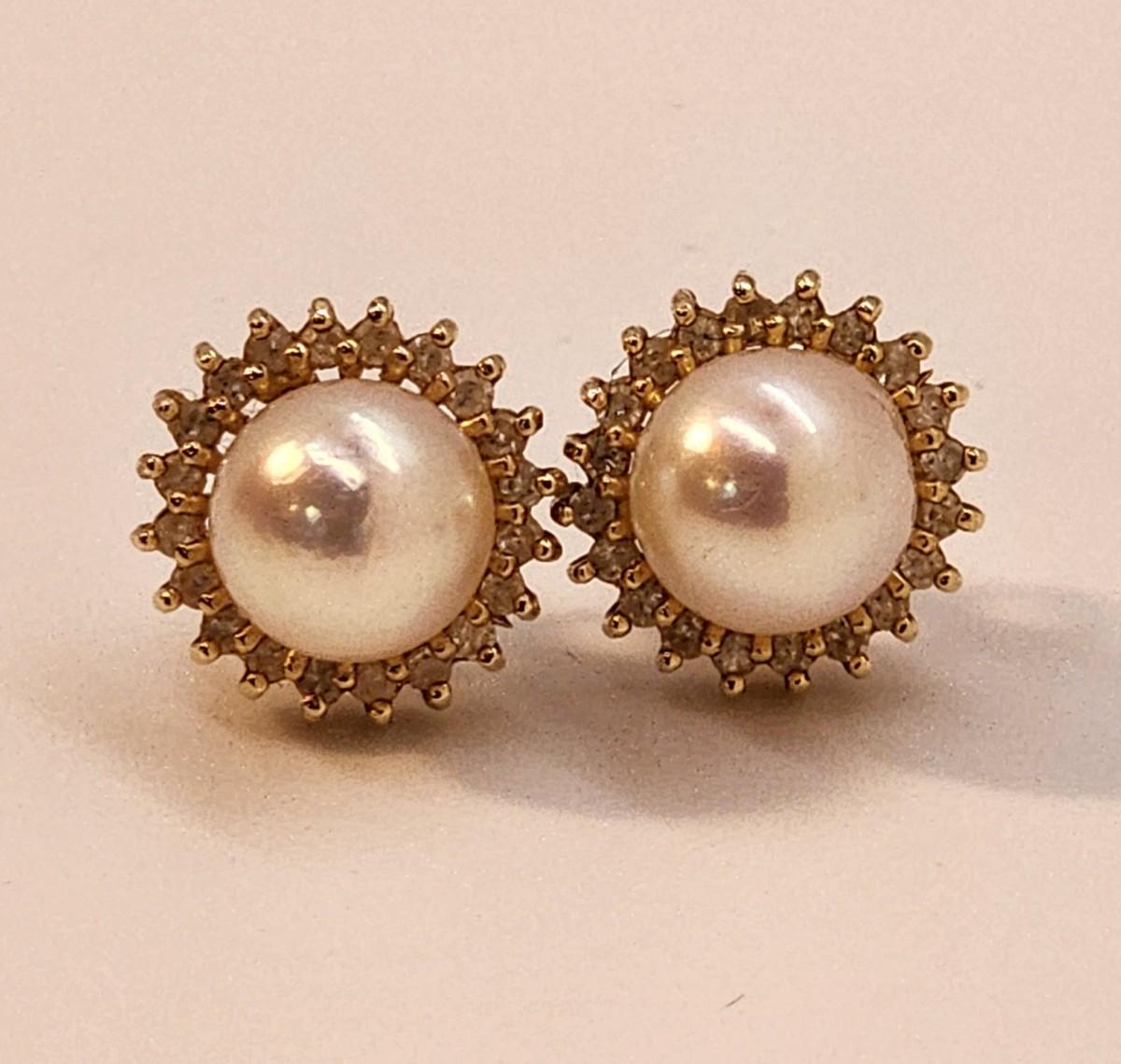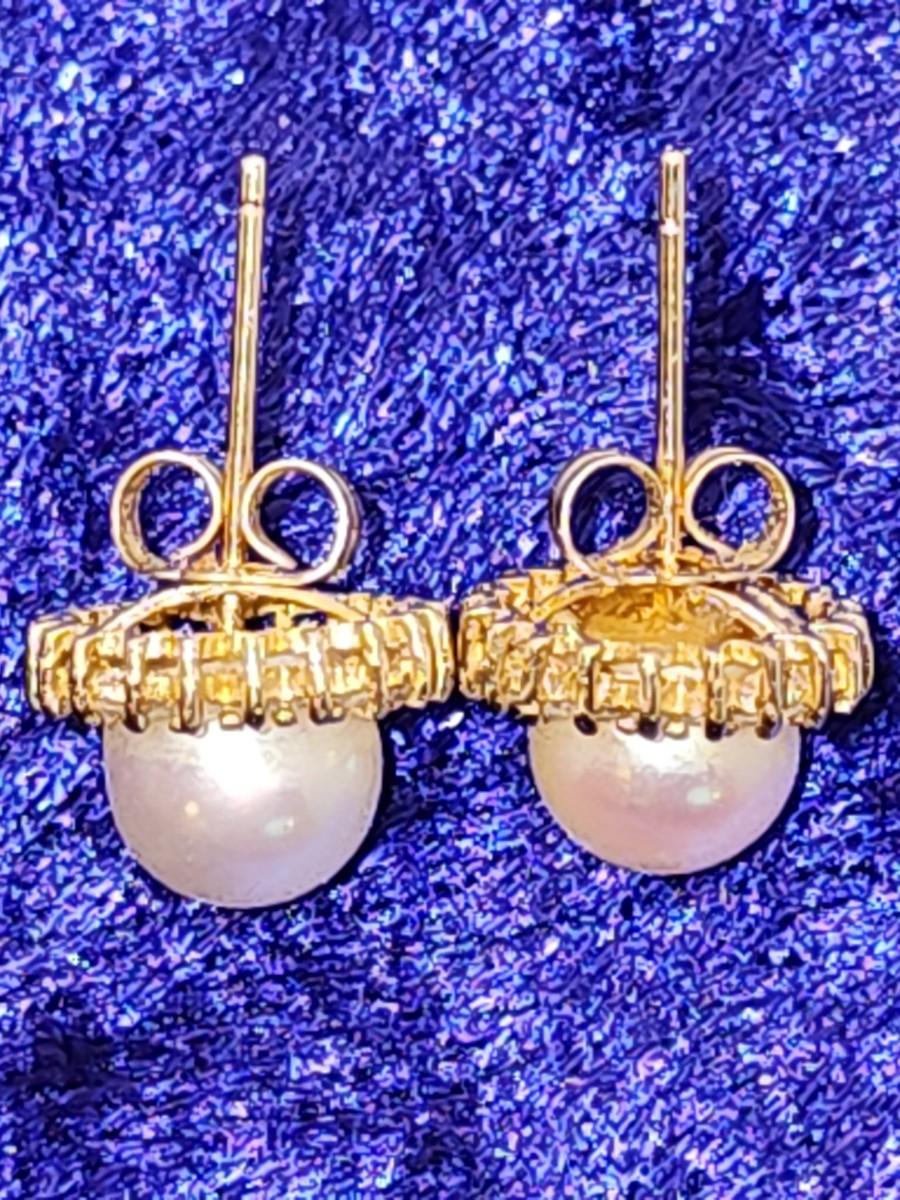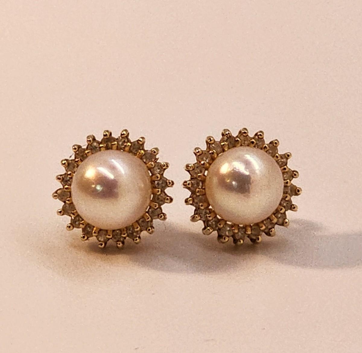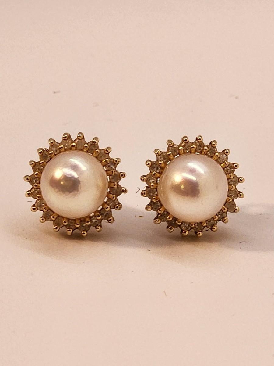 LOT 18:: Gorgeous Cultured Pearl Earrings with a diamond halo set in 14k Yellow gold
