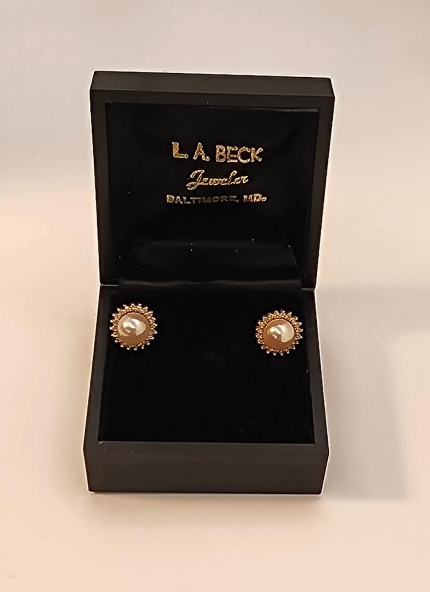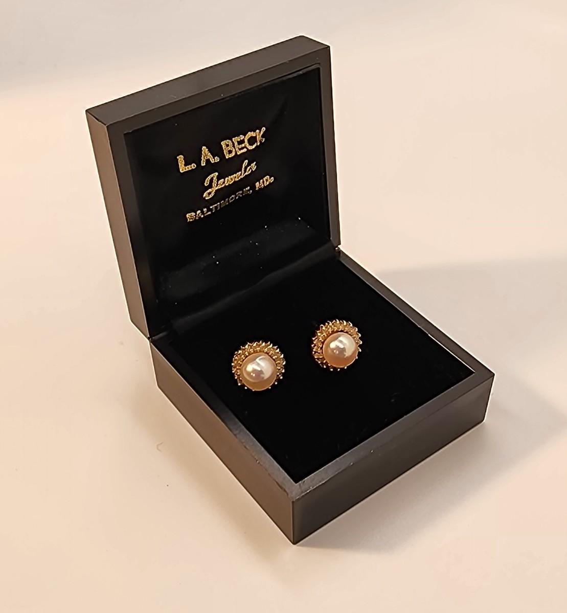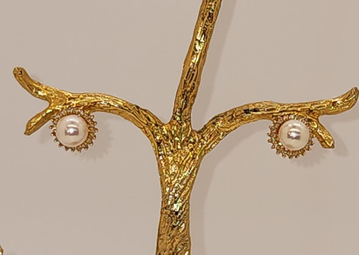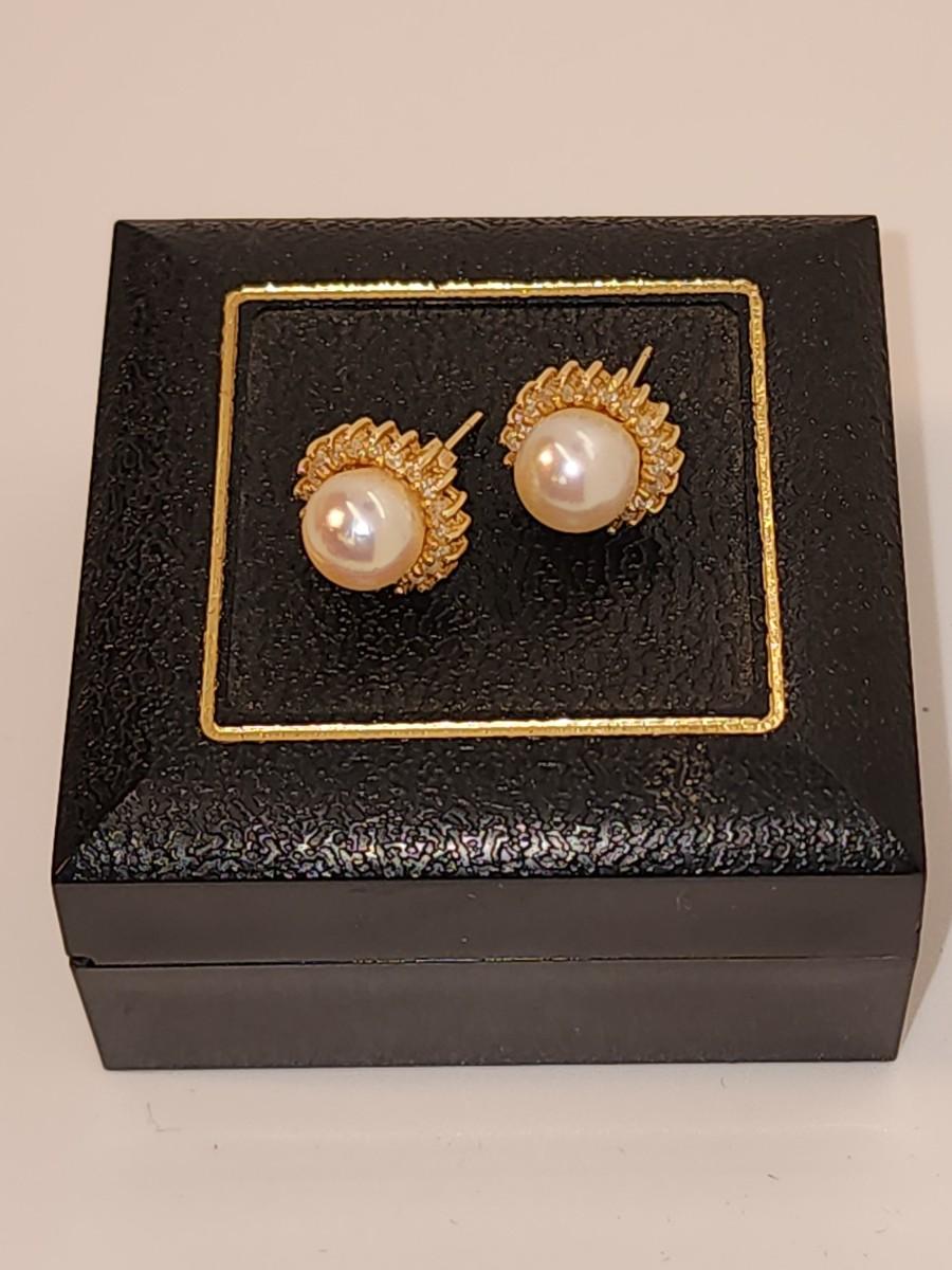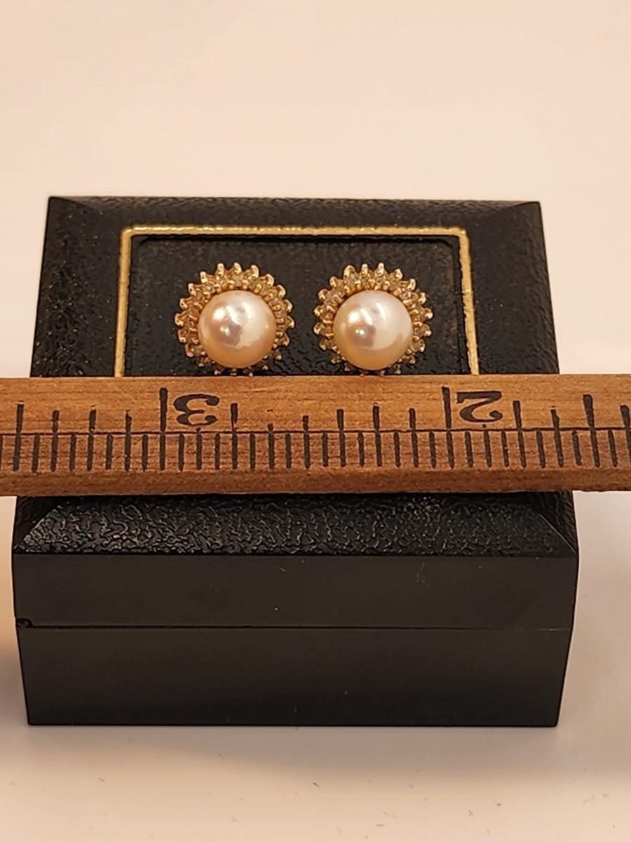 LOT 18:: Gorgeous Cultured Pearl Earrings with a diamond halo set in 14k Yellow gold
