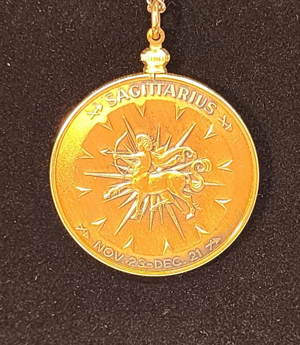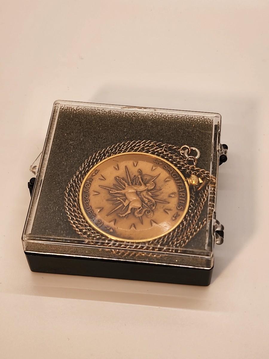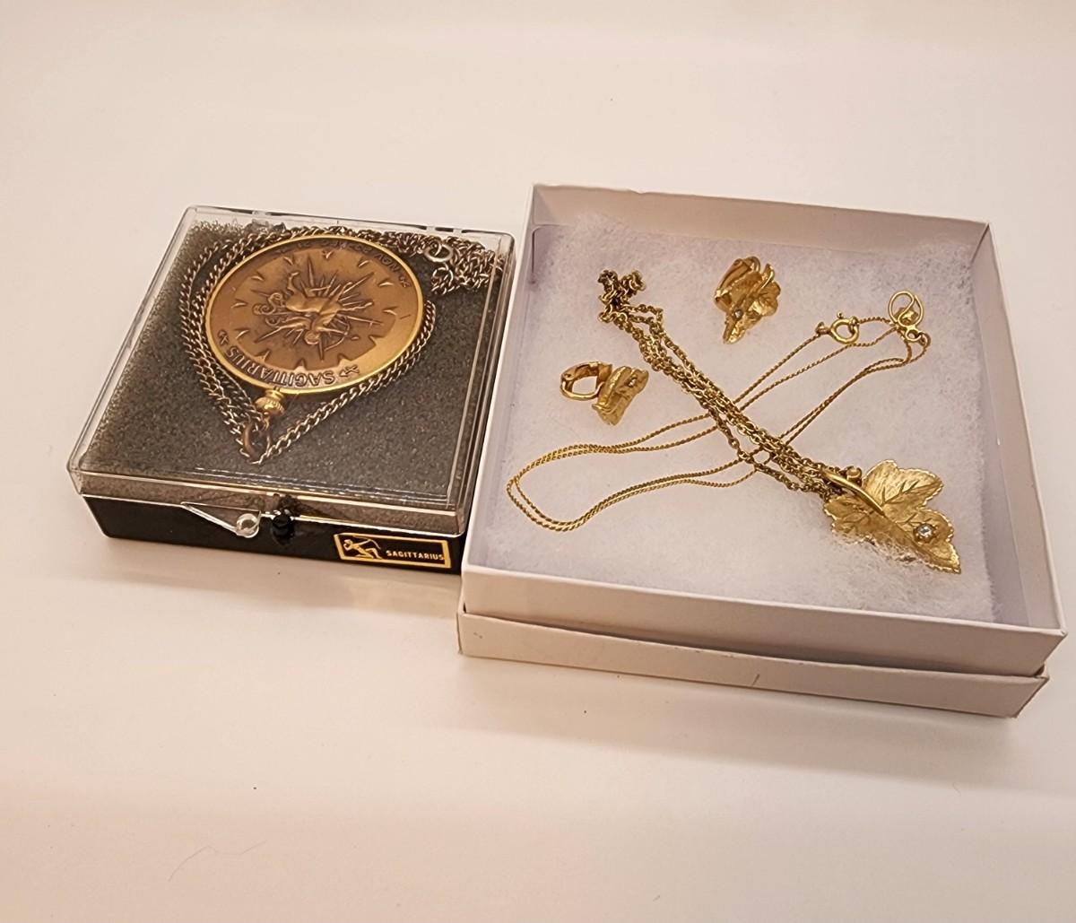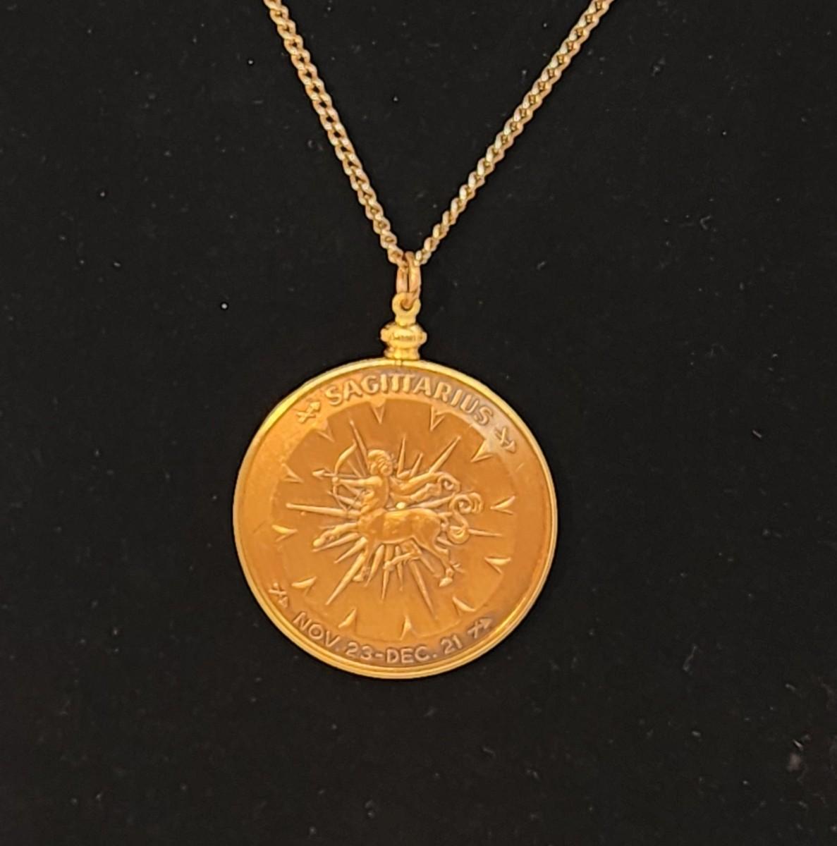 LOT 20:: Sagittarius Medallion necklace, new in box, 1/20 14k GF gold necklace and Avon Set