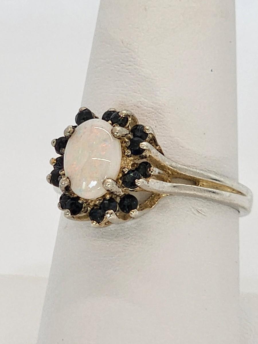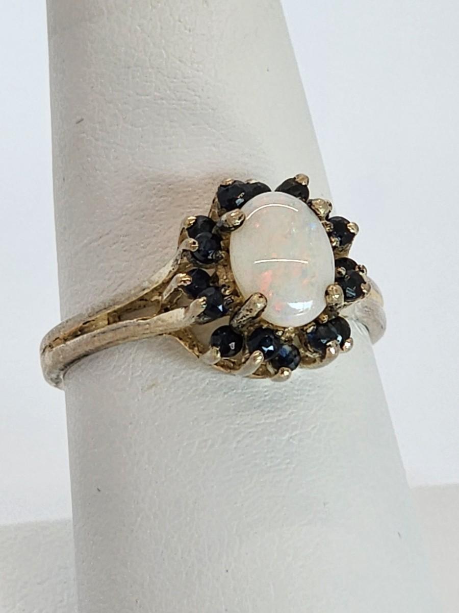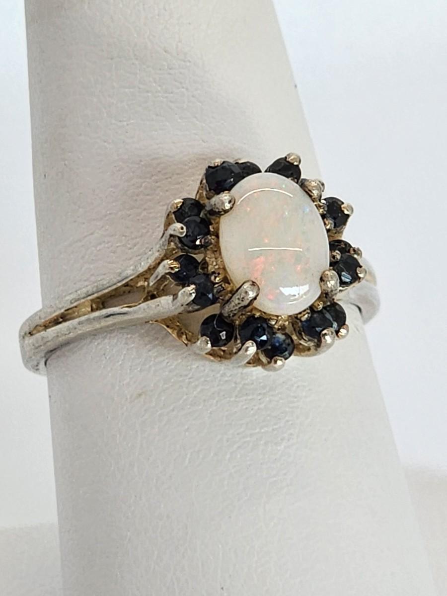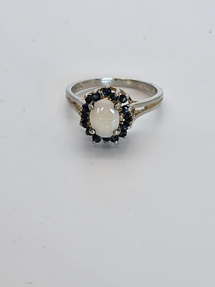 LOT 28:: Beautiful Opal Ring with a cluster halo of Blue Sapphire chips set in Sterling Silver sz. 8