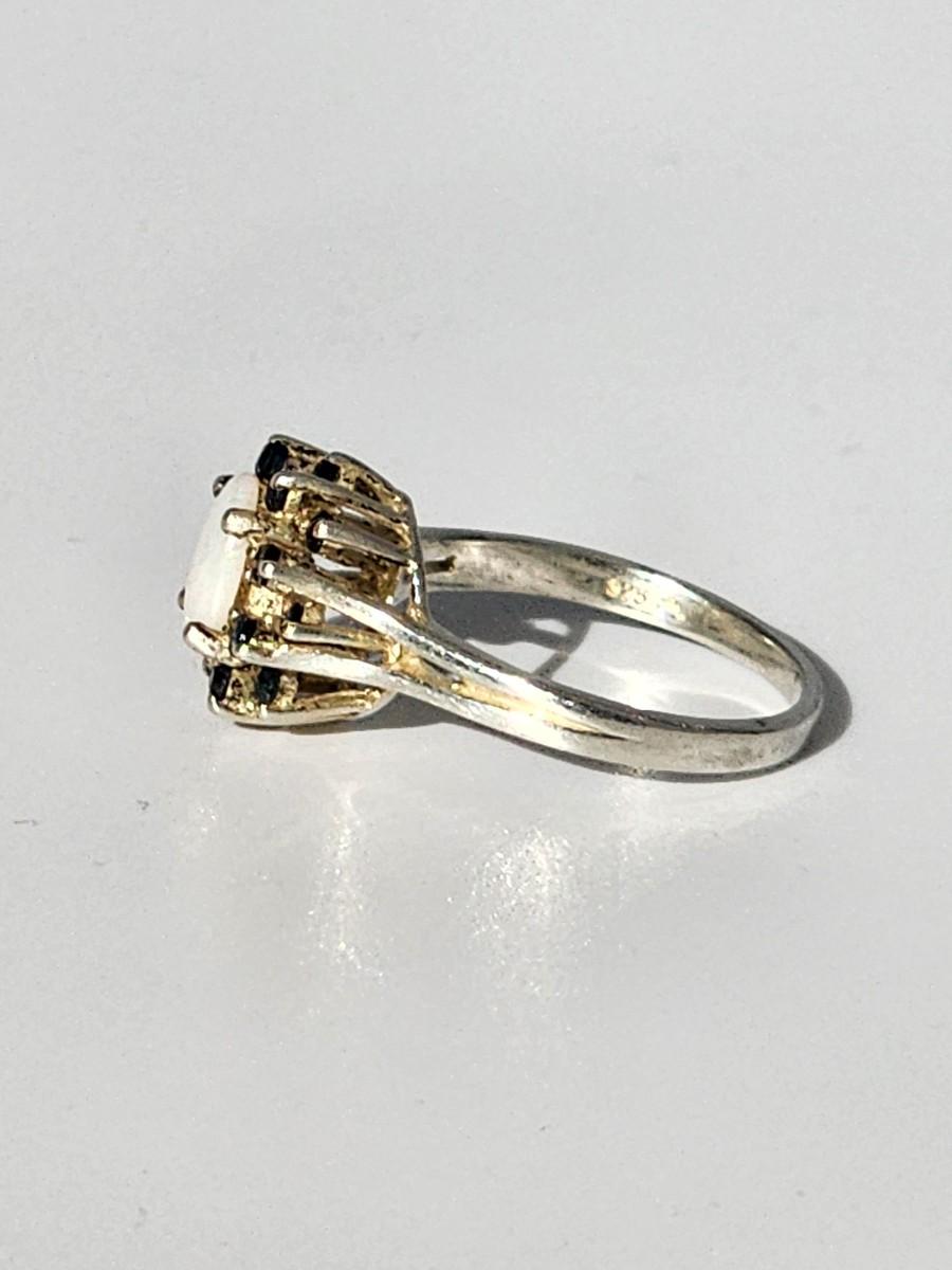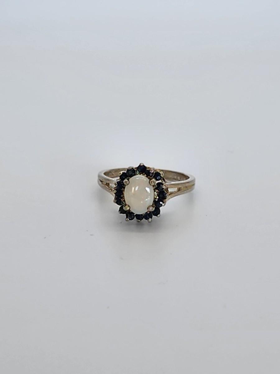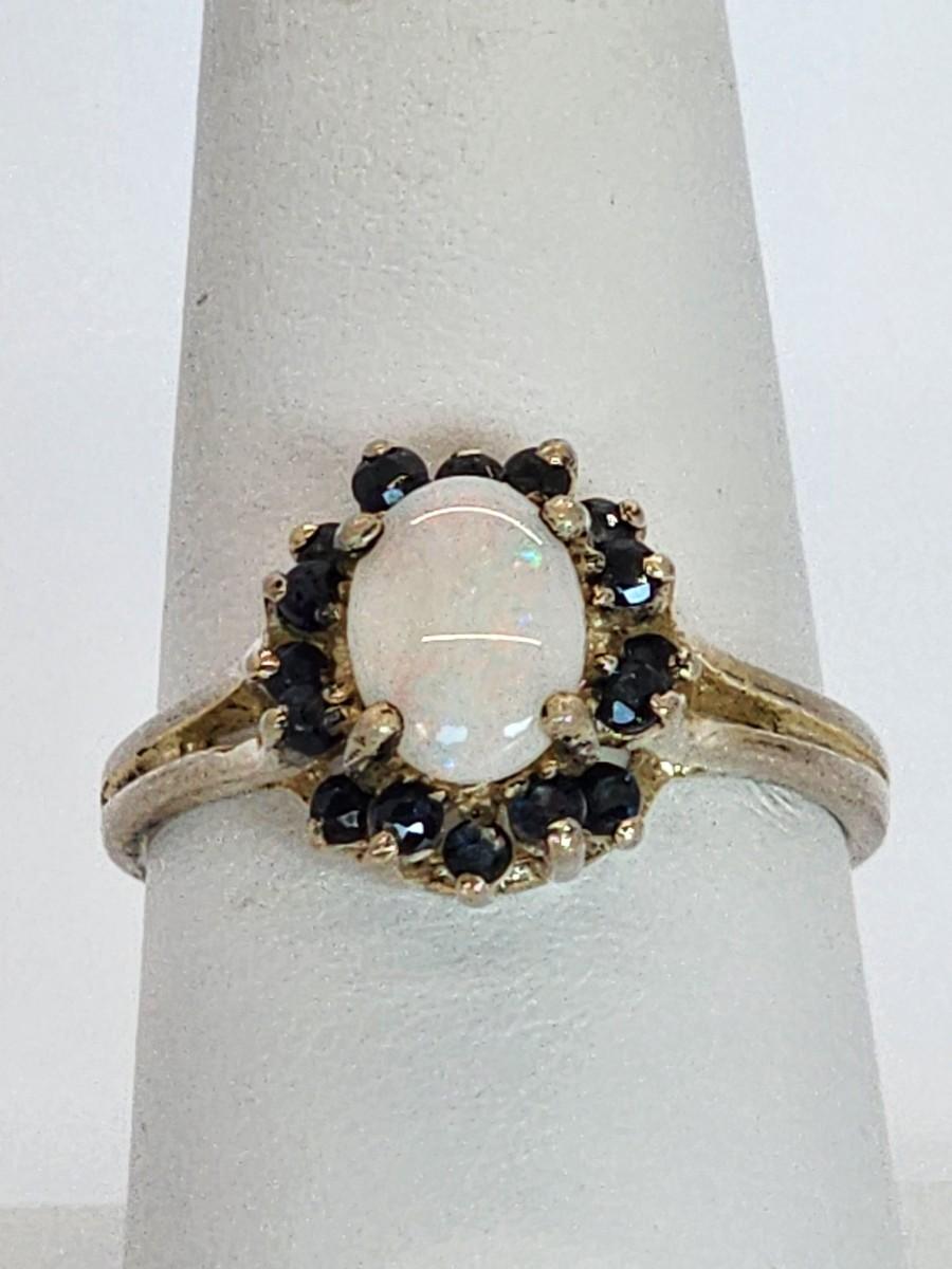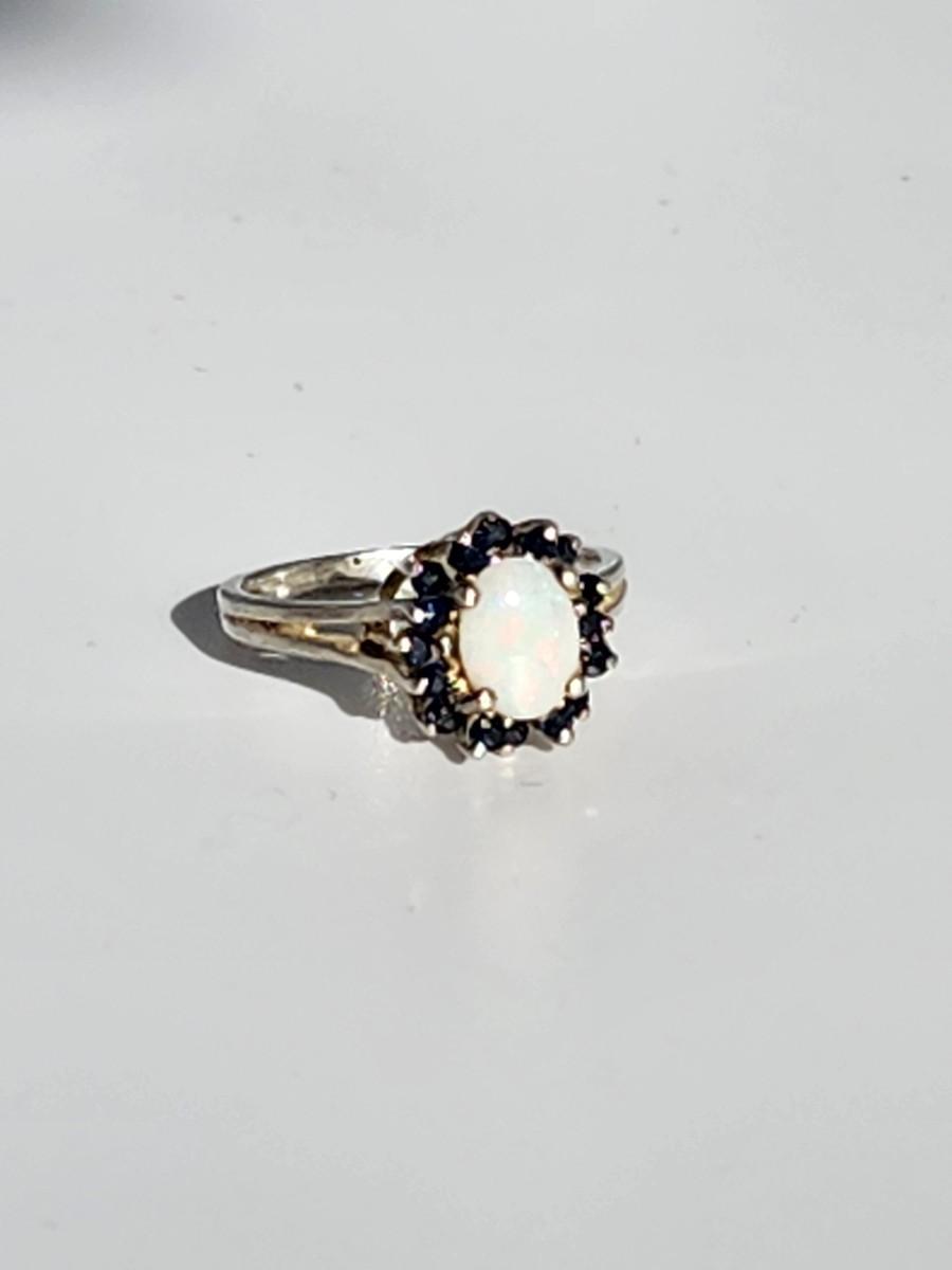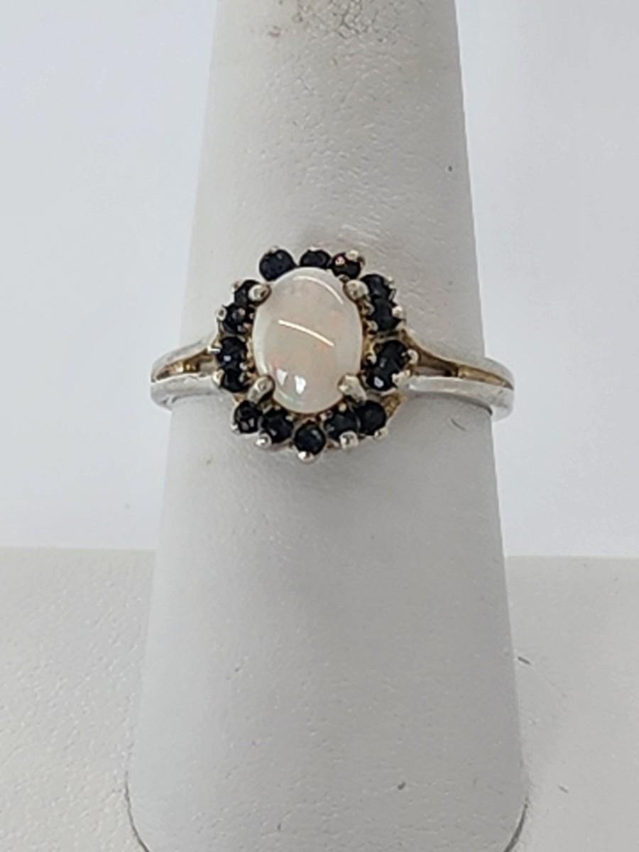 LOT 28:: Beautiful Opal Ring with a cluster halo of Blue Sapphire chips set in Sterling Silver sz. 8
