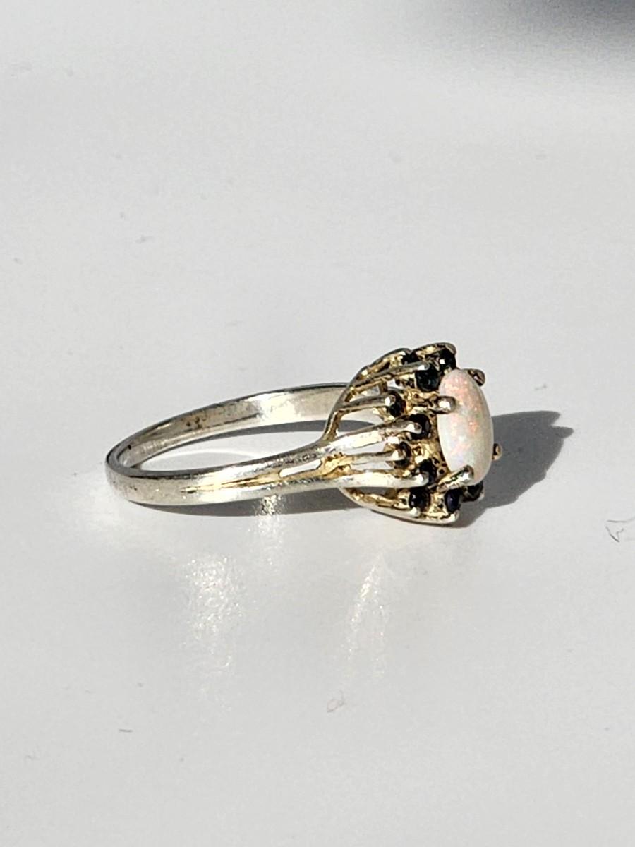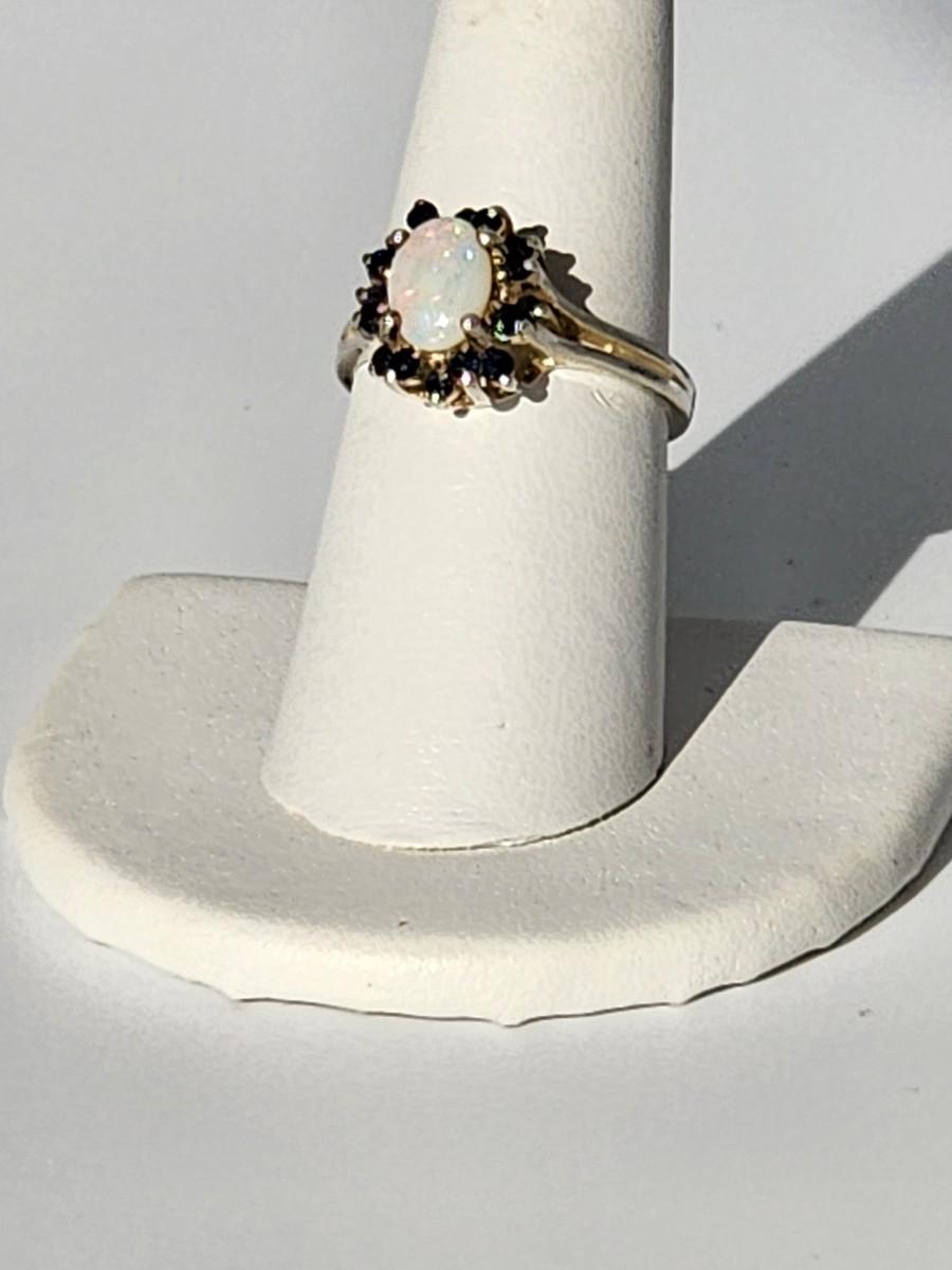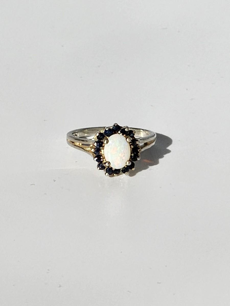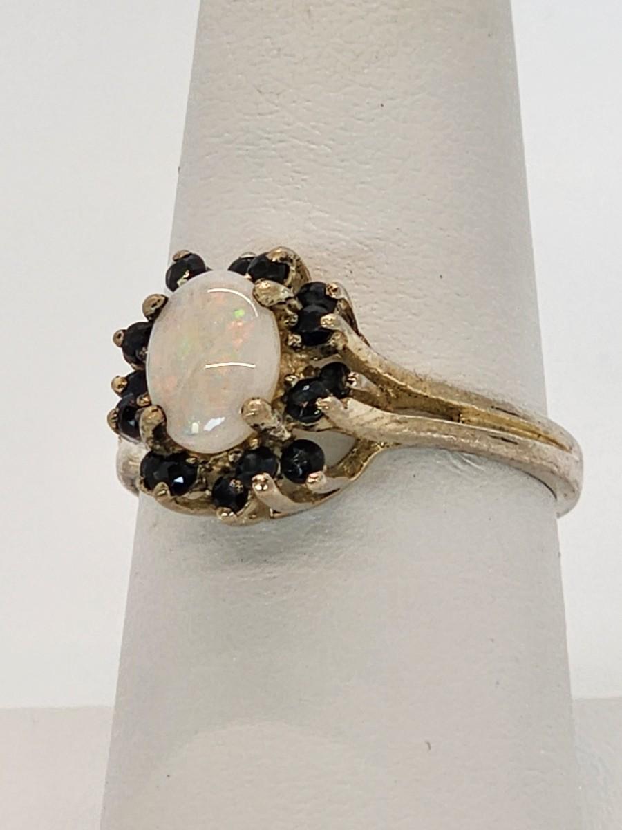 LOT 28:: Beautiful Opal Ring with a cluster halo of Blue Sapphire chips set in Sterling Silver sz. 8