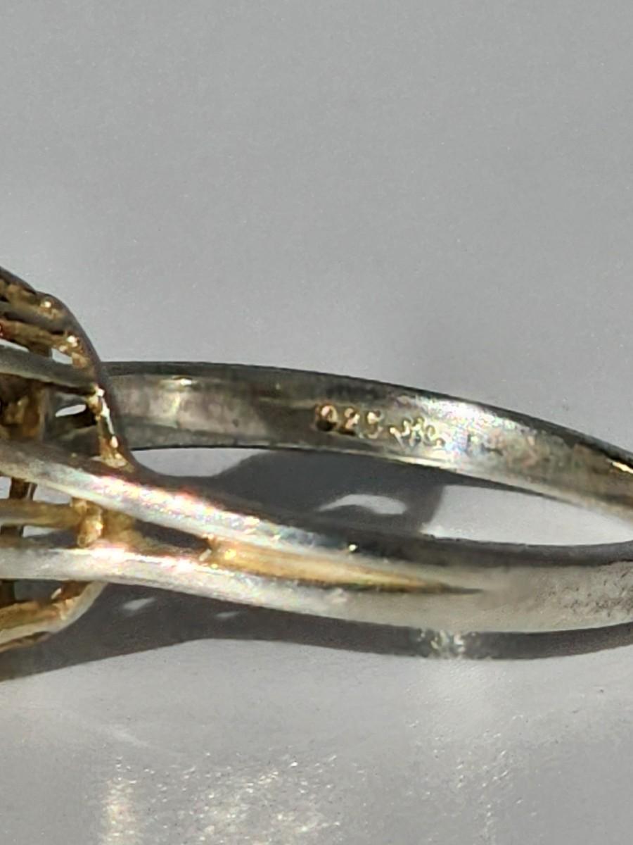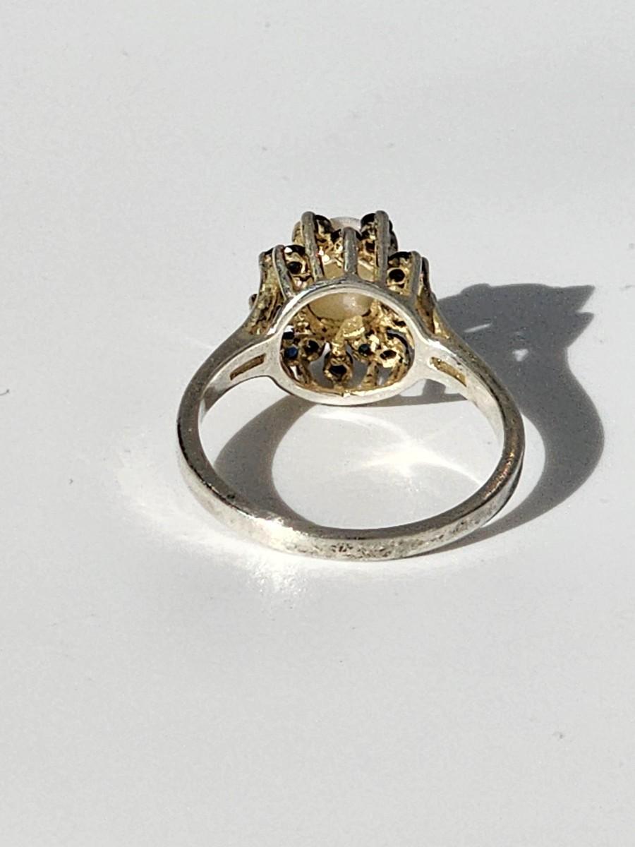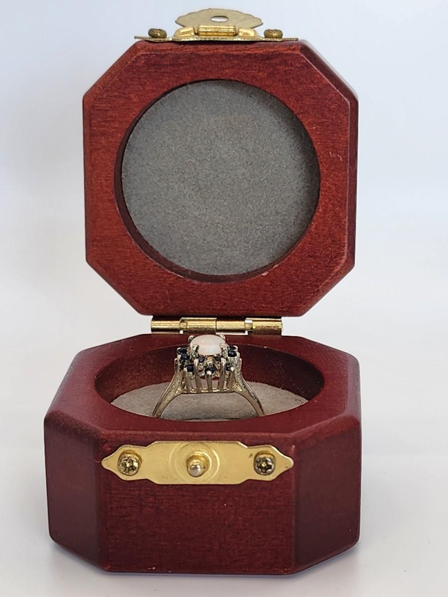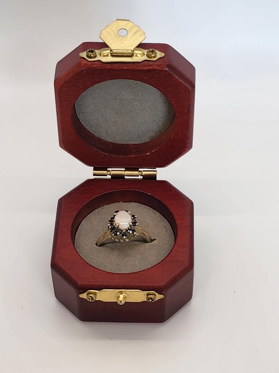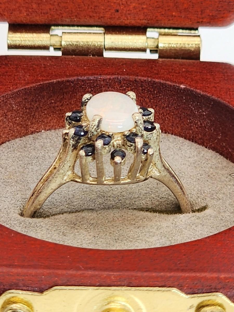 LOT 28:: Beautiful Opal Ring with a cluster halo of Blue Sapphire chips set in Sterling Silver sz. 8