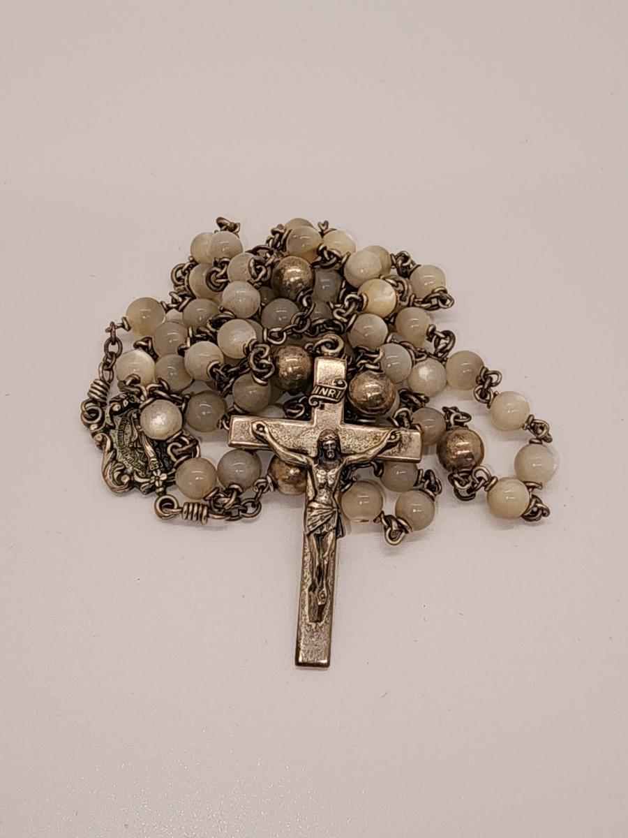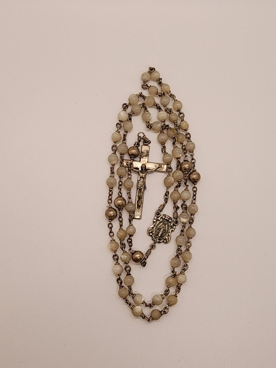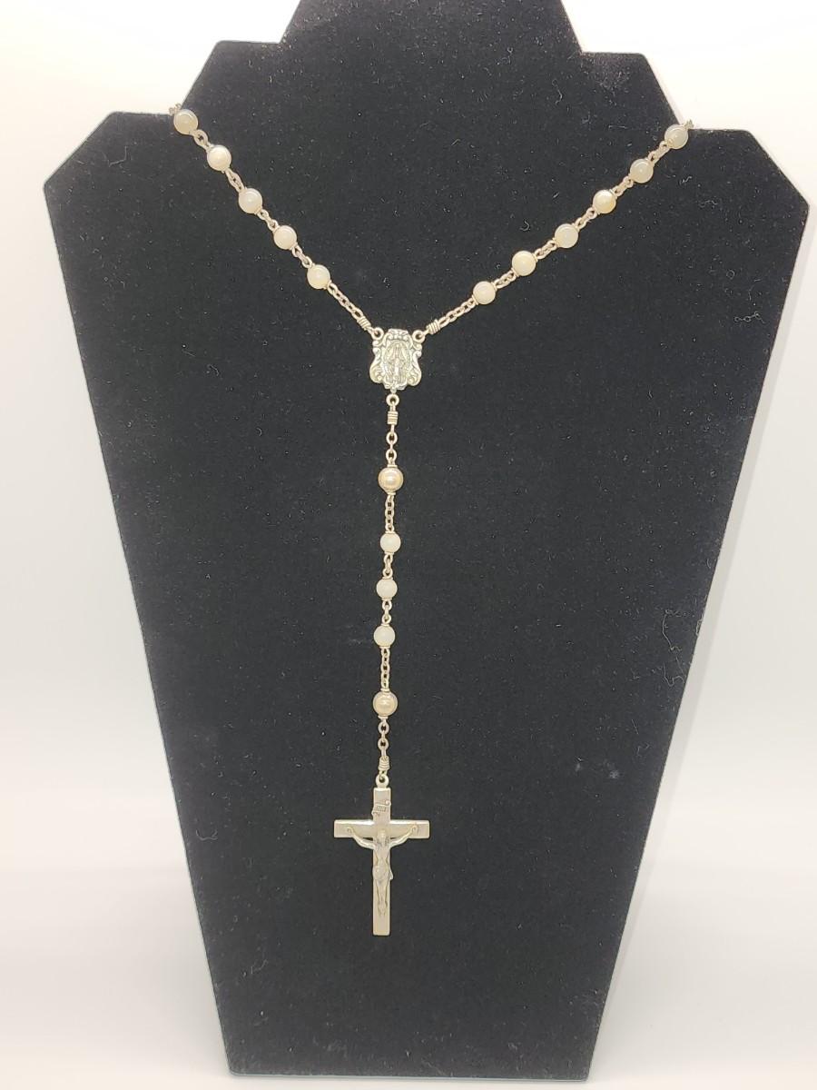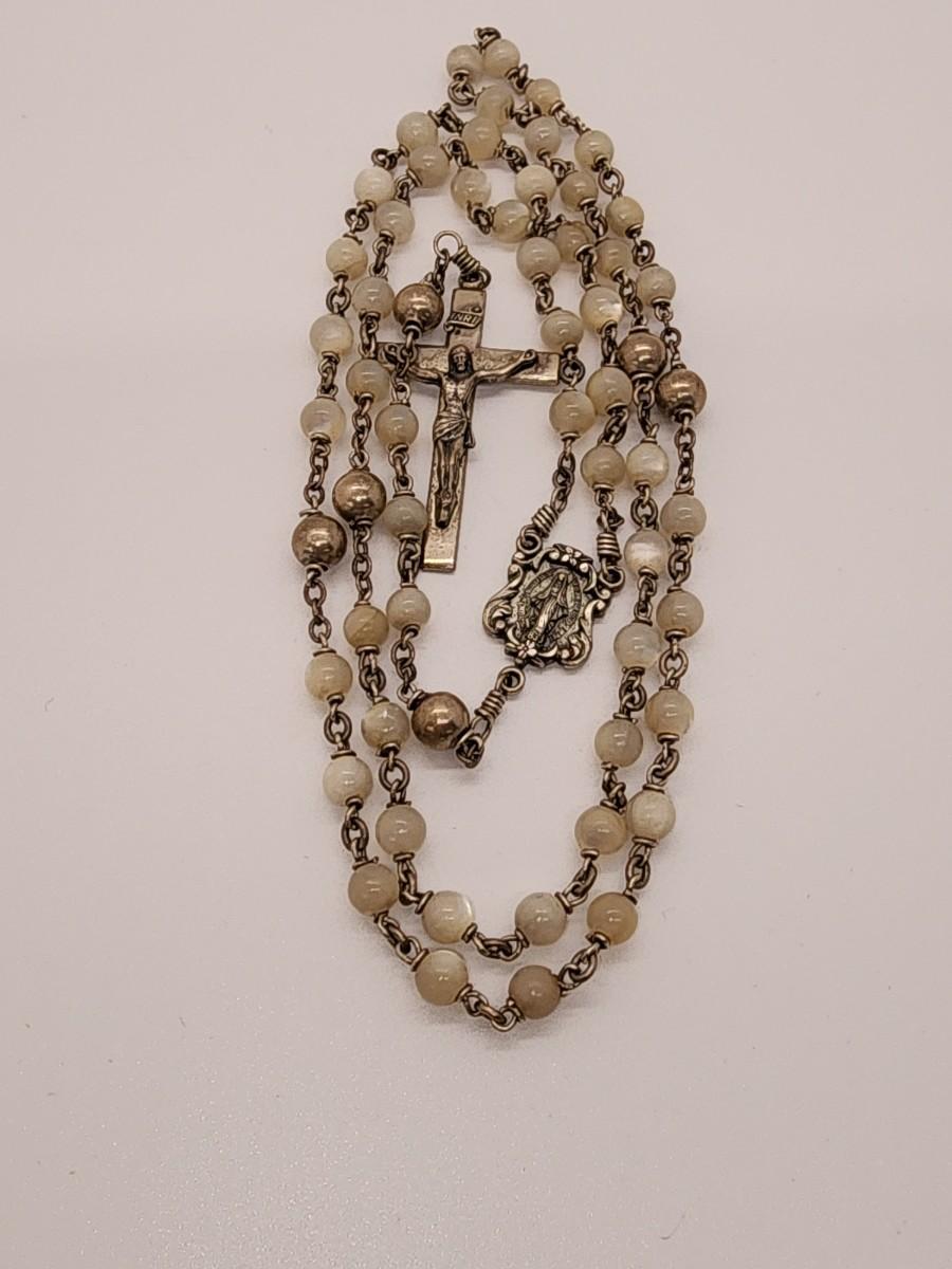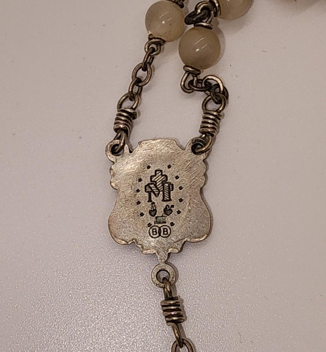 LOT 49:: Beautiful Vintage Sterling and Mother of Pearl Beads Prayer Rosary 925 Silver Signed BB 30"L