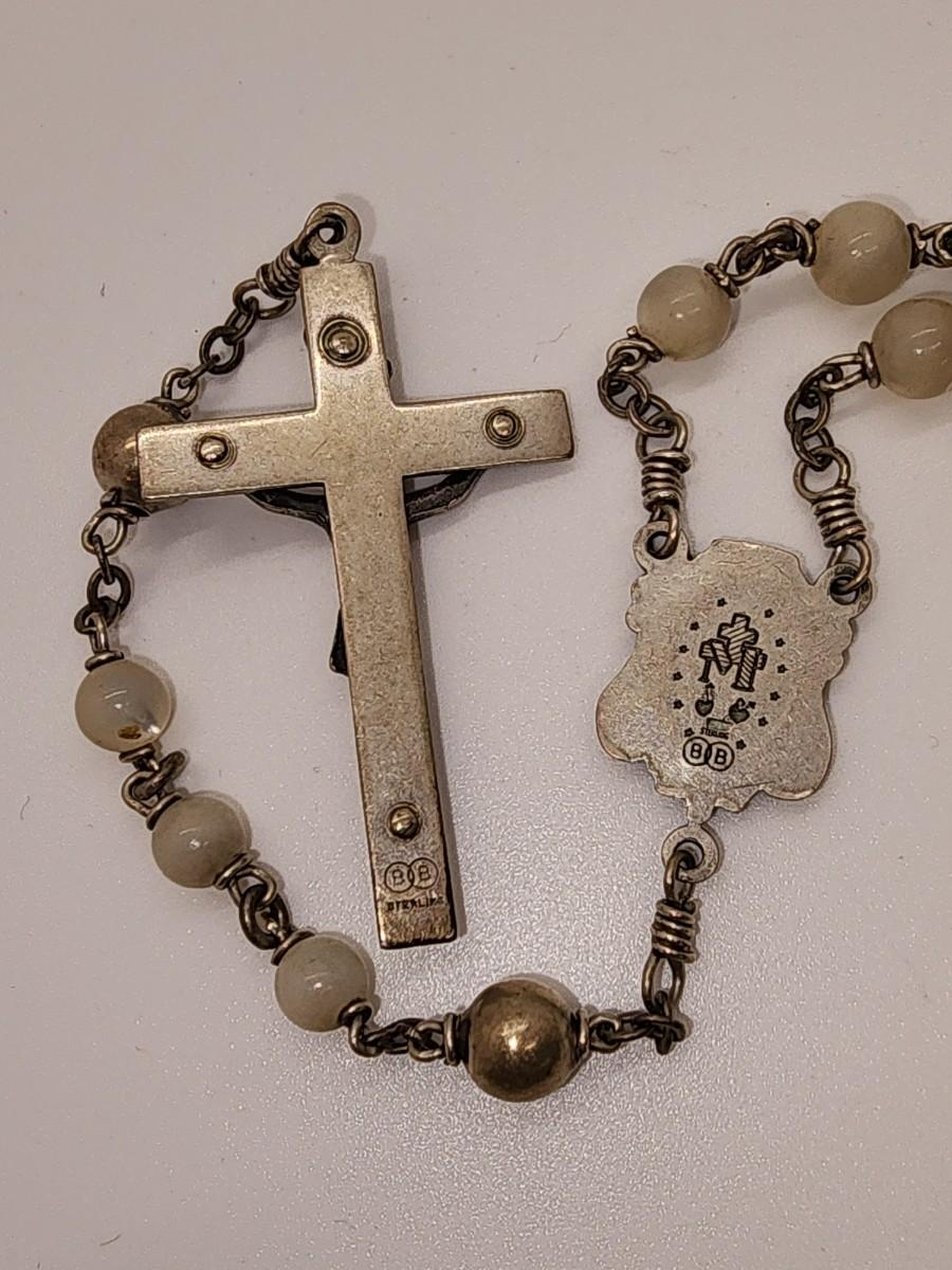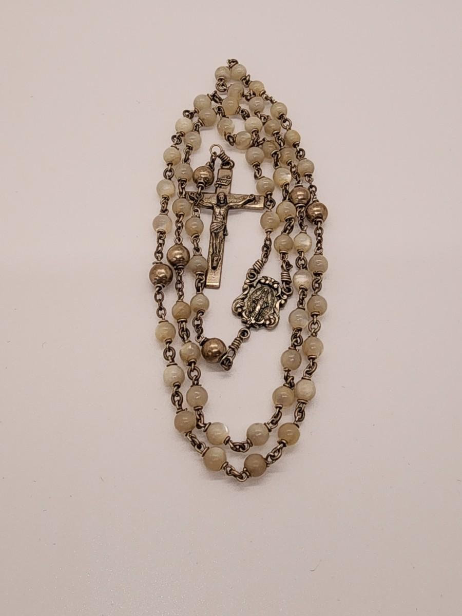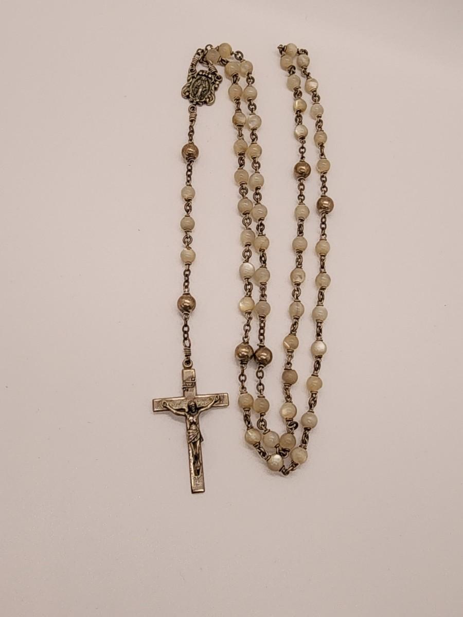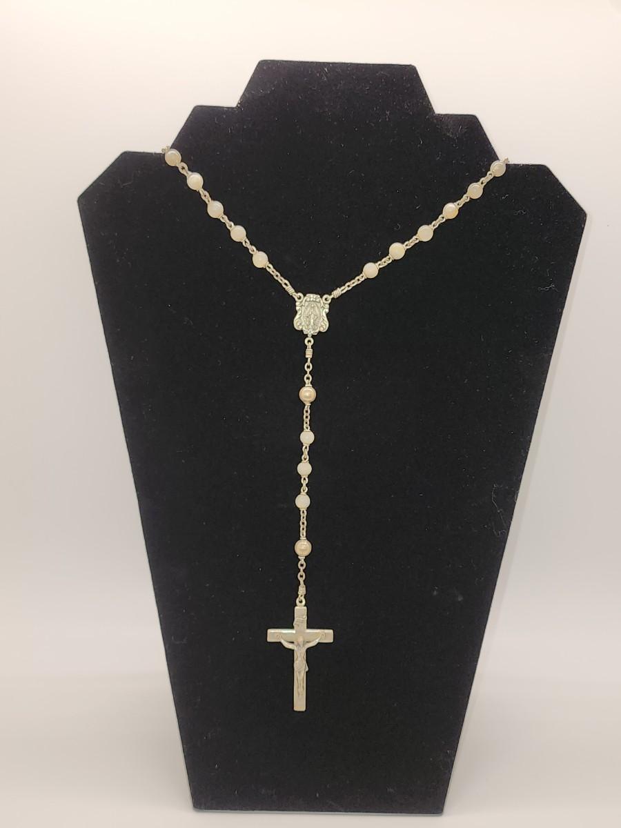LOT 49:: Beautiful Vintage Sterling and Mother of Pearl Beads Prayer Rosary 925 Silver Signed BB 30"L