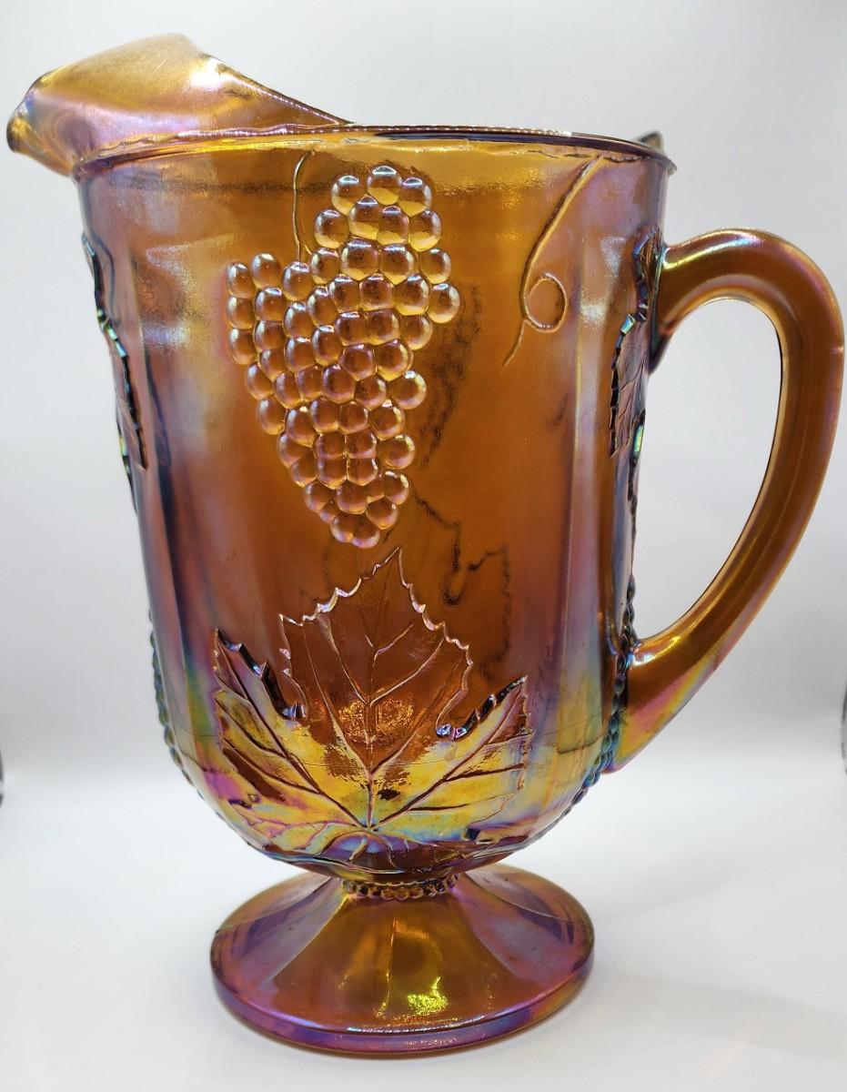 LOT::122 Vintage Indiana Glass Co Marigold Iridescent Carnival Glass Footed Pitcher "Harvest Grape"