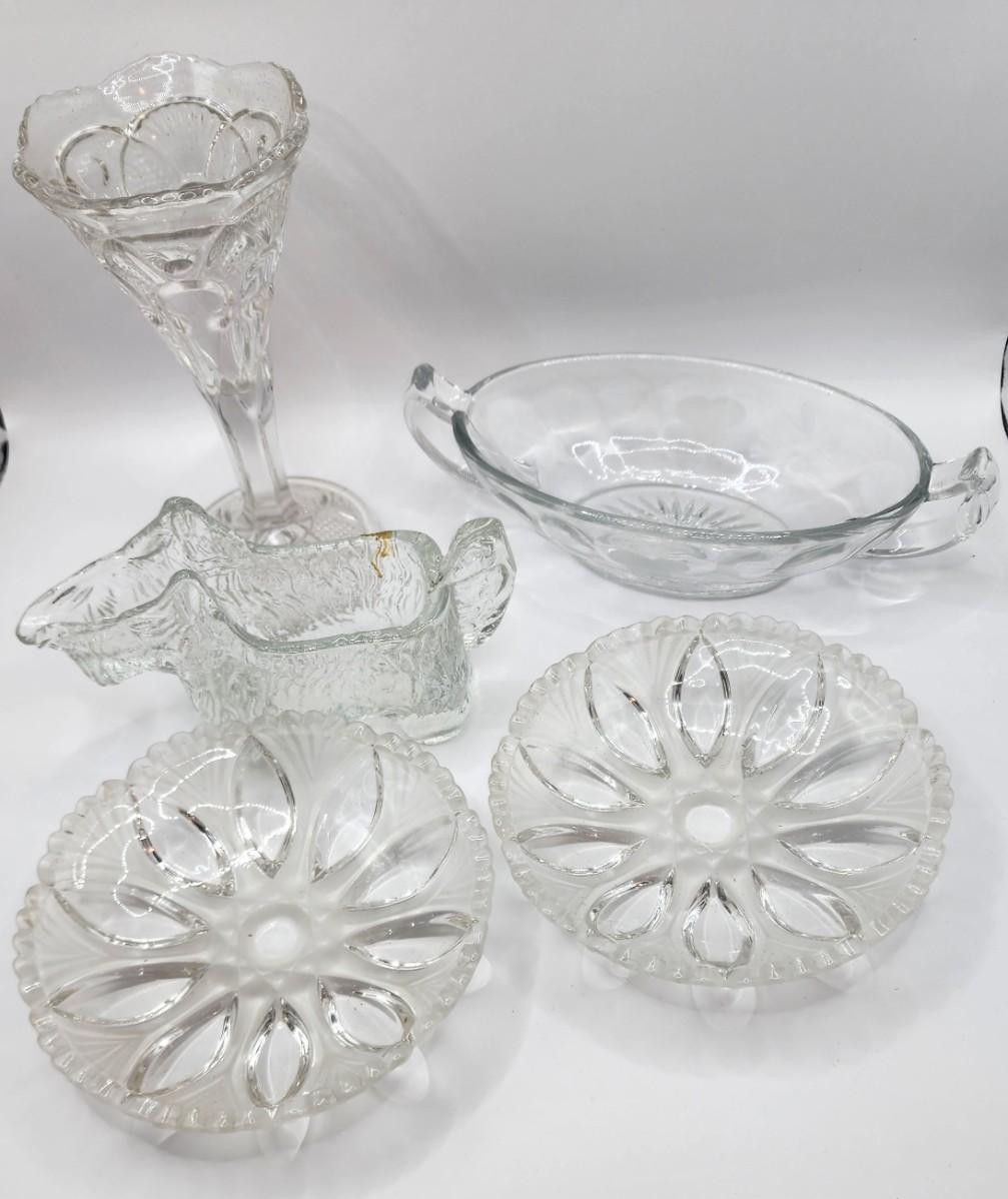 LOT::132 Vintage Bundle Clear Glass 2 Knuckles, 1 Candy Dish, 1 Dog Creamer, 1 Bud Vase