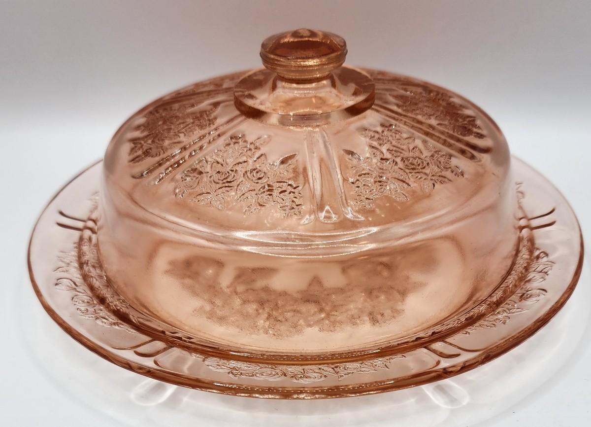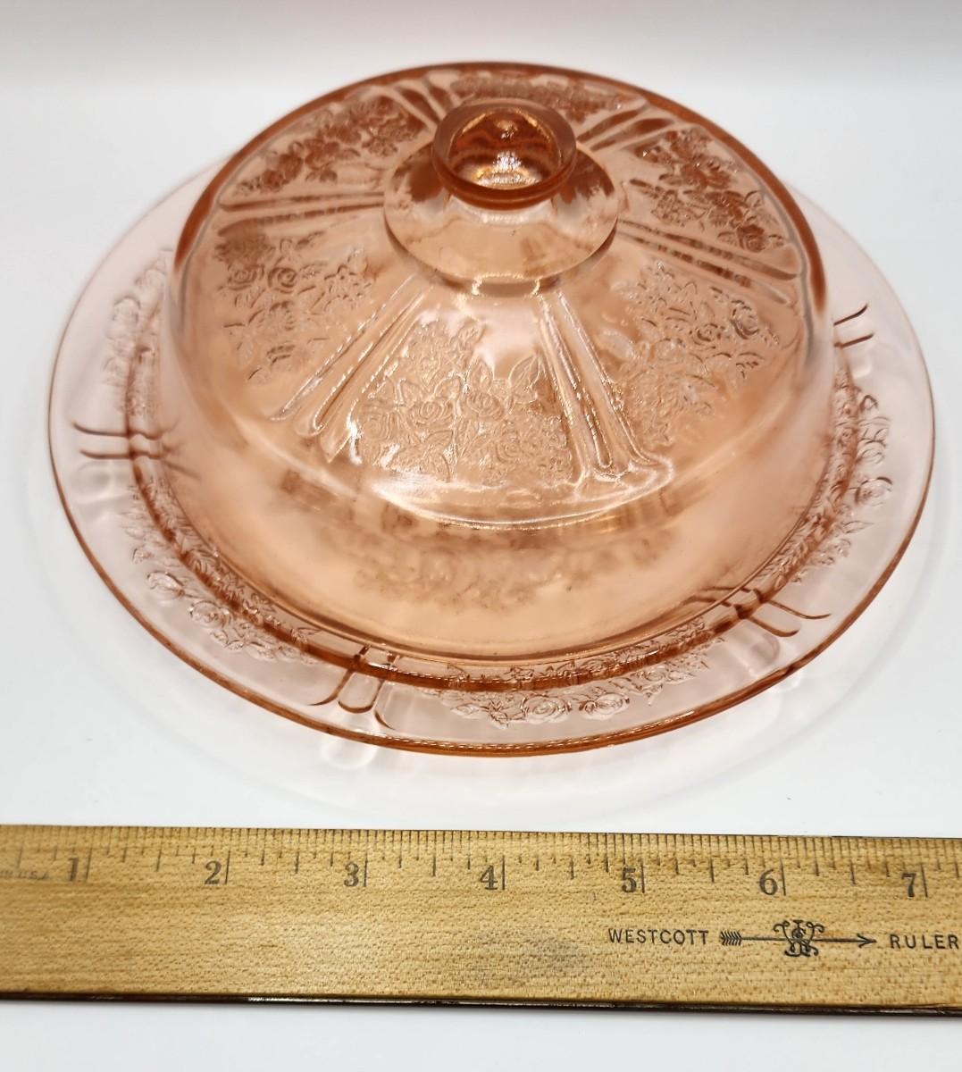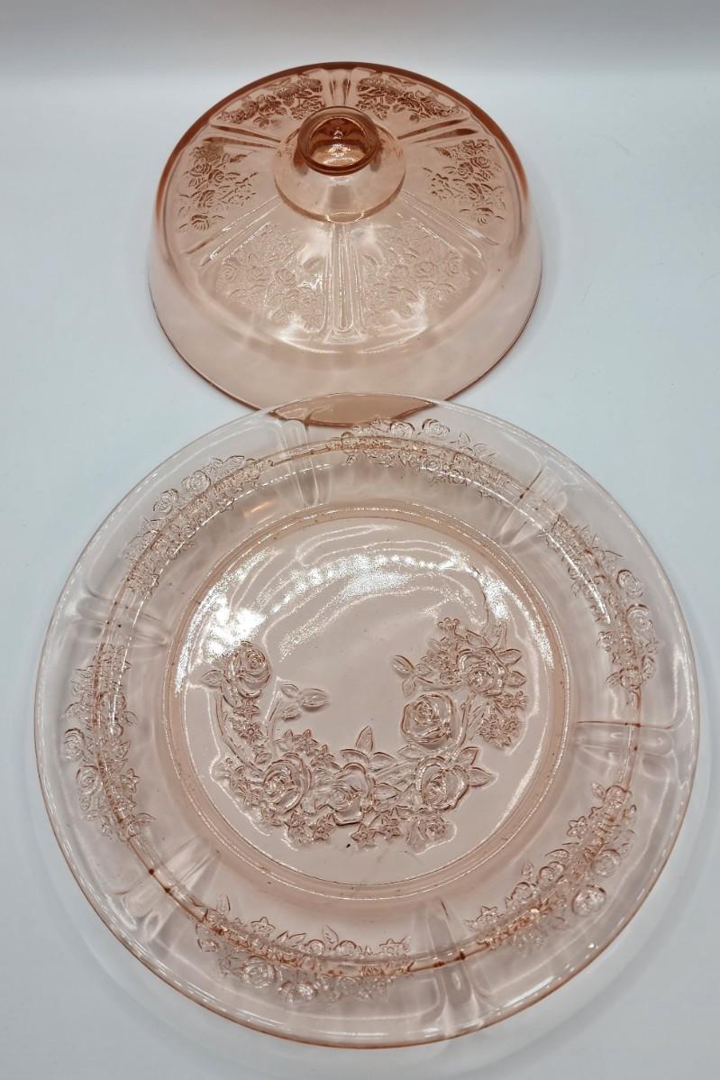 Anchor Hocking Pink Depression Glass Mayfair lidded butter dish. Pink Cakeplate. 3 Green Sherbert cups gold trimmed.