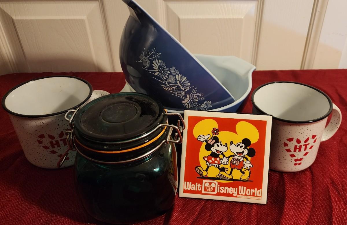 Pyrex pattern- Colonial Mist Blue. Disney Mickey & Minnie Trivet. Mason Jar.