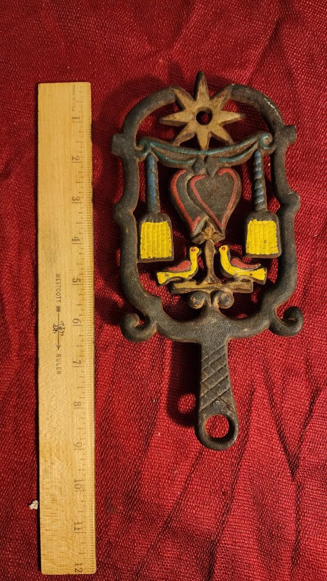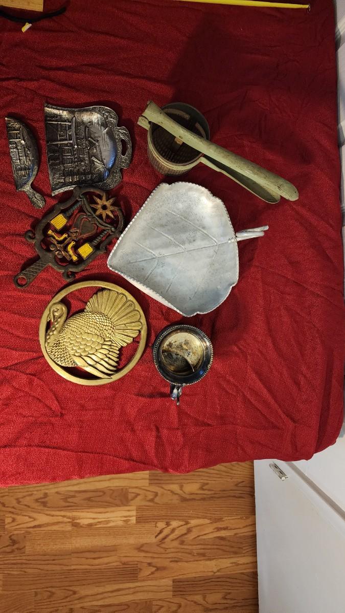 Brass Turkey Trivet, Cast Iron Trivet, Potato Press, Crumb Catcher, Aluminum Leaf Dish. Please see all pictures as they are the best representation of the items. The pictures show condition, measurements if taken, and what is included in the lot. Due to the large amount that we photograph and the time frame, we are not always able to take measurements. All items unless noted, are pre-owned and have been used. If you purchased furniture, you must bring help. We do not allow one person to carry large furniture out on their own. Bring help, tools and a truck for the safety of our client’s homes, and your personal safety. Any damages that result to the property including walls, and floors due to moving of the furniture will be charged to the buyer. Company policy. Thank you.