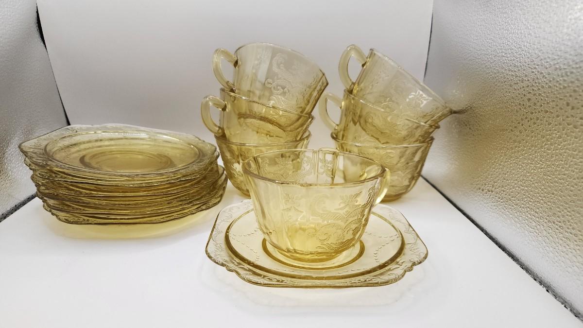 LOT::168 Federal Glass Co 1930s Marigold Depression Glass "Madrid" Pattern 7 Teacup and Saucer Sets