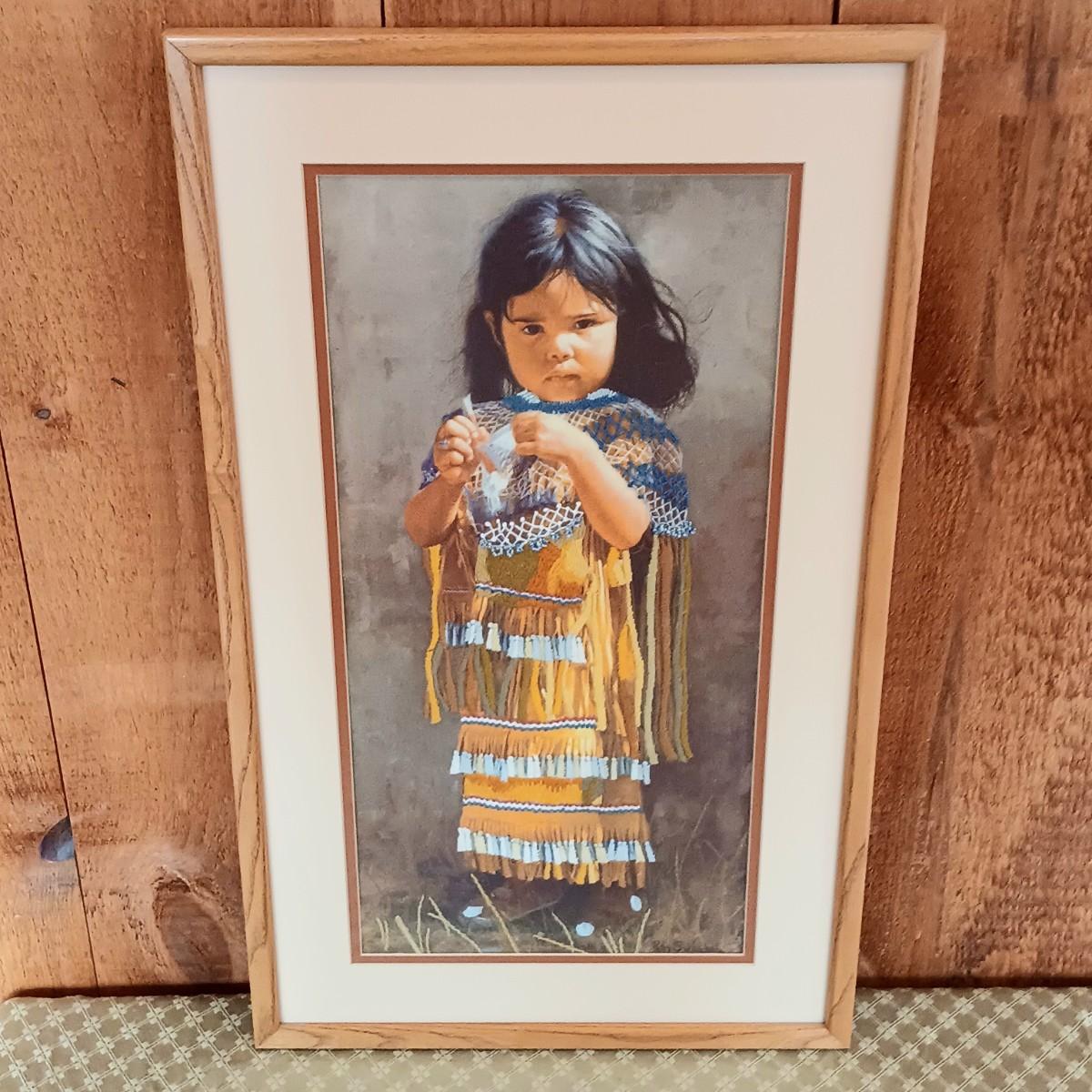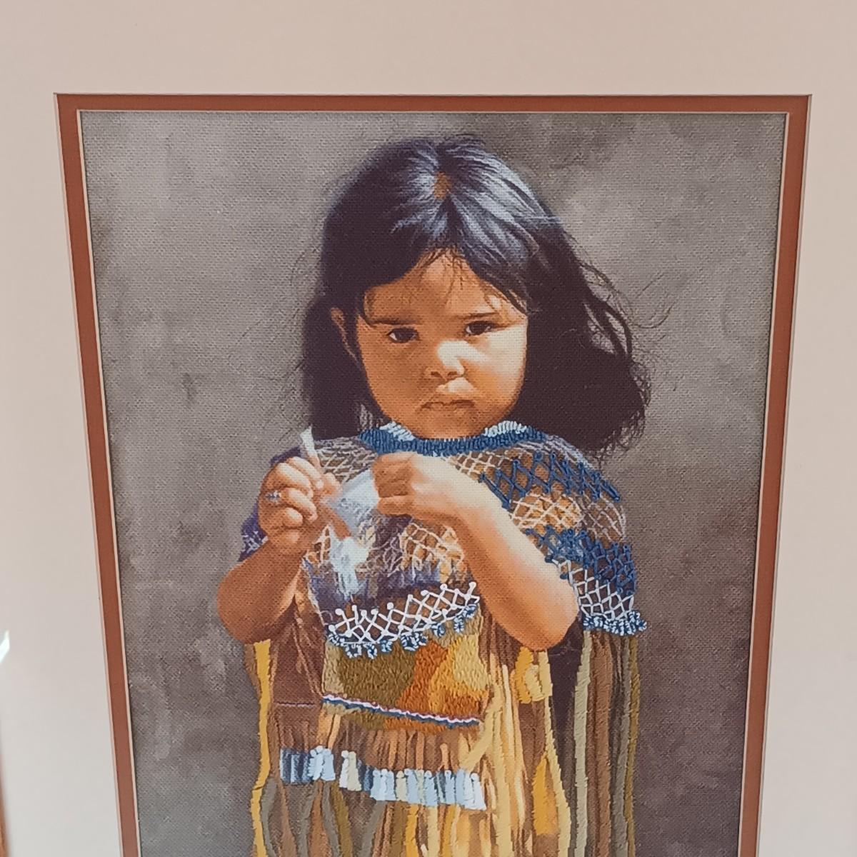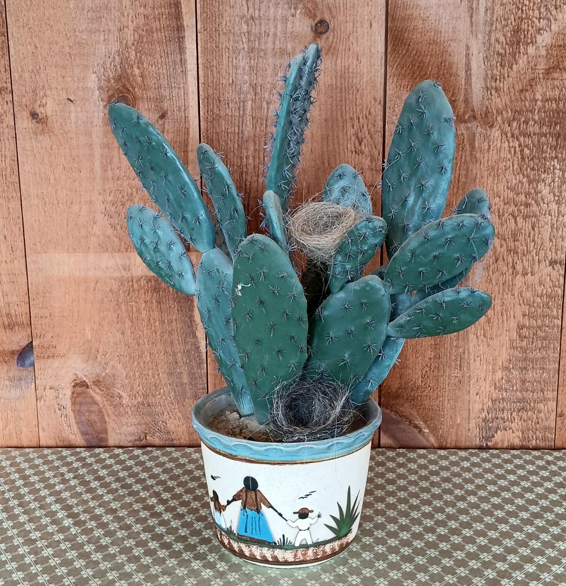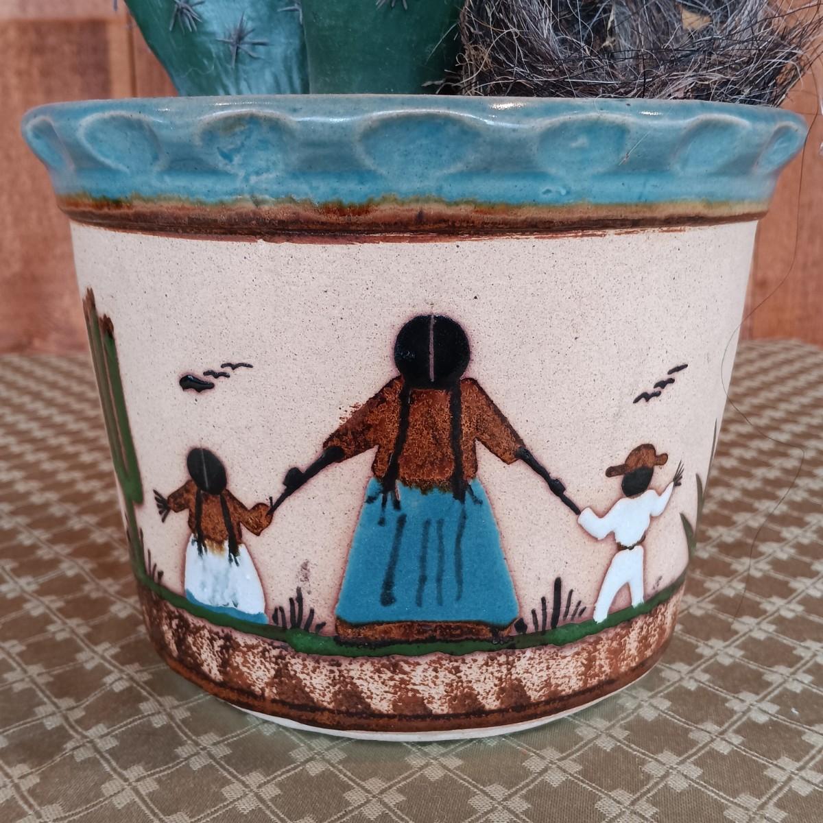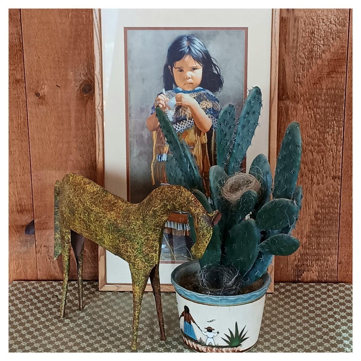 LOT 8K: Ray Swanson 'Little Apache Girl' Needlepointed Print, Speckled Metal Horse & Decorative Cactus in Tohala Pottery