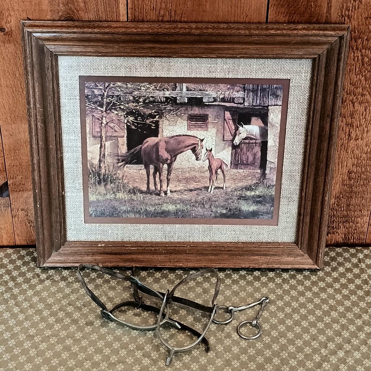 LOT 9K: Horse Print in Frame with Riding Spurs & Snaffle Bit