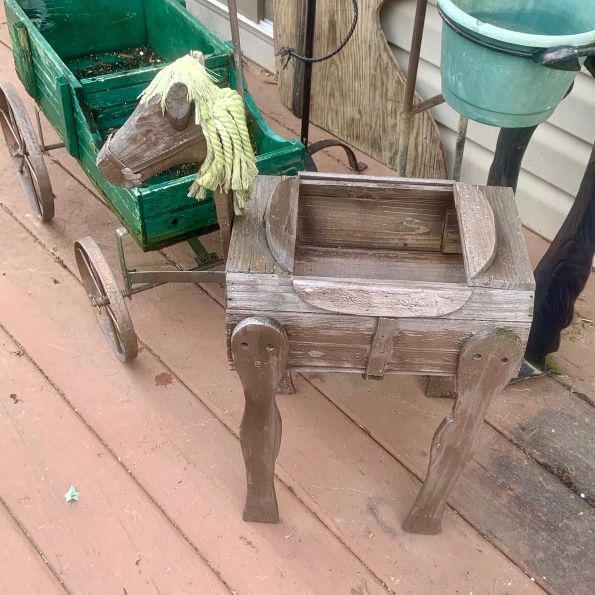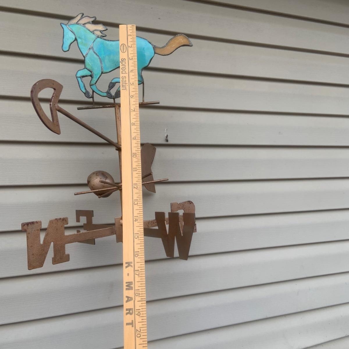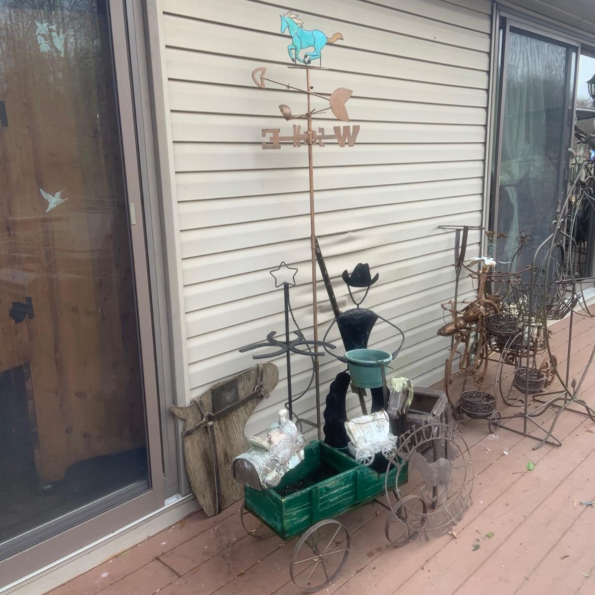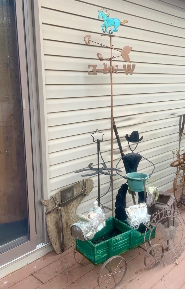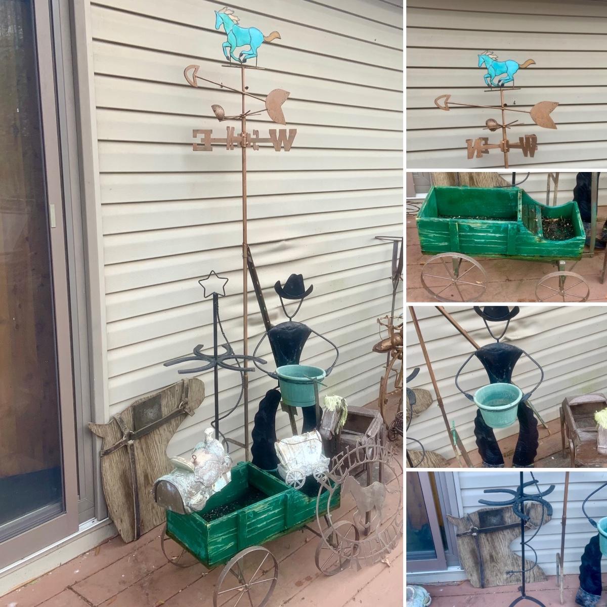 LOT:56G: Rustic Collection of Outdoor Decor Featuring a Stain Glass Horse Weather Vane, Minitue Wood Coach Wagon and Bird House, a Cowboy Plant Holder, Wood Horse Head and More