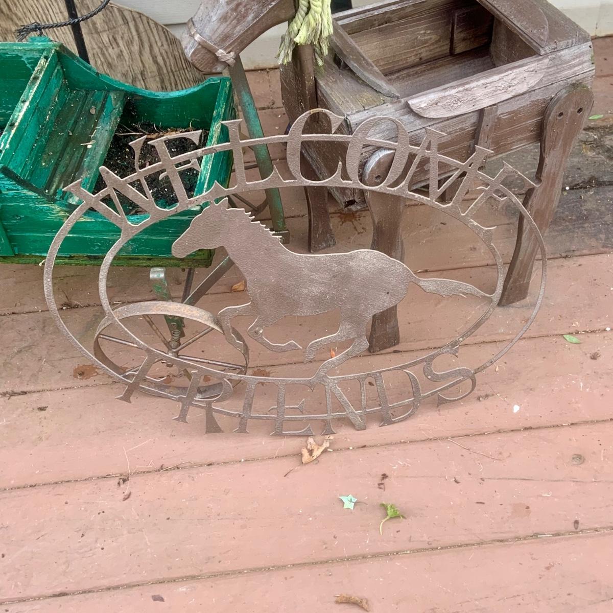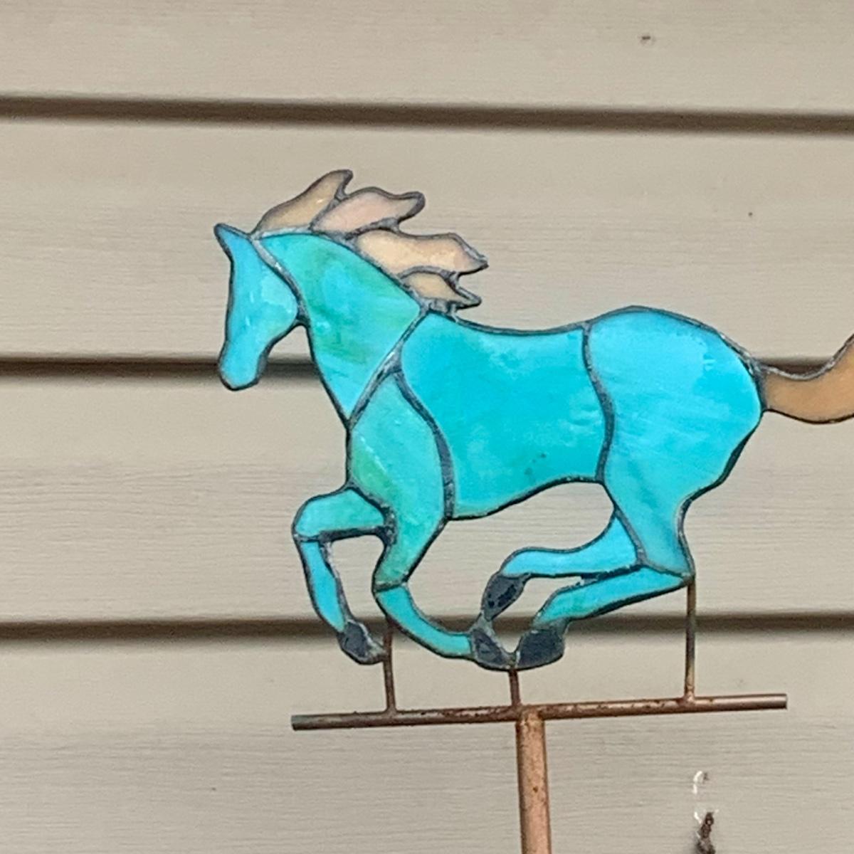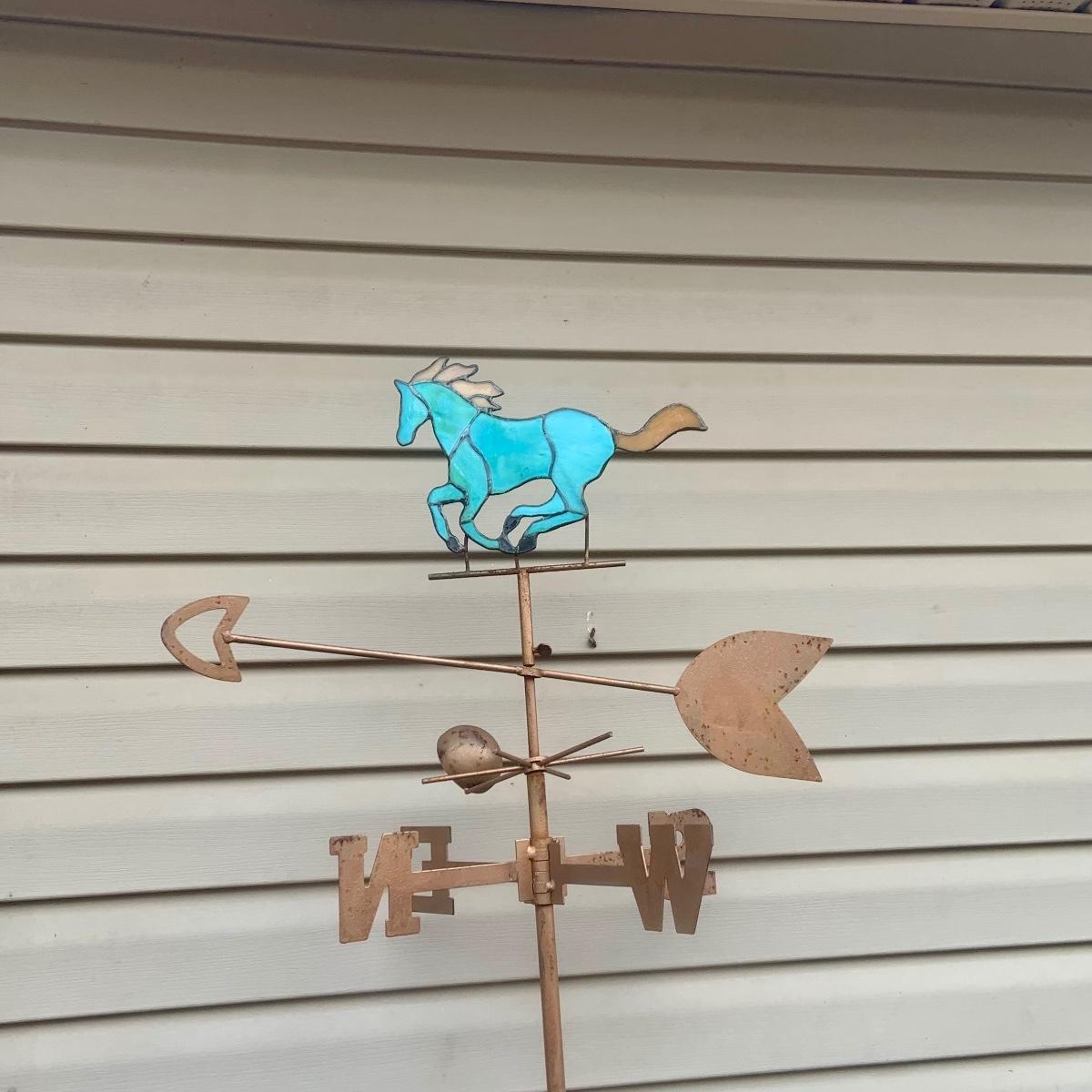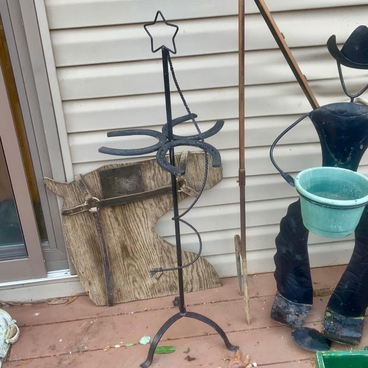 LOT:56G: Rustic Collection of Outdoor Decor Featuring a Stain Glass Horse Weather Vane, Minitue Wood Coach Wagon and Bird House, a Cowboy Plant Holder, Wood Horse Head and More