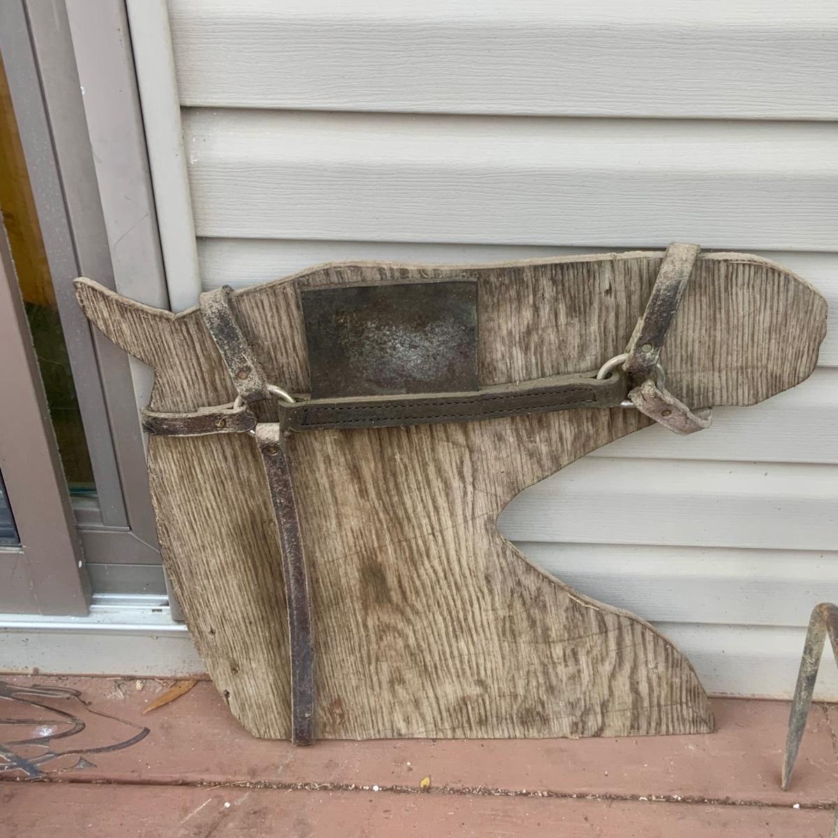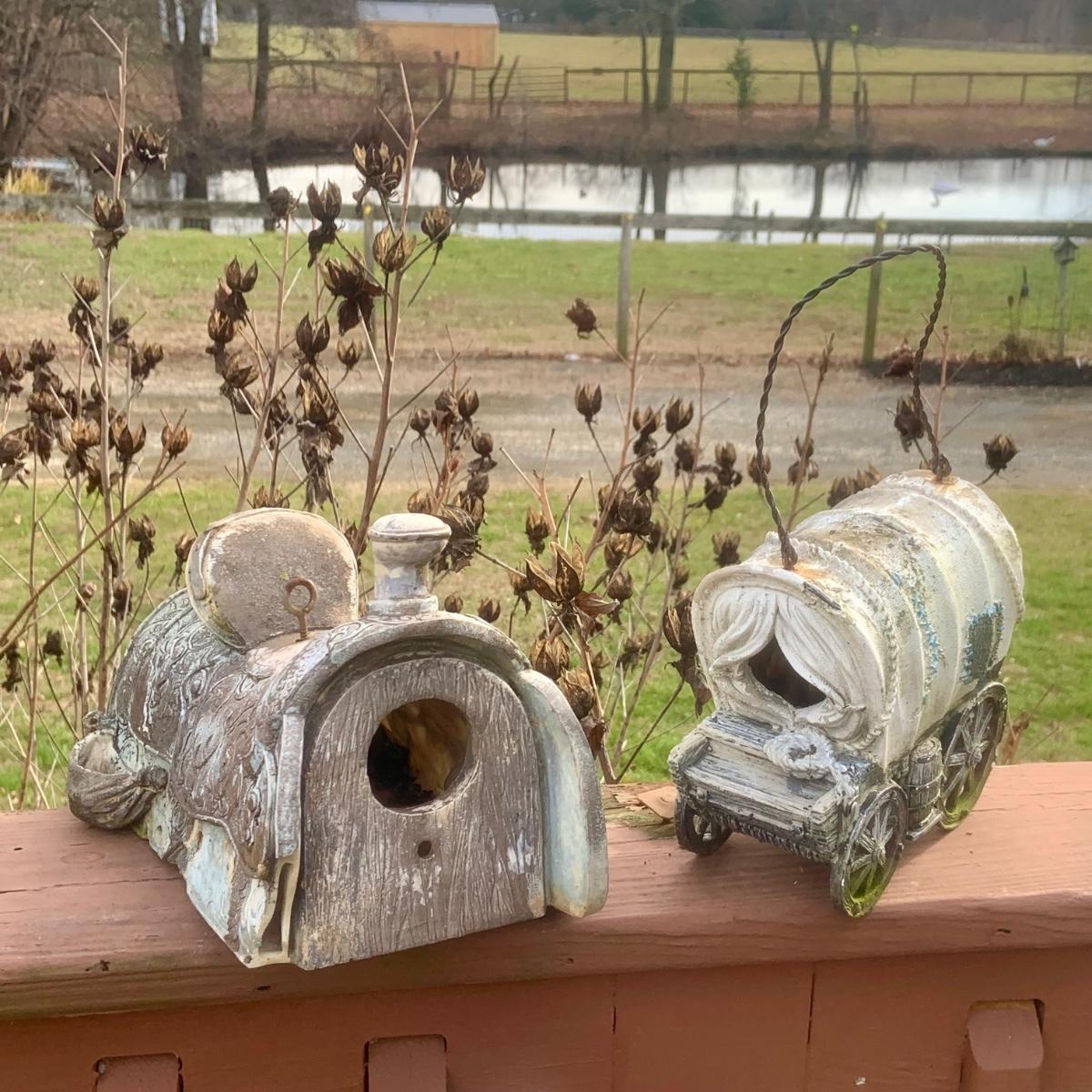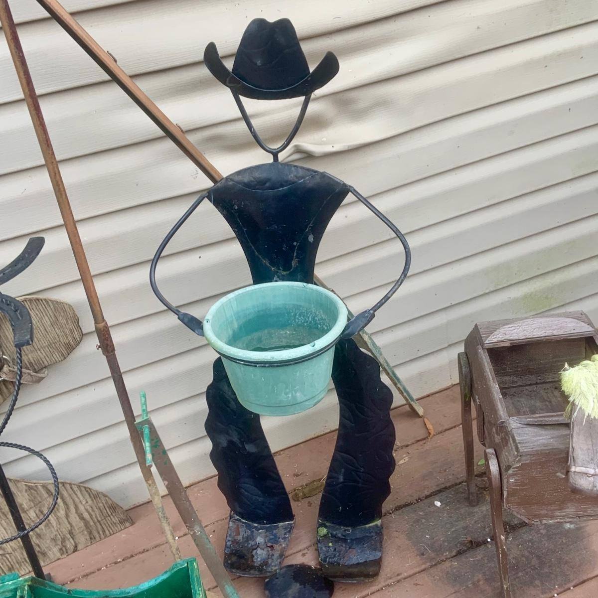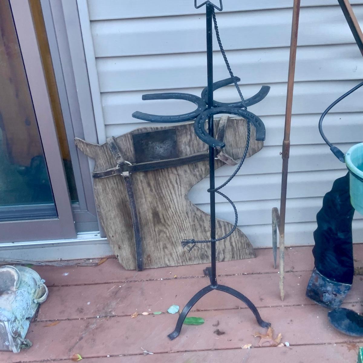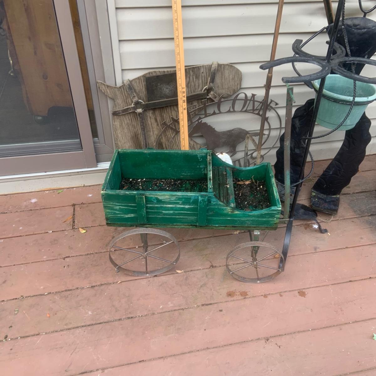 LOT:56G: Rustic Collection of Outdoor Decor Featuring a Stain Glass Horse Weather Vane, Minitue Wood Coach Wagon and Bird House, a Cowboy Plant Holder, Wood Horse Head and More