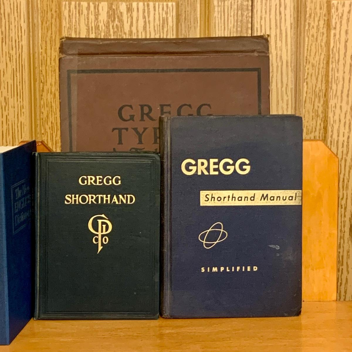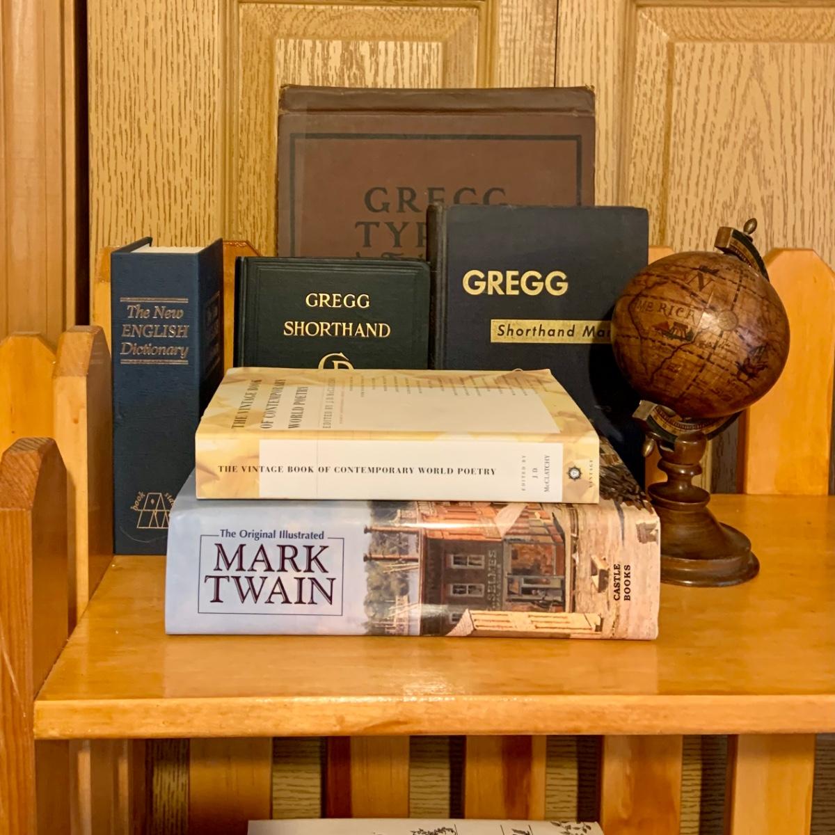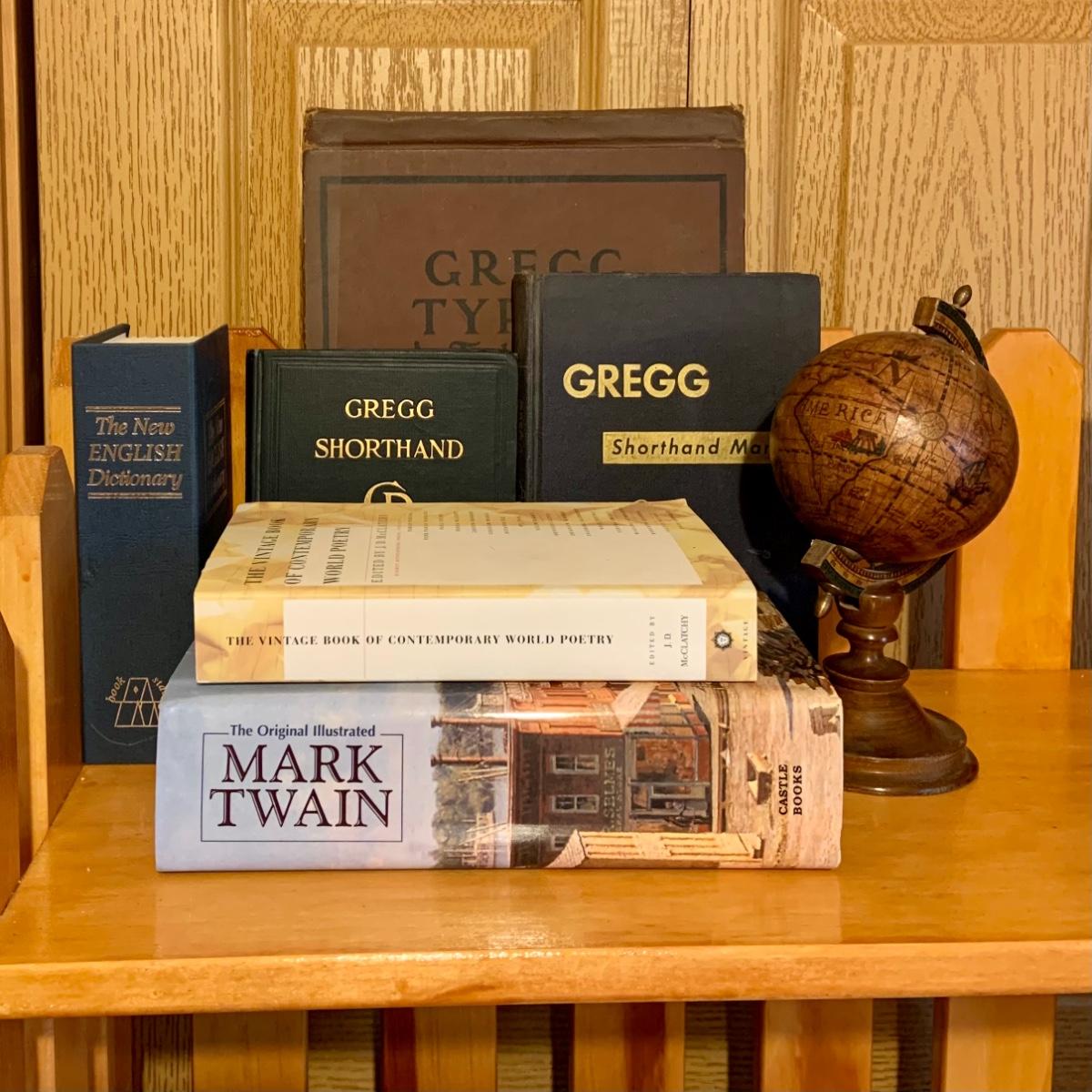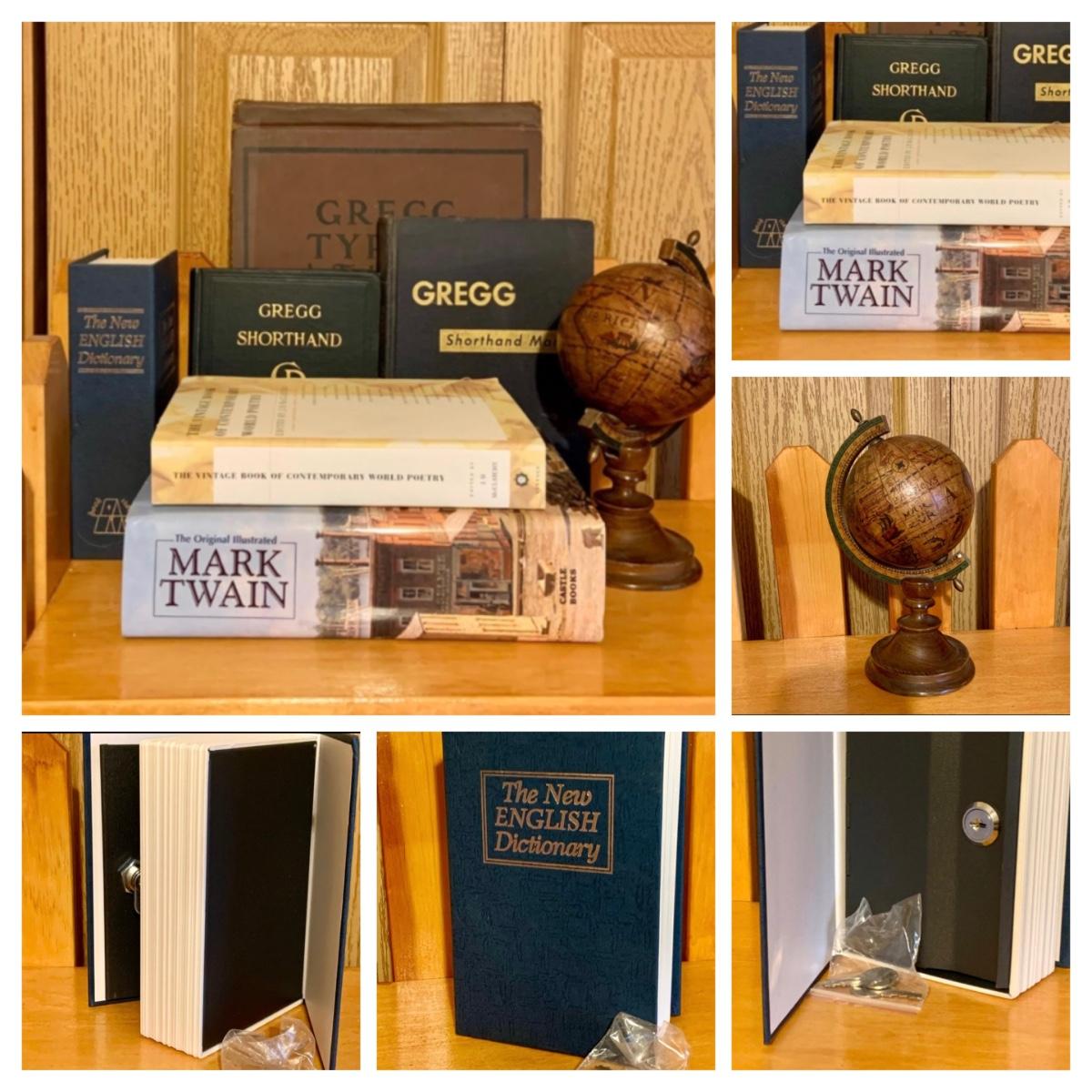 LOT:69G: Office Colletion Featuring Vintage Gregg Secretarial Books on Shorthand and Typing; a Wooden Globe ; a Small Book Safe and Books