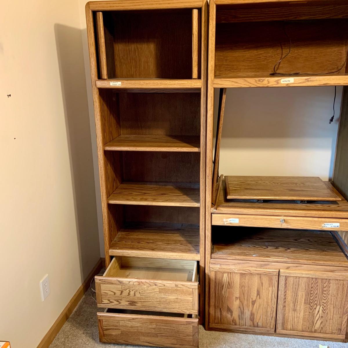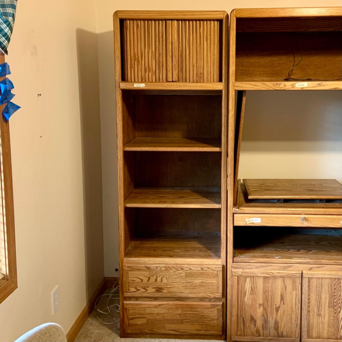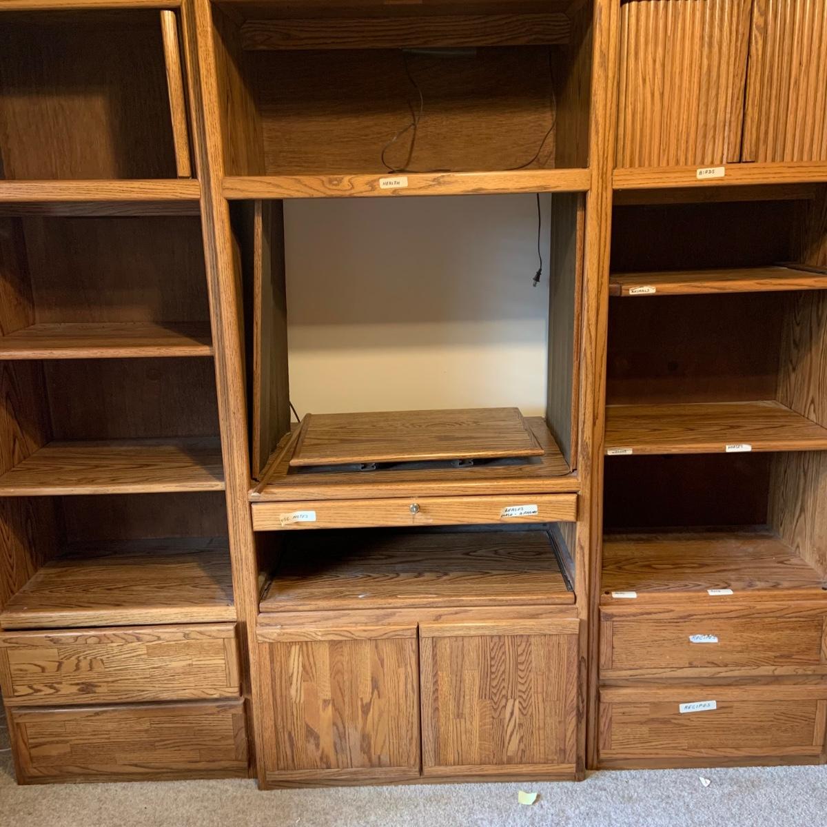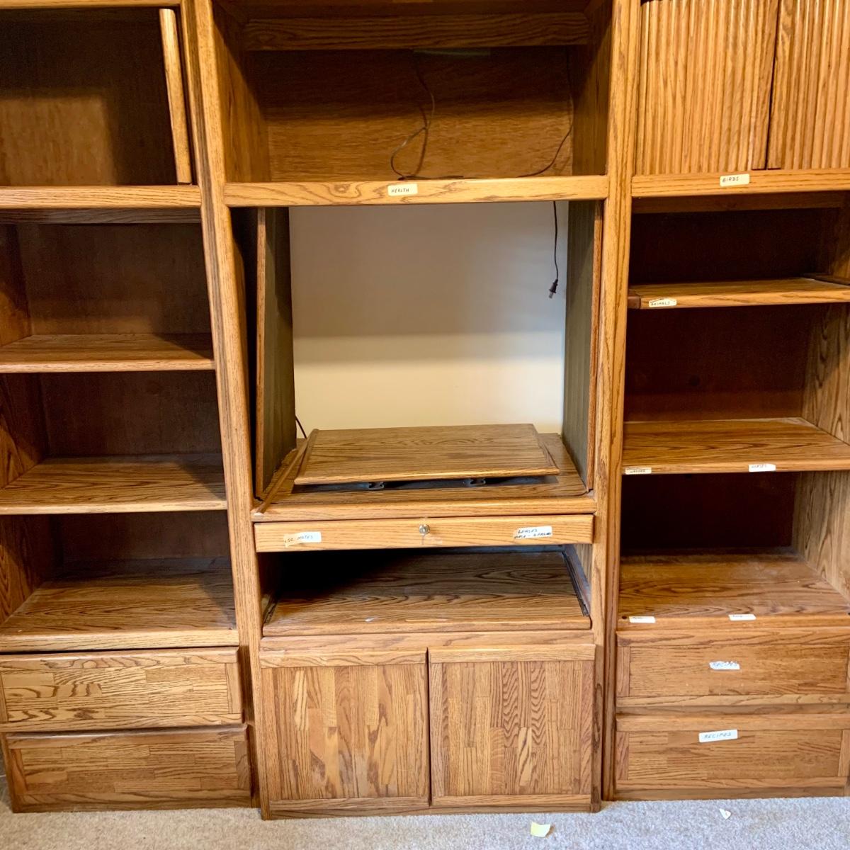 One of sliding doors to the TV stand won't close and needs repair. There are also labels on the shelves that need removed. The 2 shelves with the top sliding doors measure 23 x 18 s 71" each. The TV stand is 32 x 22 x 71" and the corner shelf is 22 x 10 x 71" Please see all pictures as they are the best representation of the items. The pictures show condition, measurements if taken, and what is included in the lot. Due to the large amount that we photograph and the time frame, we are not always able to take measurements. All items unless noted, are pre-owned and have been used. If you purchased furniture, you must bring help. We do not allow one person to carry large furniture out on their own. Bring help, tools and a truck for the safety of our client’s homes, and your personal safety. Any damages that result to the property including walls, and floors due to moving of the furniture will be charged to the buyer. Company policy. Thank you.
