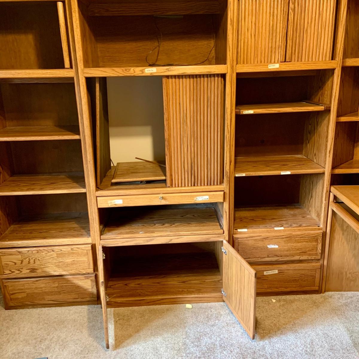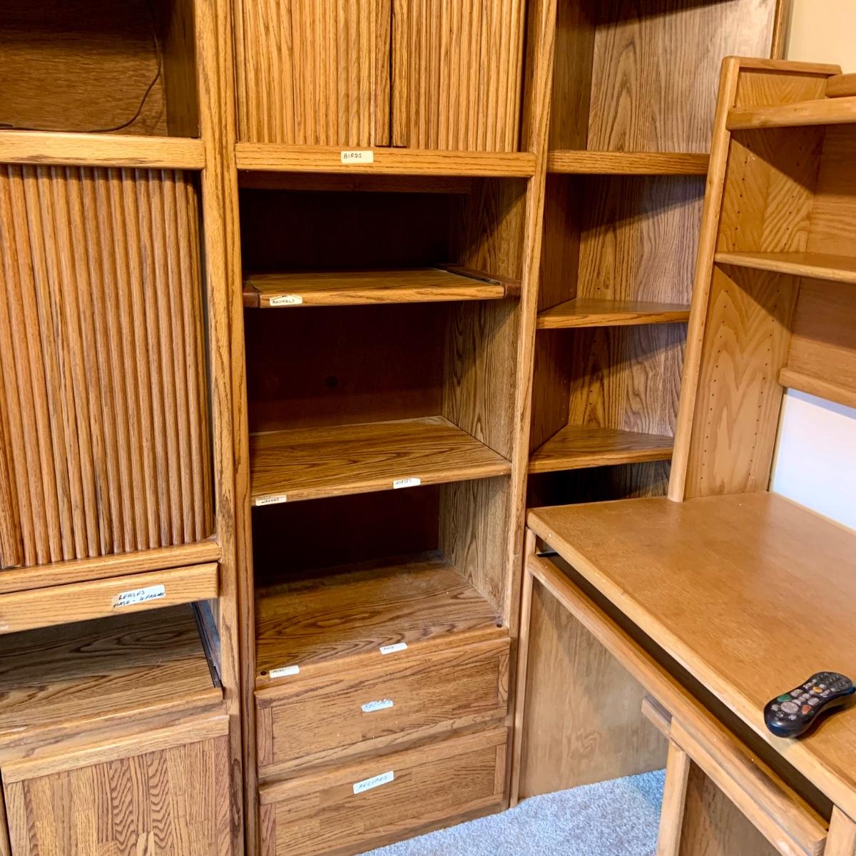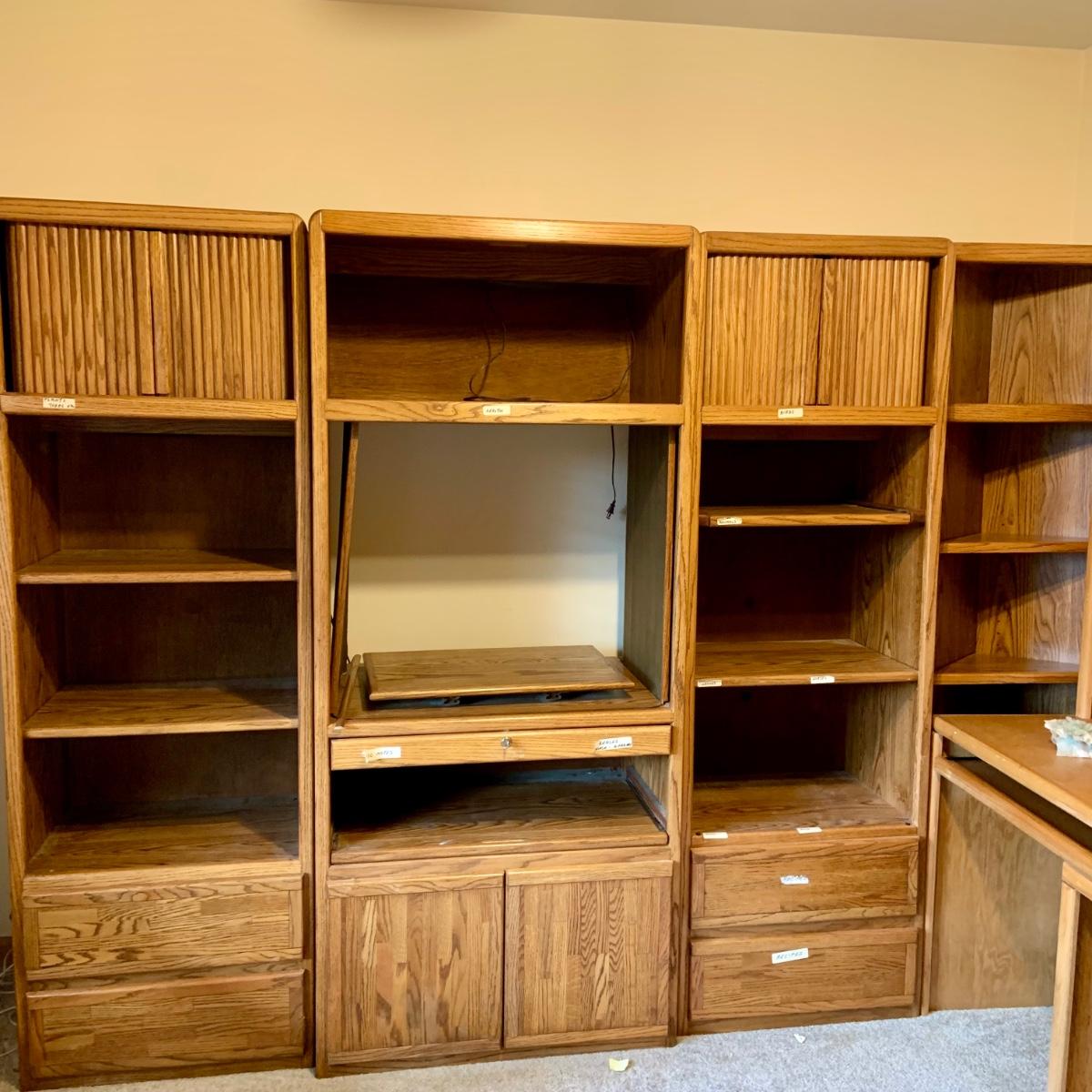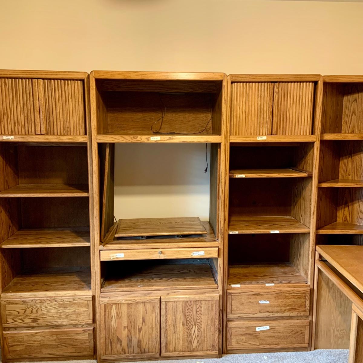 One of sliding doors to the TV stand won't close and needs repair. There are also labels on the shelves that need removed. The 2 shelves with the top sliding doors measure 23 x 18 s 71" each. The TV stand is 32 x 22 x 71" and the corner shelf is 22 x 10 x 71" Please see all pictures as they are the best representation of the items. The pictures show condition, measurements if taken, and what is included in the lot. Due to the large amount that we photograph and the time frame, we are not always able to take measurements. All items unless noted, are pre-owned and have been used. If you purchased furniture, you must bring help. We do not allow one person to carry large furniture out on their own. Bring help, tools and a truck for the safety of our client’s homes, and your personal safety. Any damages that result to the property including walls, and floors due to moving of the furniture will be charged to the buyer. Company policy. Thank you.