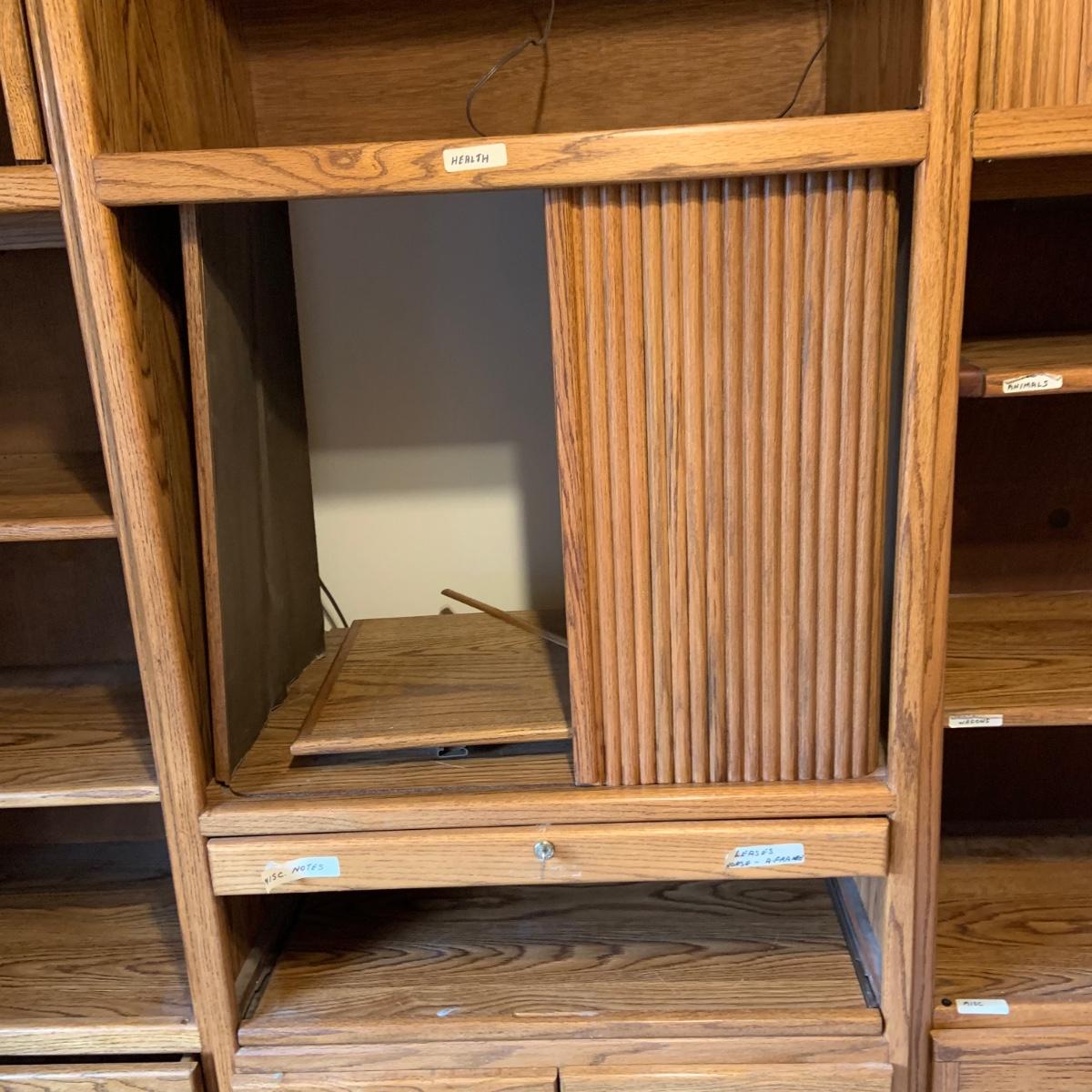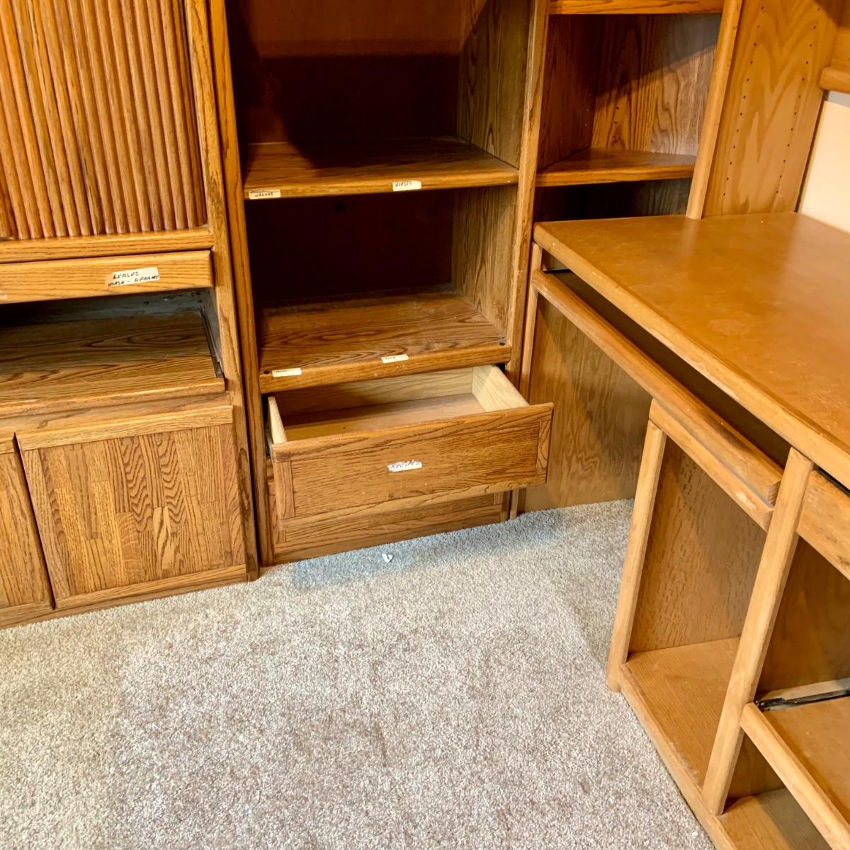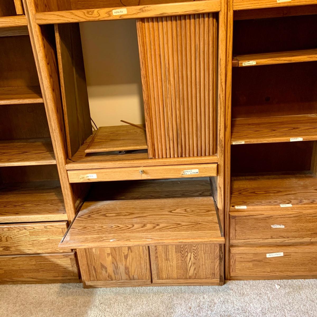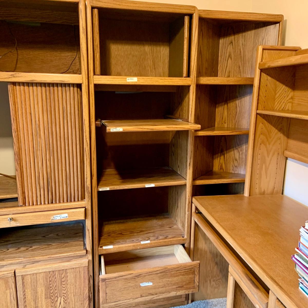 One of sliding doors to the TV stand won't close and needs repair. There are also labels on the shelves that need removed. The 2 shelves with the top sliding doors measure 23 x 18 s 71" each. The TV stand is 32 x 22 x 71" and the corner shelf is 22 x 10 x 71" Please see all pictures as they are the best representation of the items. The pictures show condition, measurements if taken, and what is included in the lot. Due to the large amount that we photograph and the time frame, we are not always able to take measurements. All items unless noted, are pre-owned and have been used. If you purchased furniture, you must bring help. We do not allow one person to carry large furniture out on their own. Bring help, tools and a truck for the safety of our client’s homes, and your personal safety. Any damages that result to the property including walls, and floors due to moving of the furniture will be charged to the buyer. Company policy. Thank you.