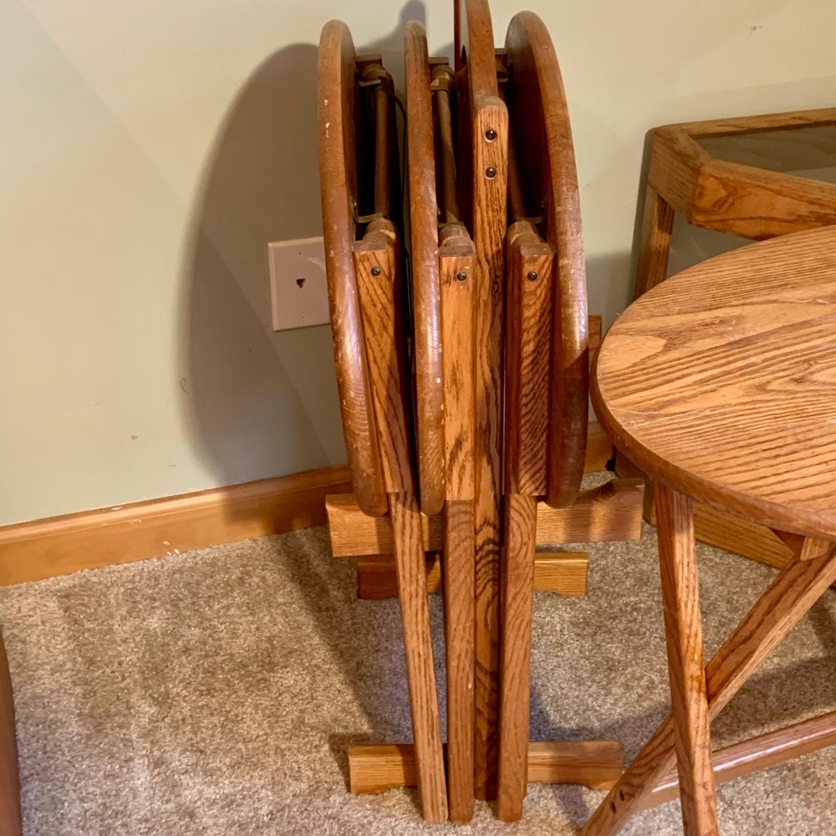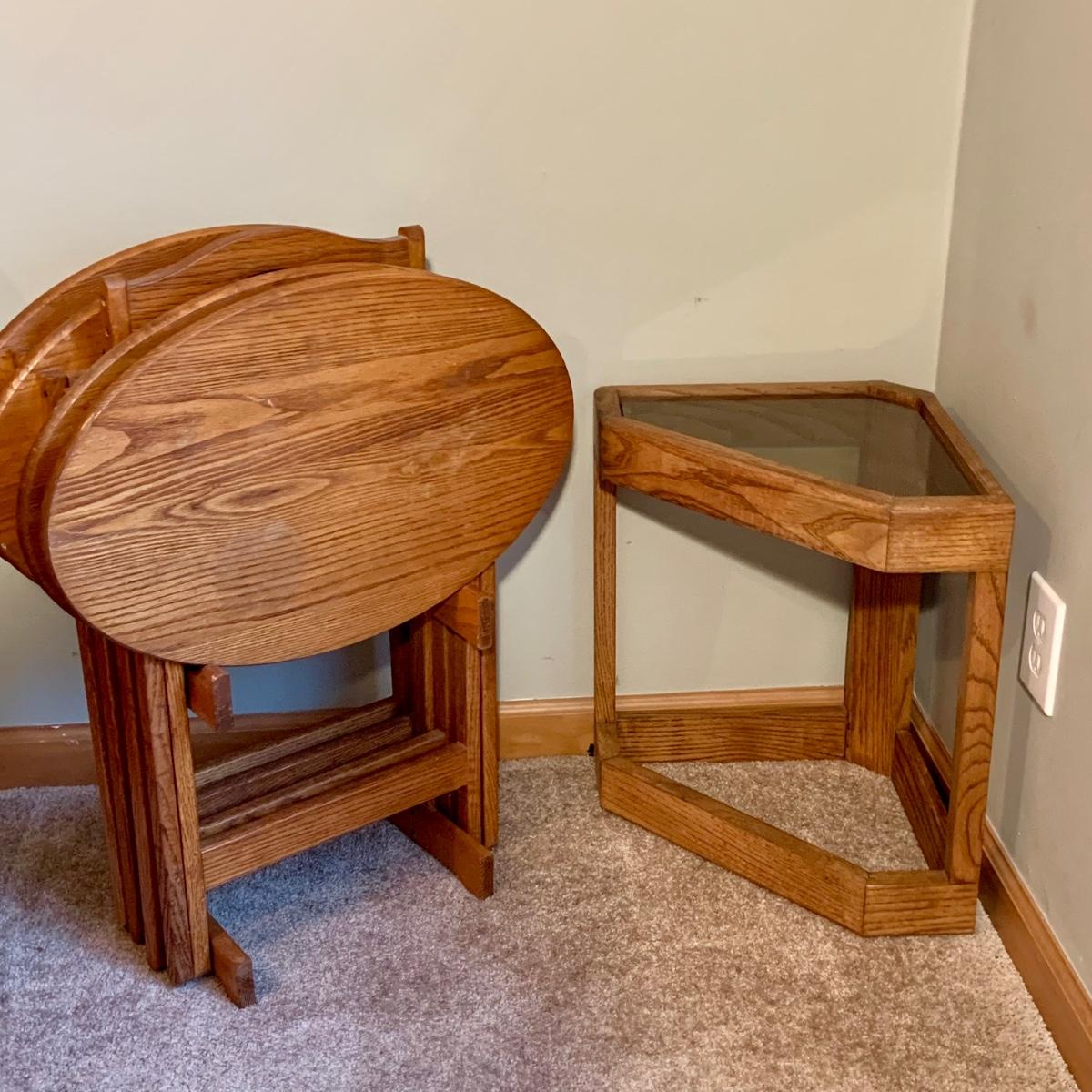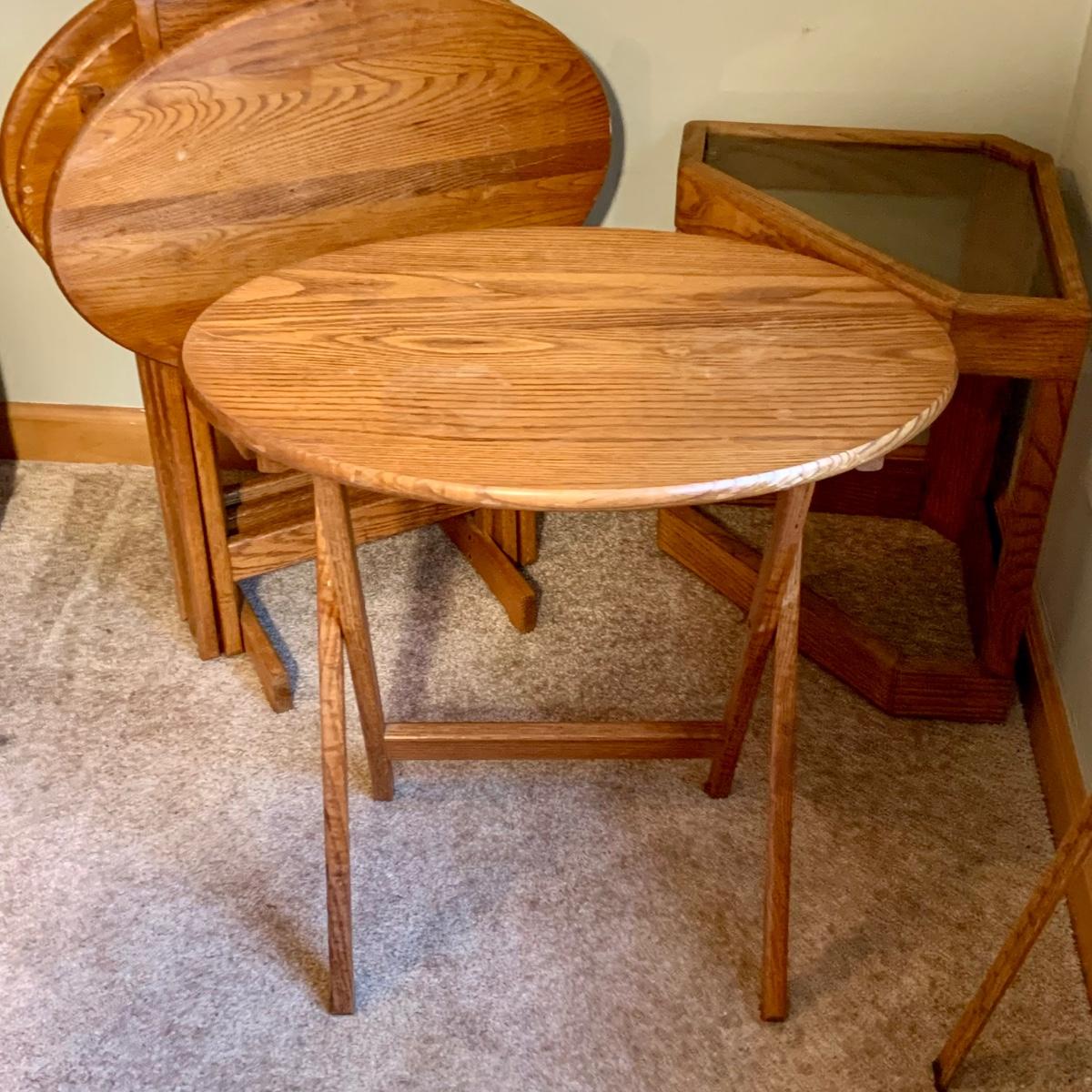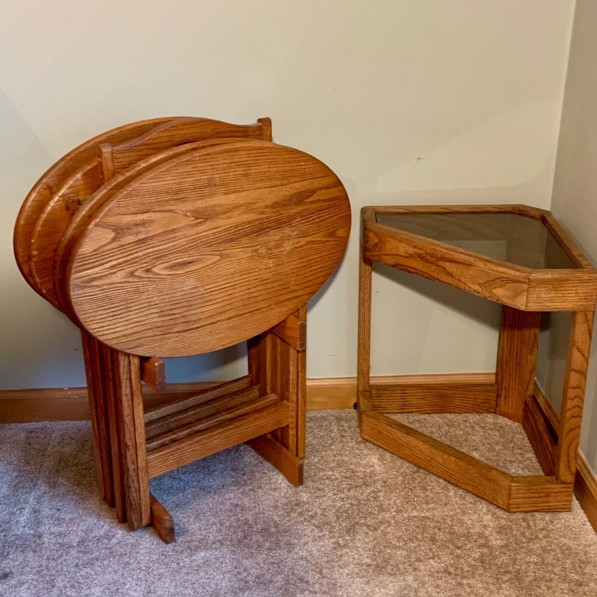 LOT:76G: Vintage Set of 4 Wooden Oval Folding Snack Tables and Glass and Wood Corner Table