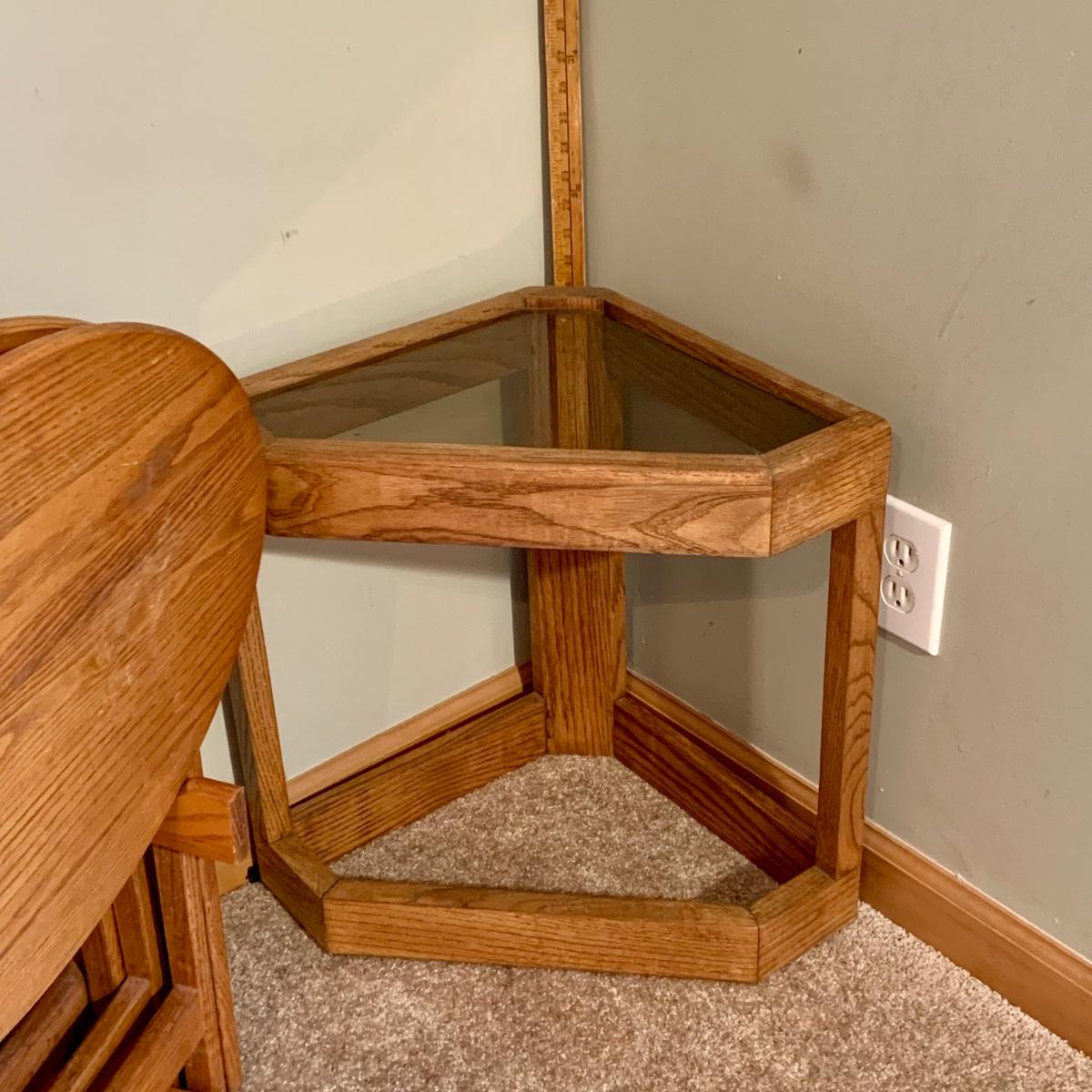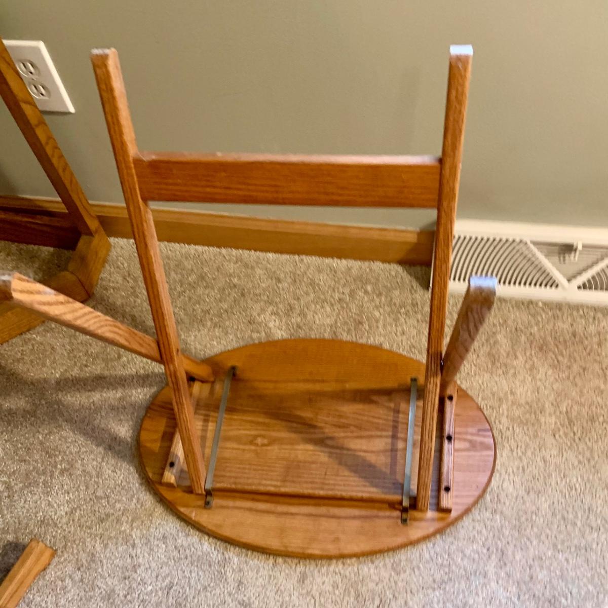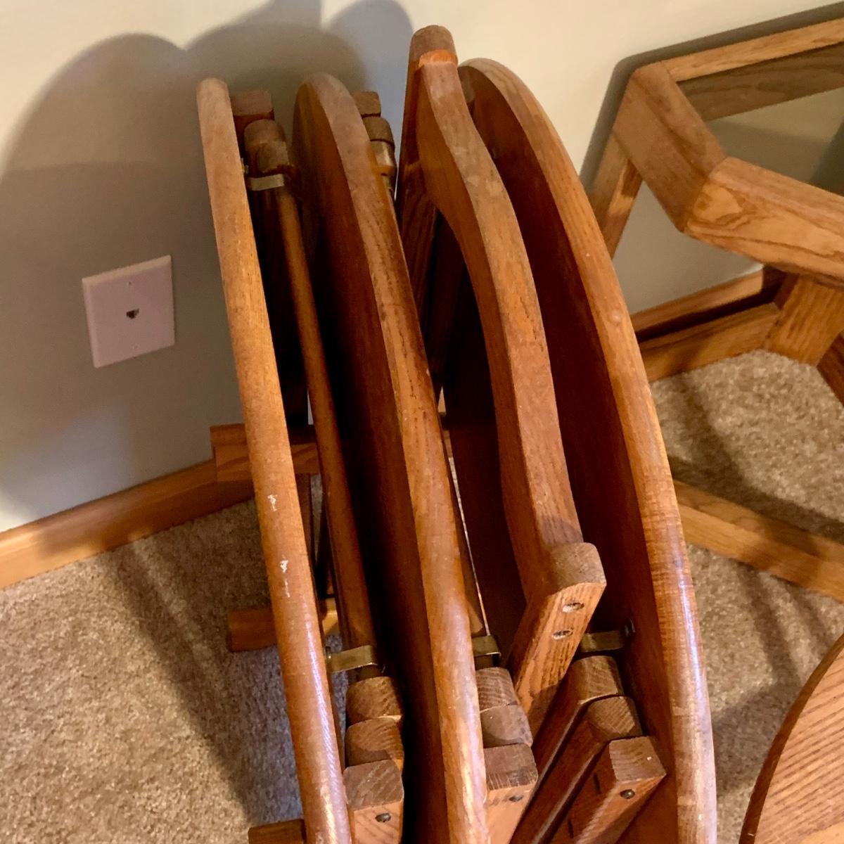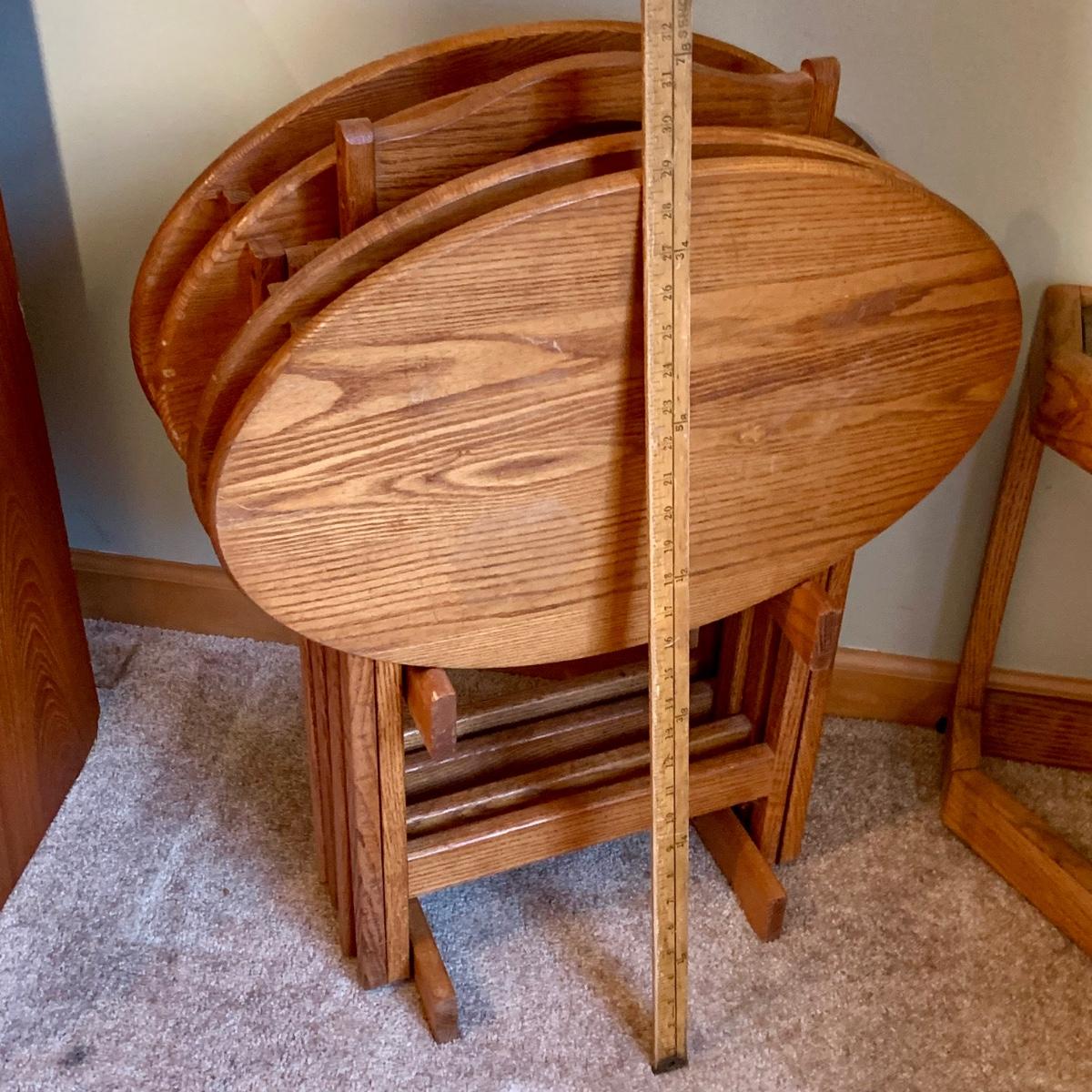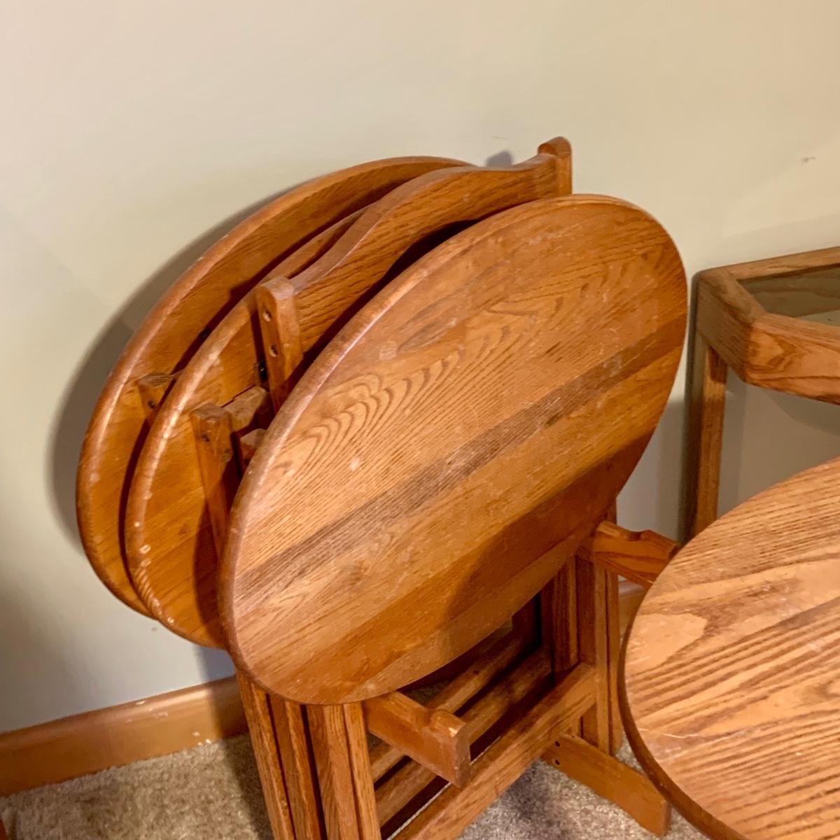 LOT:76G: Vintage Set of 4 Wooden Oval Folding Snack Tables and Glass and Wood Corner Table