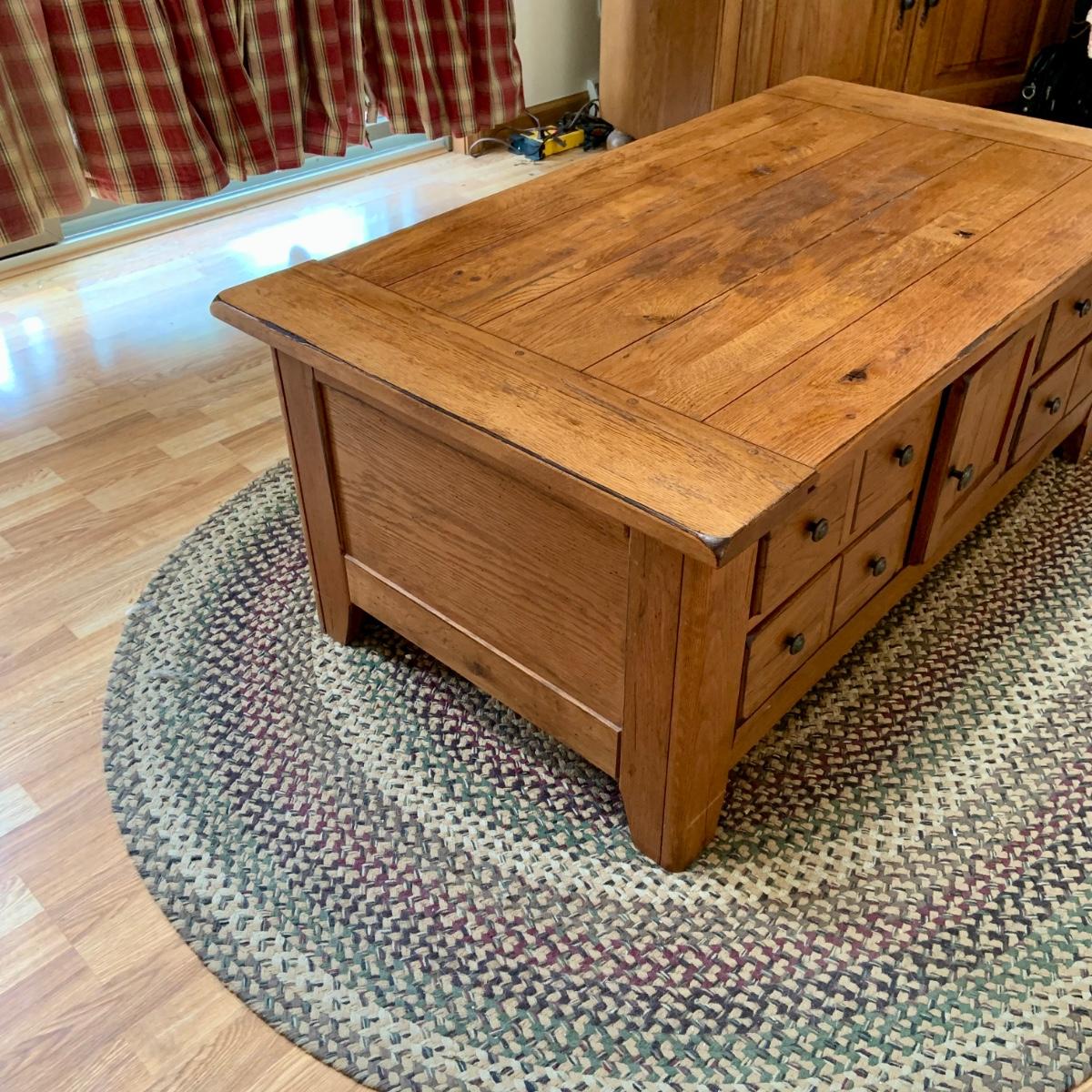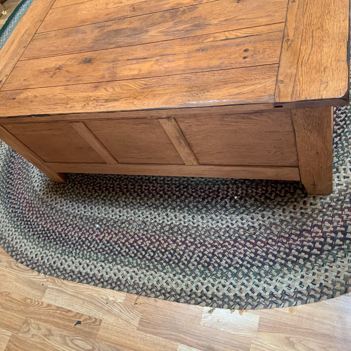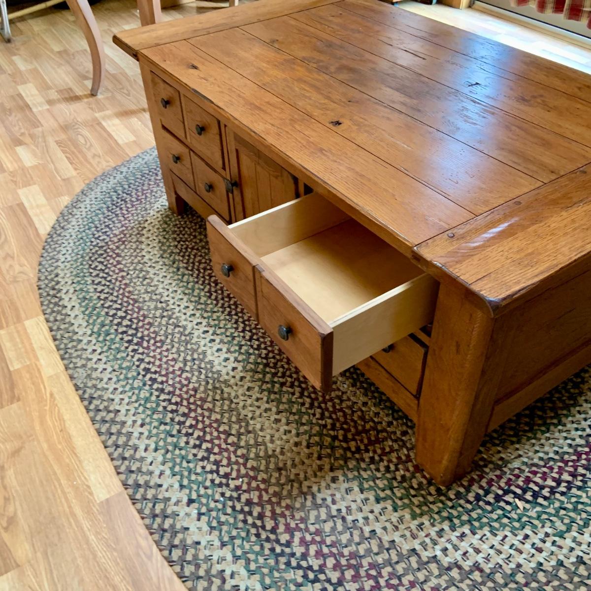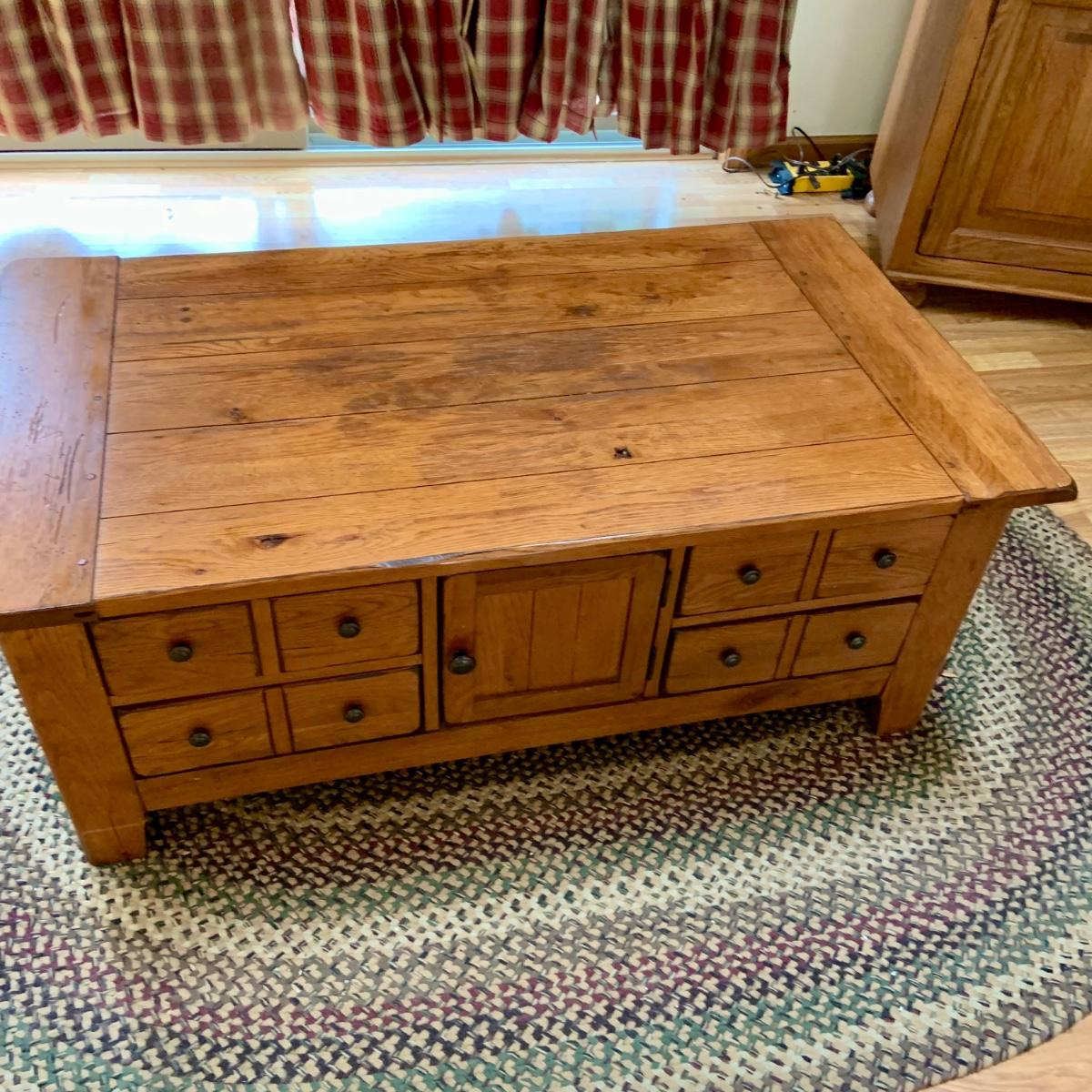 The table is approx 50 x28 x 20" and the rug is 83 x 60". Please see all pictures as they are the best representation of the items. The pictures show condition, measurements if taken, and what is included in the lot. Due to the large amount that we photograph and the time frame, we are not always able to take measurements. All items unless noted, are pre-owned and have been used. If you purchased furniture, you must bring help. We do not allow one person to carry large furniture out on their own. Bring help, tools and a truck for the safety of our client’s homes, and your personal safety. Any damages that result to the property including walls, and floors due to moving of the furniture will be charged to the buyer. Company policy. Thank you.