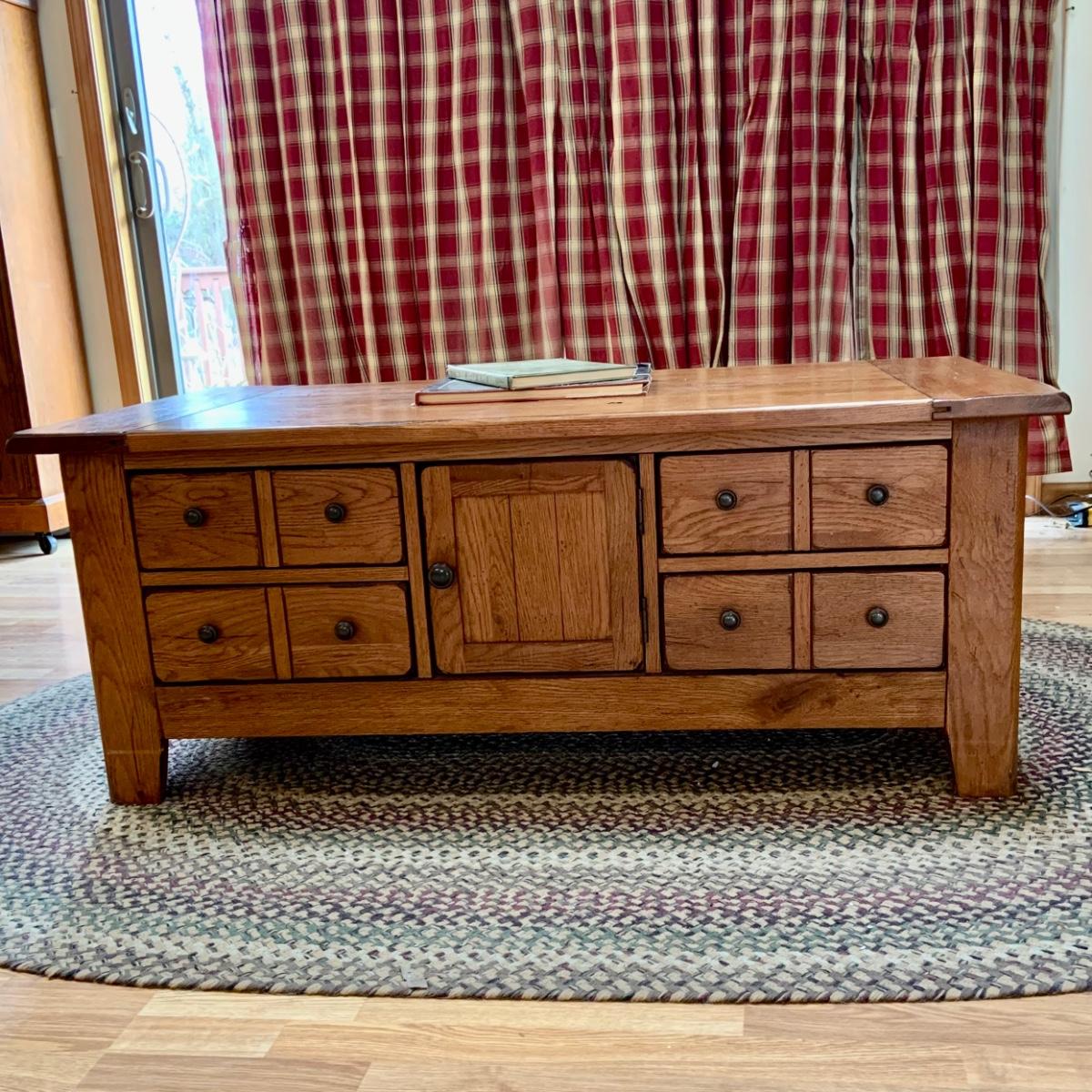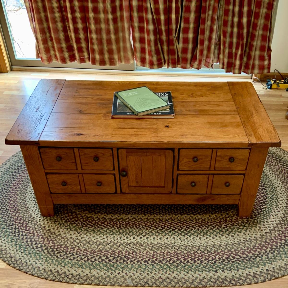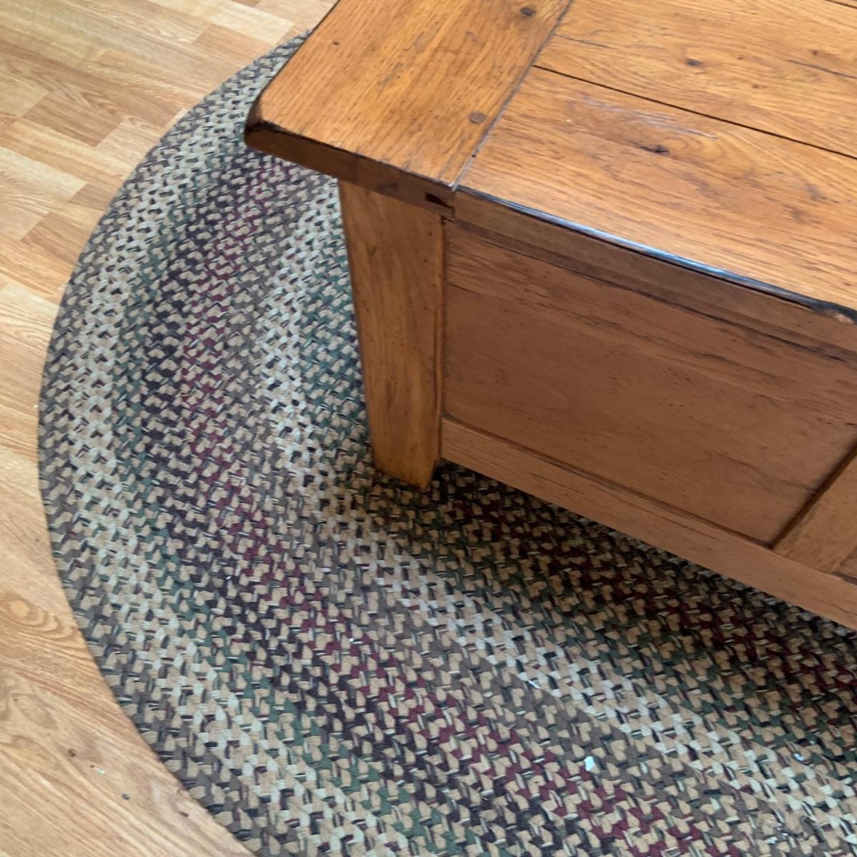 LOT:81G: Broyhill Attic Heloom Collection Coffee Table with Log Cabin Coffee Table Books and Vintage Braided Area Rug