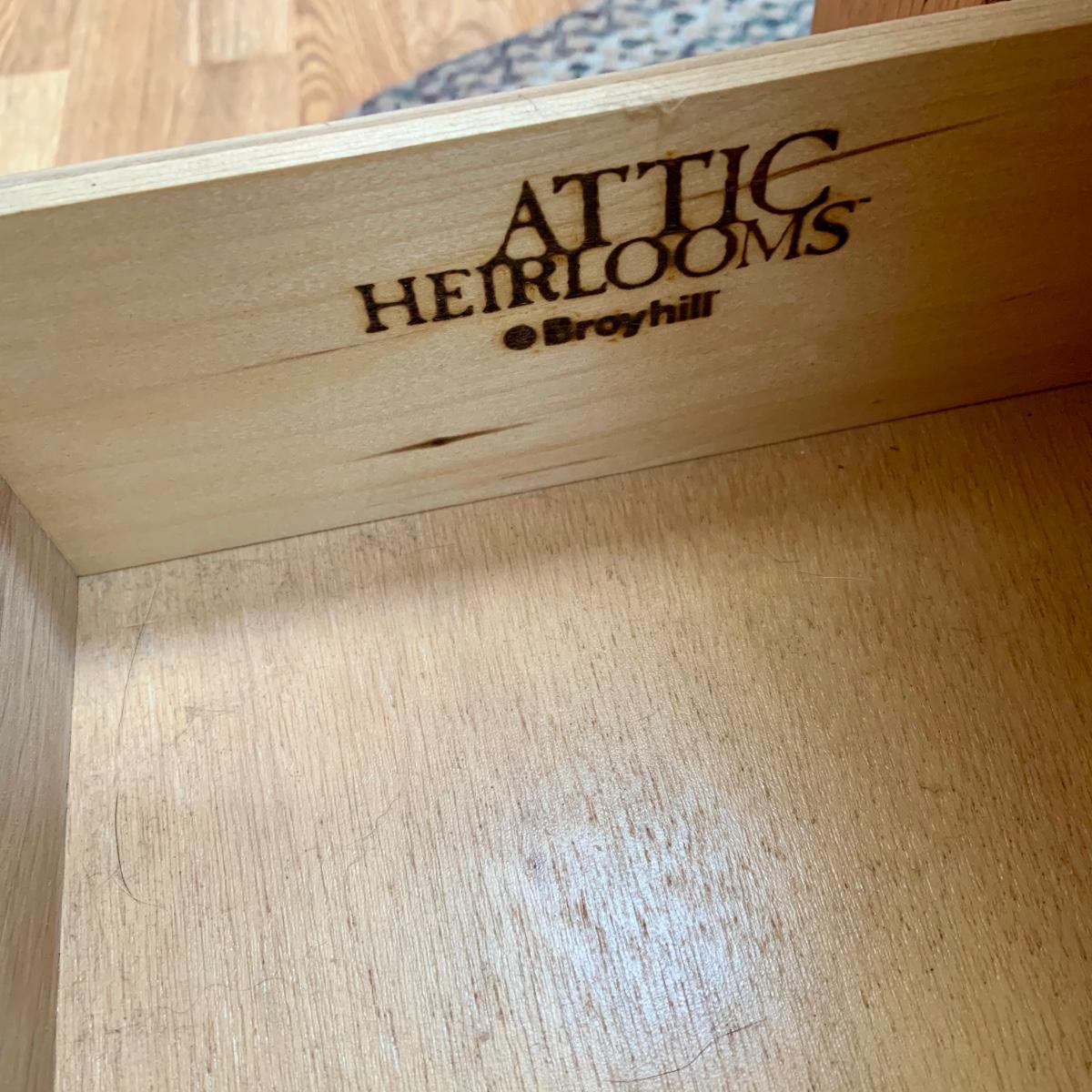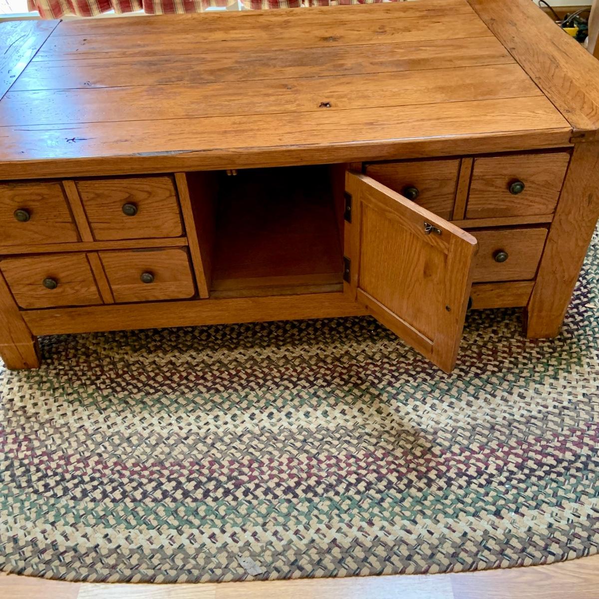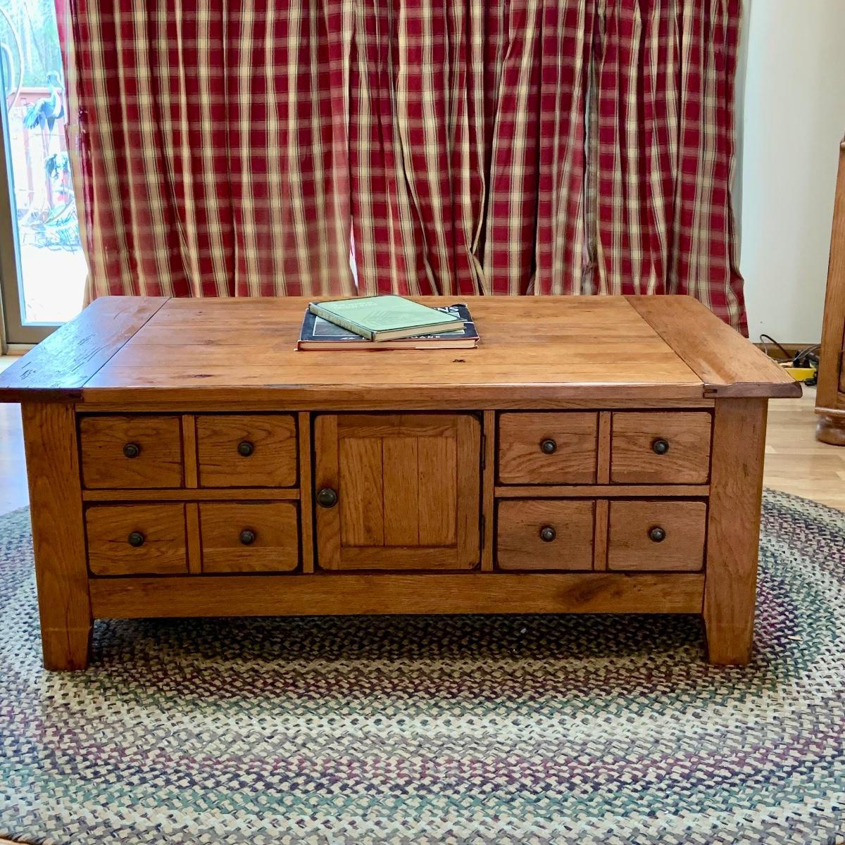 LOT:81G: Broyhill Attic Heloom Collection Coffee Table with Log Cabin Coffee Table Books and Vintage Braided Area Rug