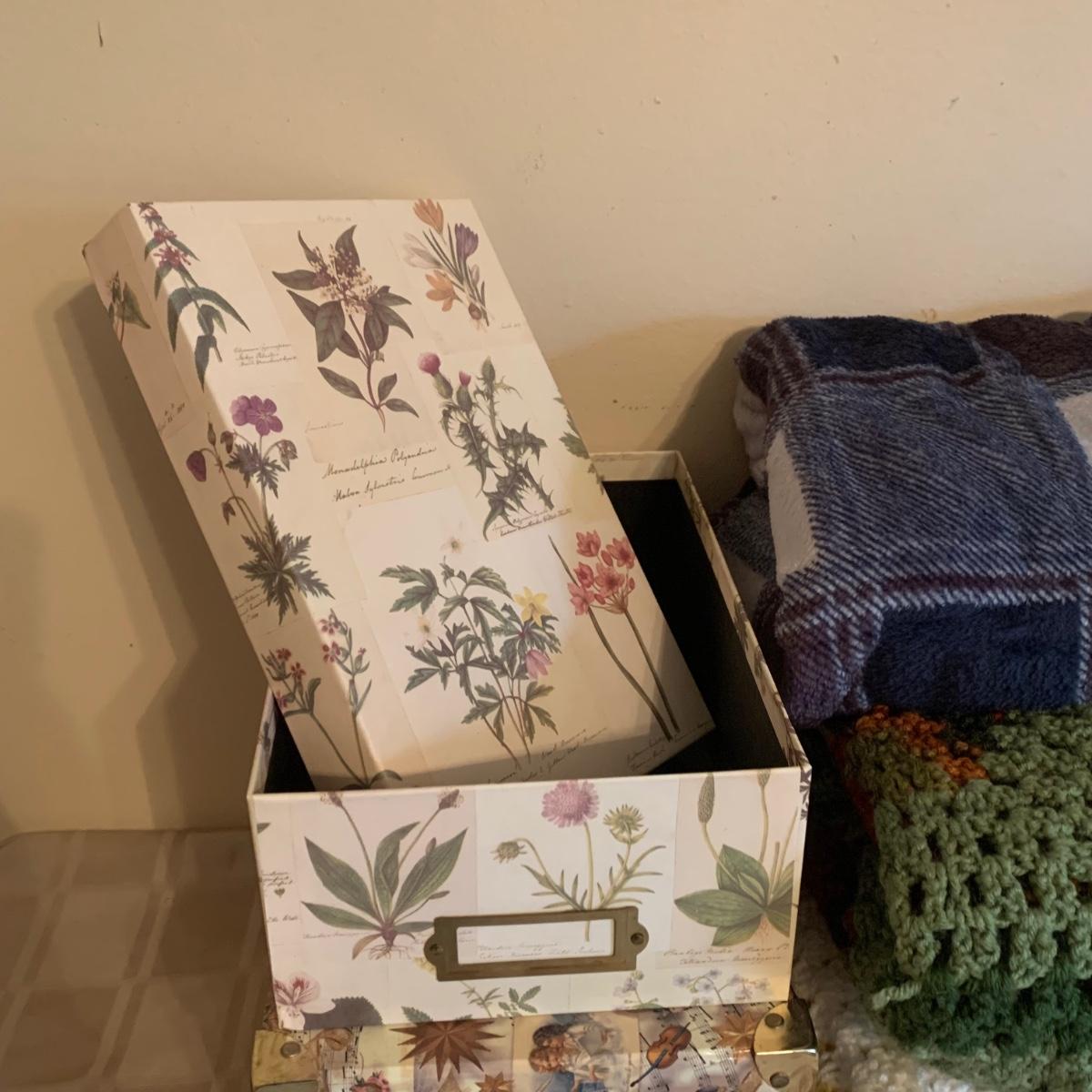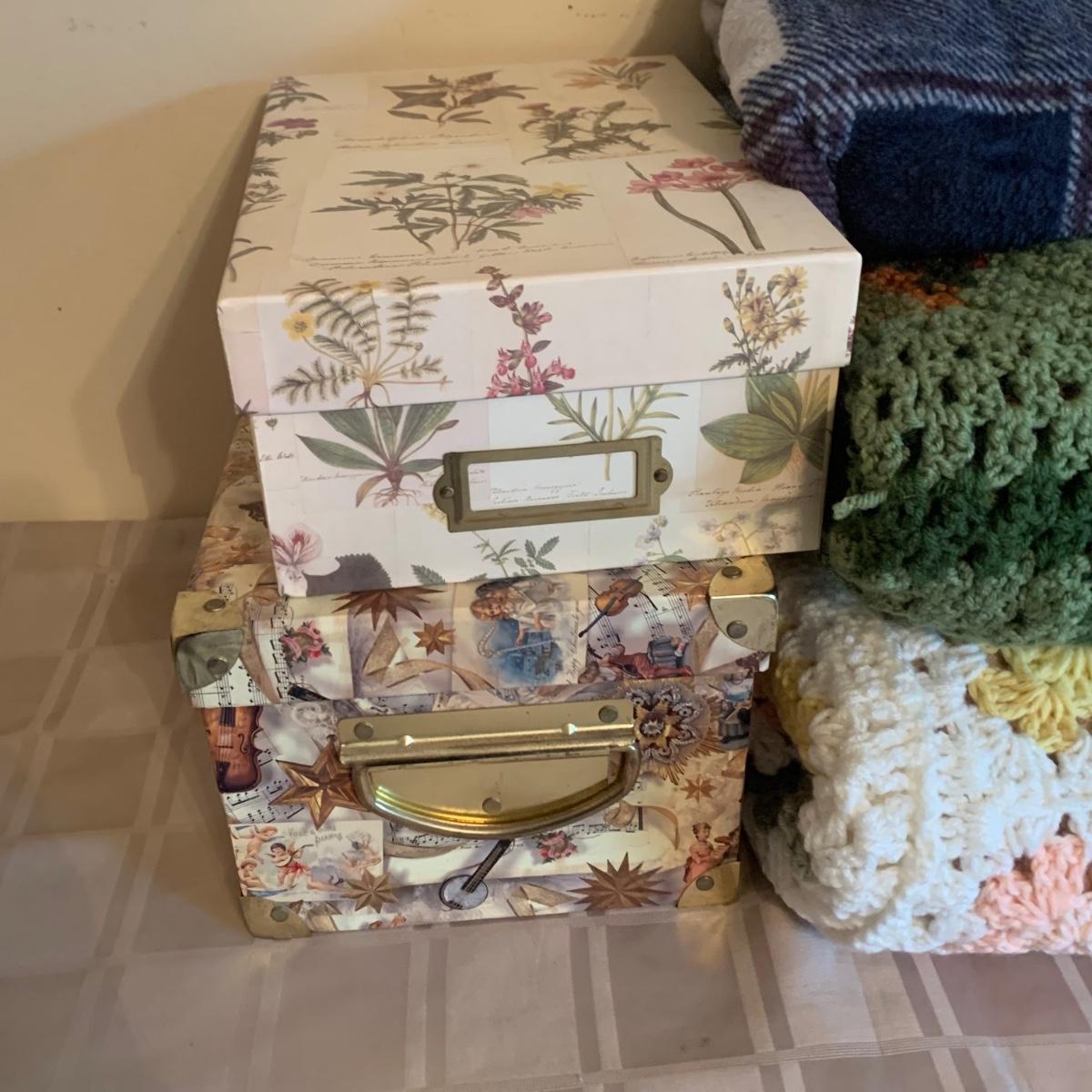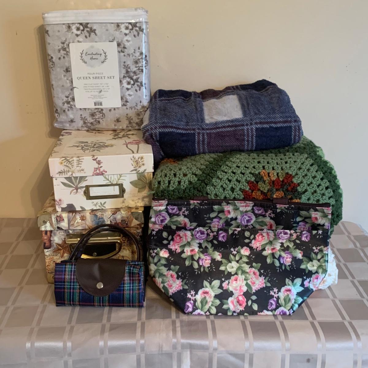 LOT 174R: Crocheted Lap Afghans, NIP Queen Size Sheet Set, Storage Boxes & More