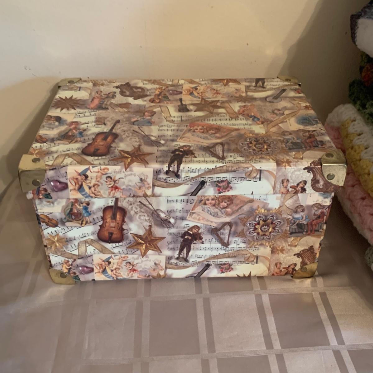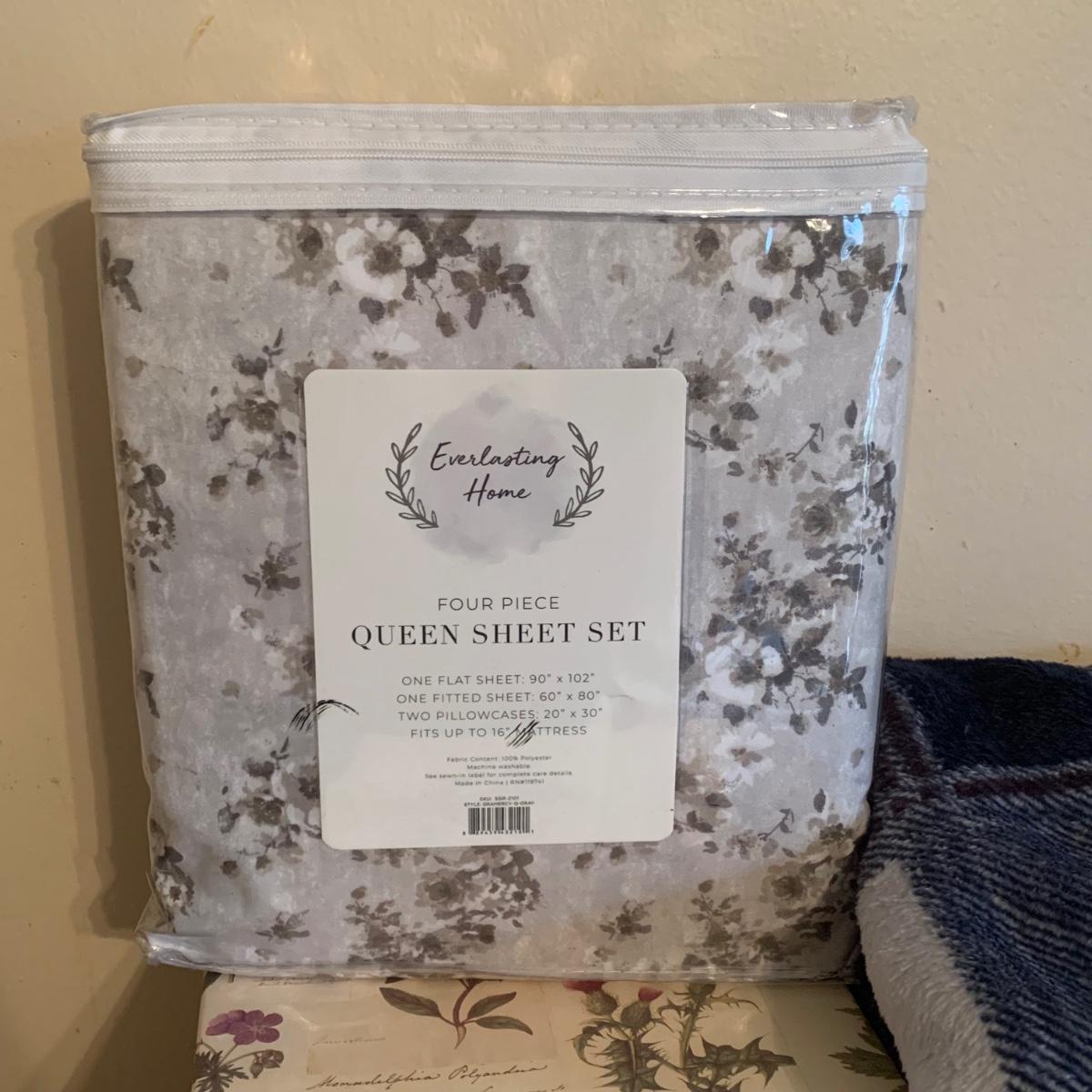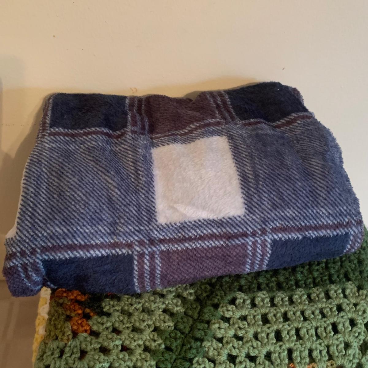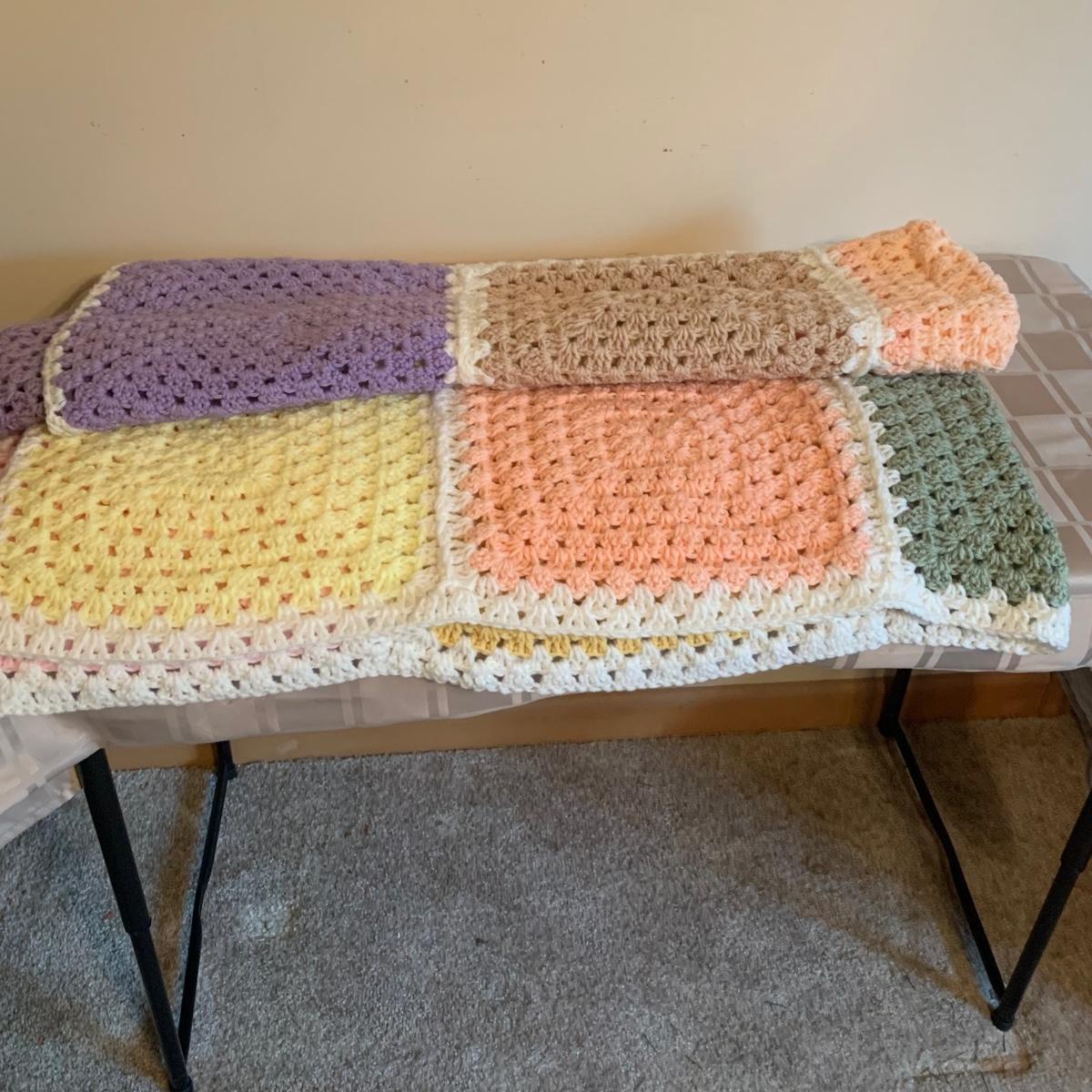 LOT 174R: Crocheted Lap Afghans, NIP Queen Size Sheet Set, Storage Boxes & More