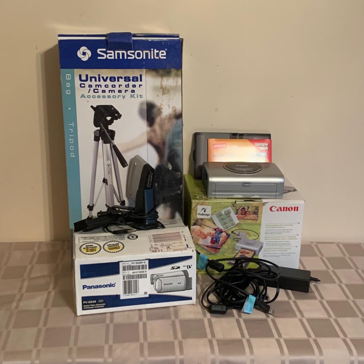 LOT 175R: Canon Photo Printer CP-200, Panasonic PV-GS39 Digital Camcorder (NIP) Samsonite TriPod