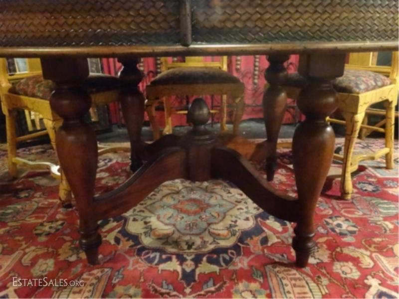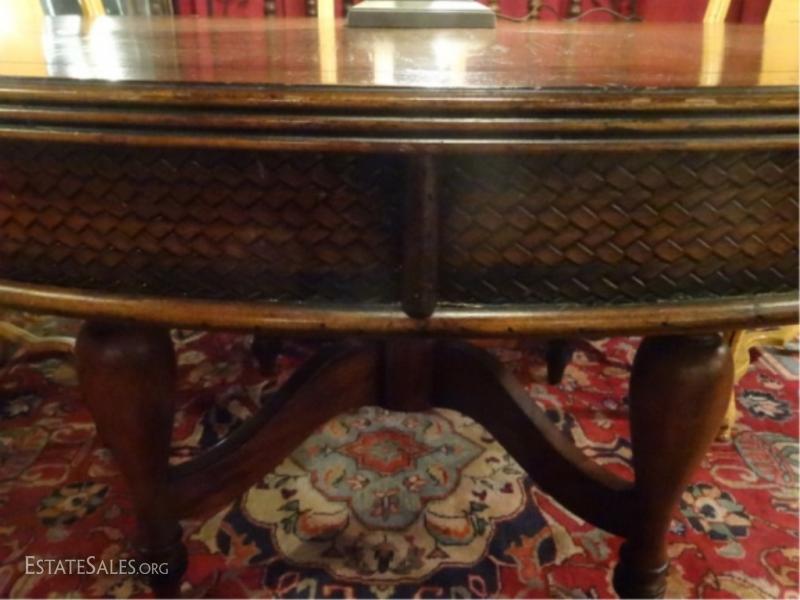 LOT 96B: ROUND TOMMY BAHAMA STYLE DINING TABLE, TEXTURED RATTAN STYLE ACCENT ON APRON, CHAIRS SHOWN IN 1 PHOTO NOT INCLUDED WITH LOT, VERY GOOD GENTLY USED CONDITION, APPROX 60" ROUND X 30"H, SKU130.01