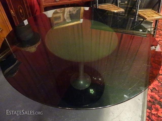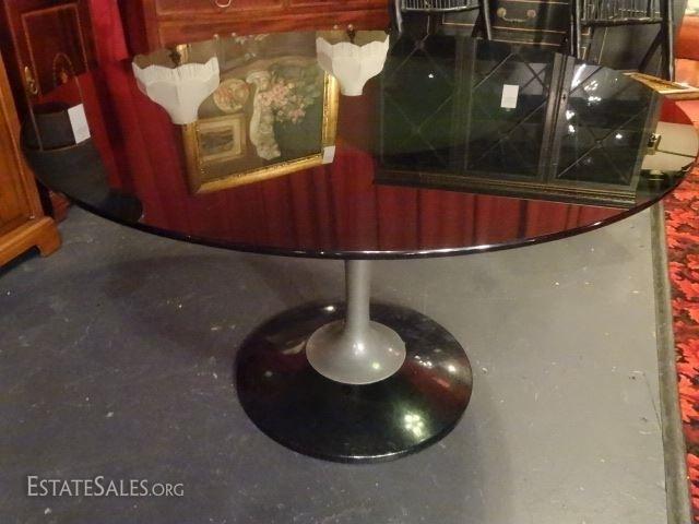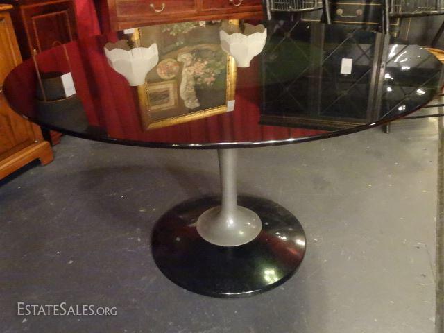 LOT 96E: MID CENTURY BLACK GLASS DINING TABLE, TULIP BASE