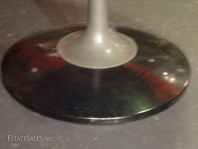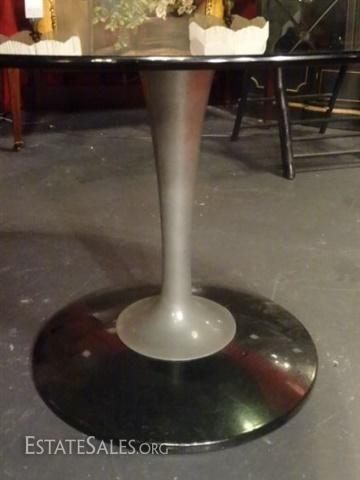 LOT 96E: MID CENTURY BLACK GLASS DINING TABLE, TULIP STYLE METAL BASE, ROUND GLASS TOP, VERY GOOD CONDITION, 48" X 29", SKUJMD