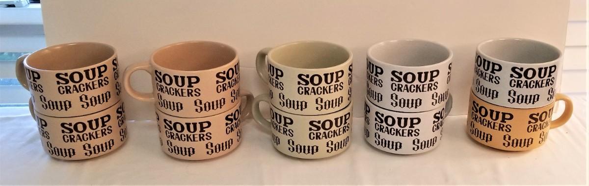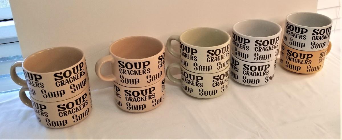 10 soup bowls with mid-century styling. Each is 3" tall, 4" across. Good condition.