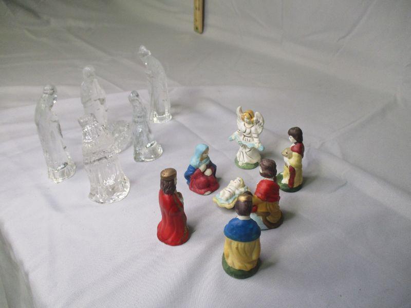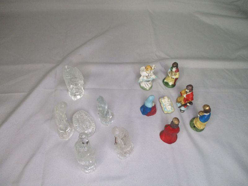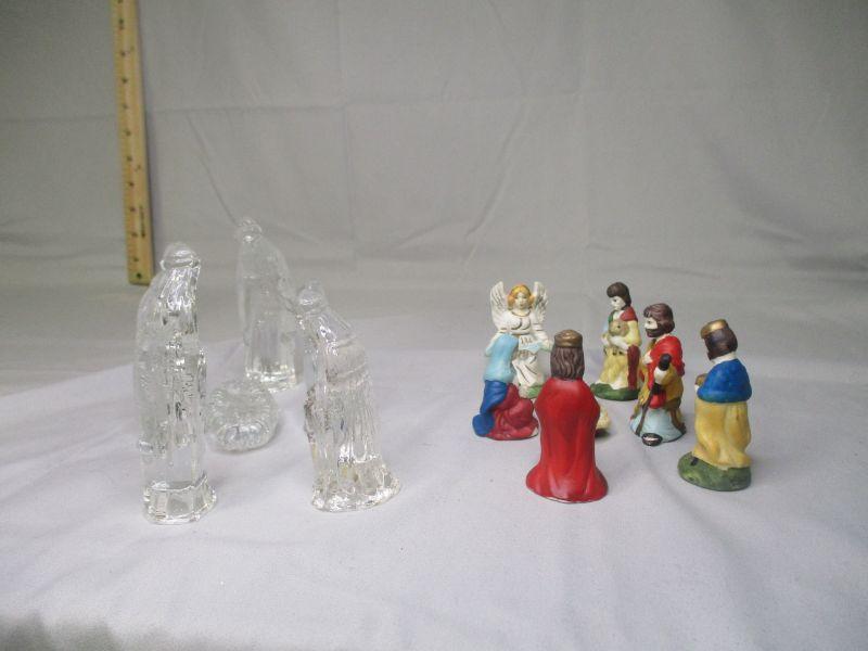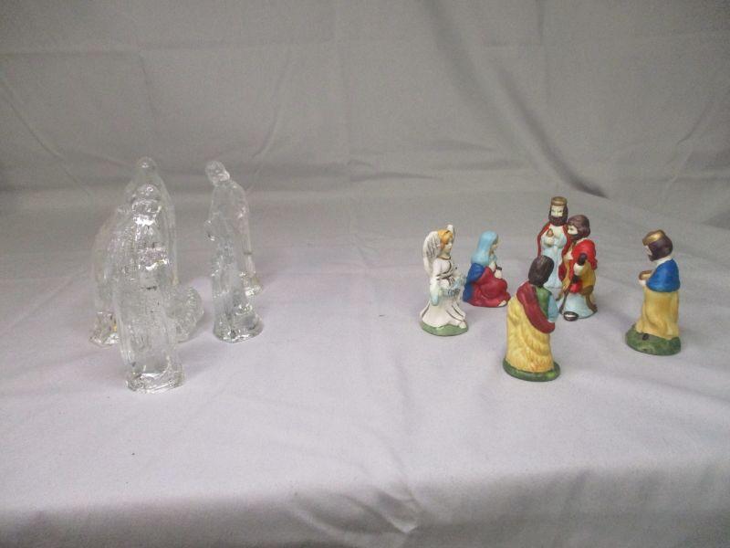 One set has (6) pieces and is clear glass. The other set is ceramic and has (7) pieces.