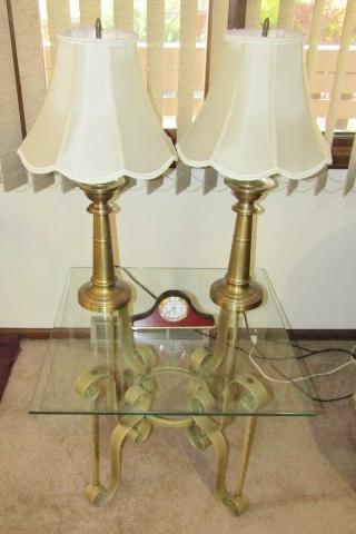 LOT 97  TWO GLASS TOP TABLES AND TWO LAMPS