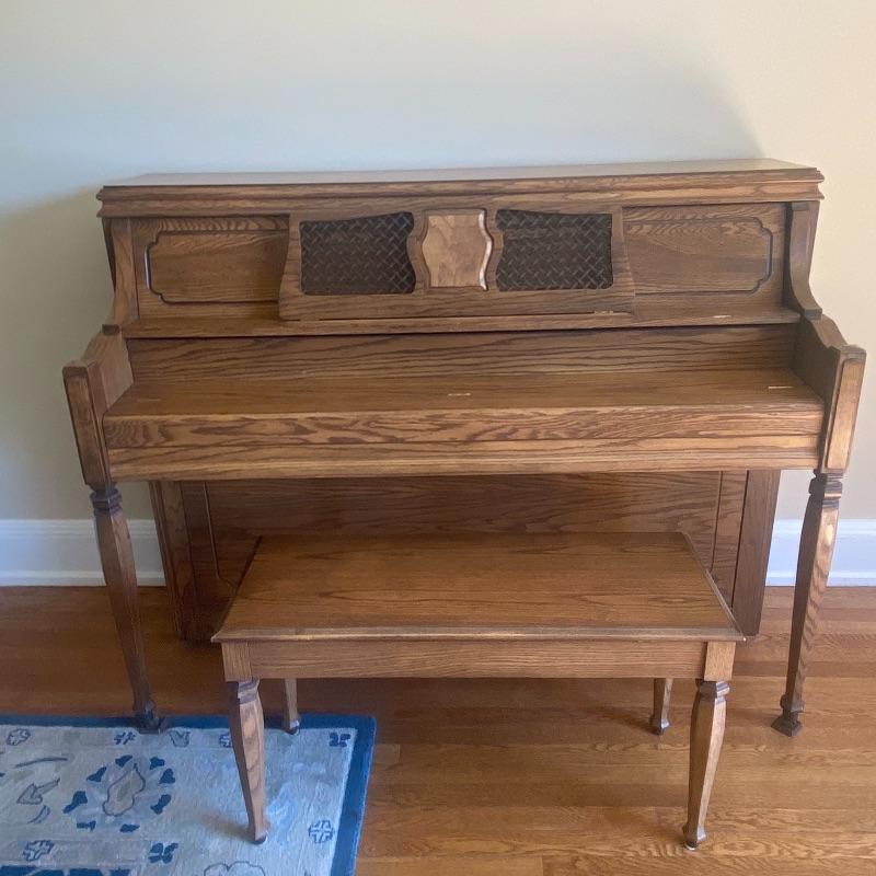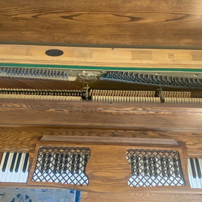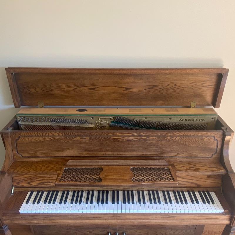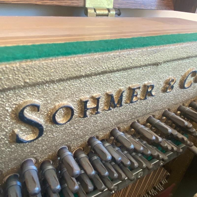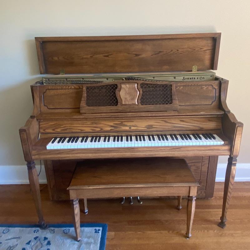 Gorgeous dark-grain wood Sohmer & Co. Piano and bench included in this lot. Great condition and sound produced. Piano measures 58 x 24 x 40 and the bench has measurements of 34”x14.5”x19.5”. See photos. Local pickup only. Please bring help to load. Four steps down from main floor location.