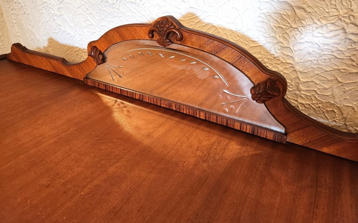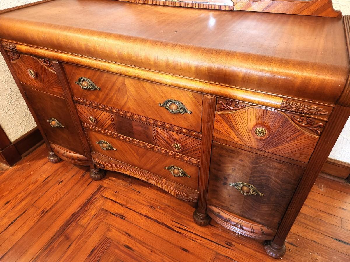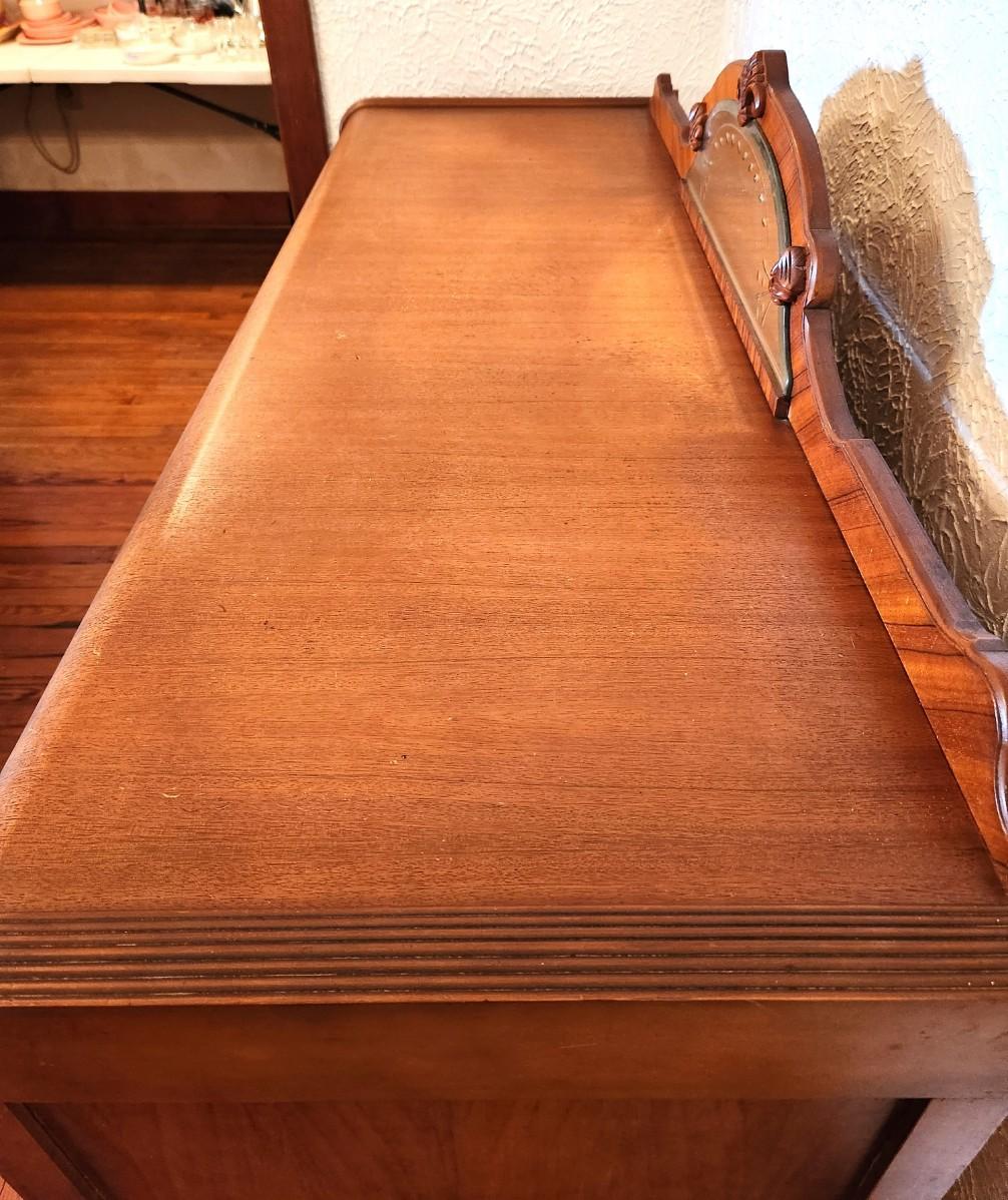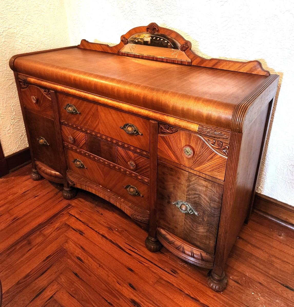 Very nice 1930's Depression era buffet or sideboard. 5 drawers, 2 storage areas beneath, mirrored. 5 feet across, 22" deep, 46" tall at tallest point. Vintage condition - some wear to top. Overall - quite nice. A versatile piece of furniture.