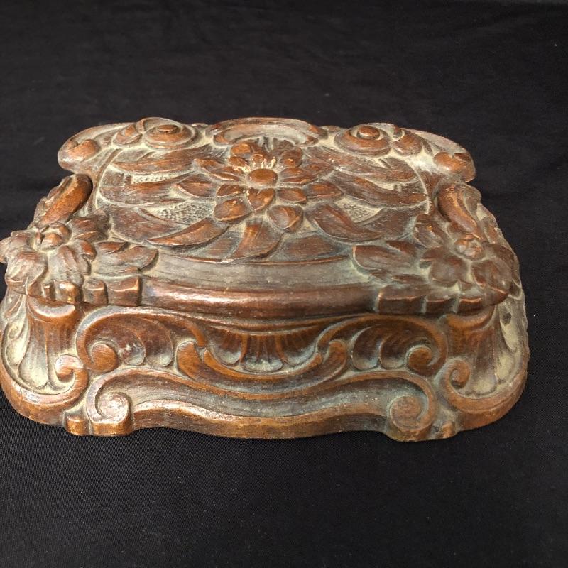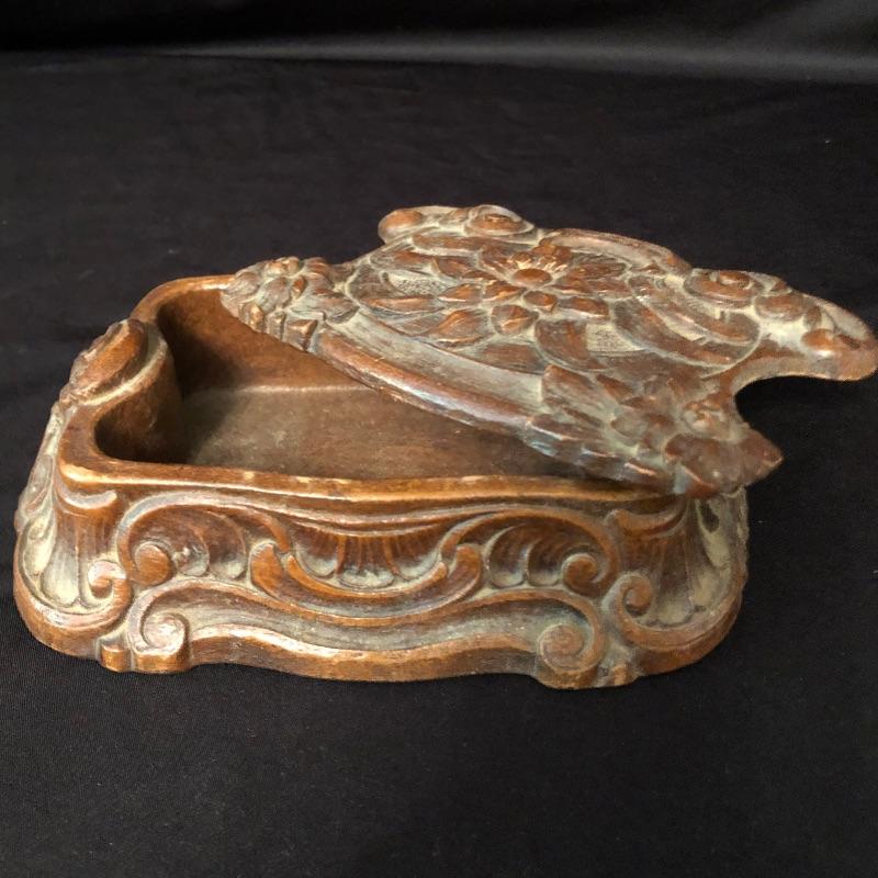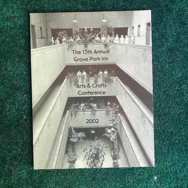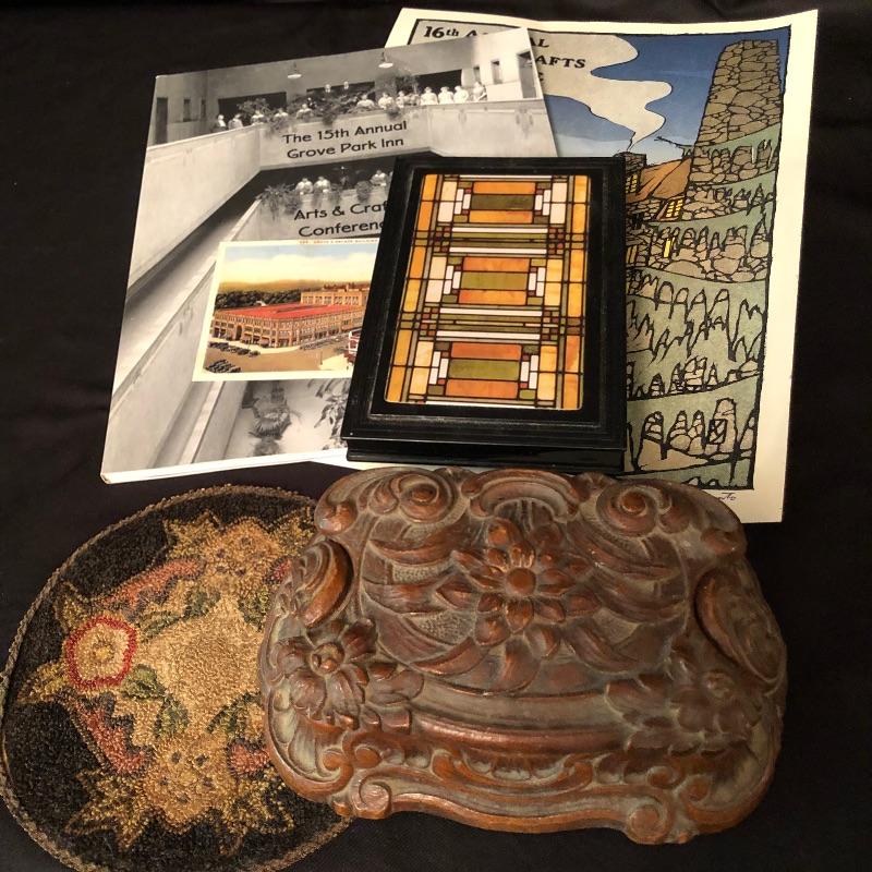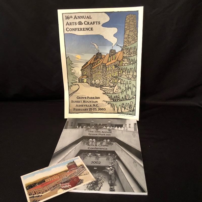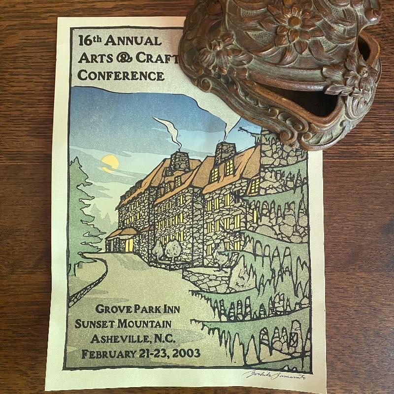 This beautifully carved wooden box is nice and heavy and well made. Similar to a jewelry casket box. Lot also includes a poster by Yoshiko Yamamoto and a catalog from the 2002 Grove Park Inn Arts & Crafts Conference. Some other items include a plastic notepad, and a woven mat.