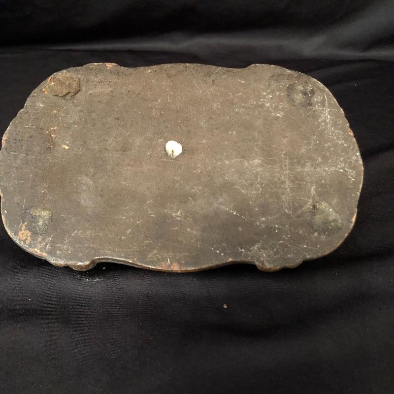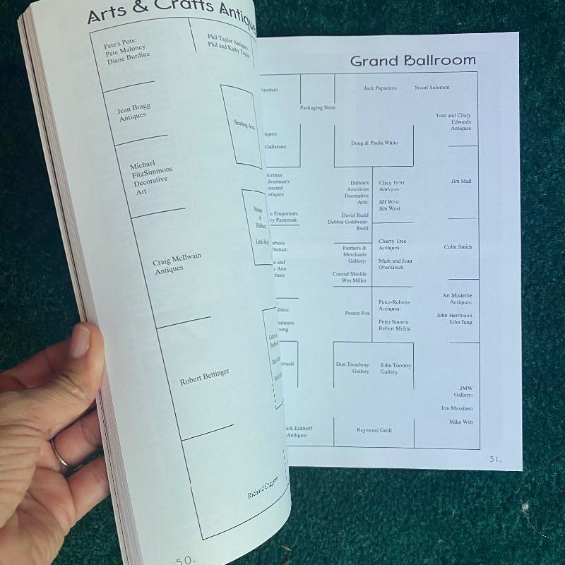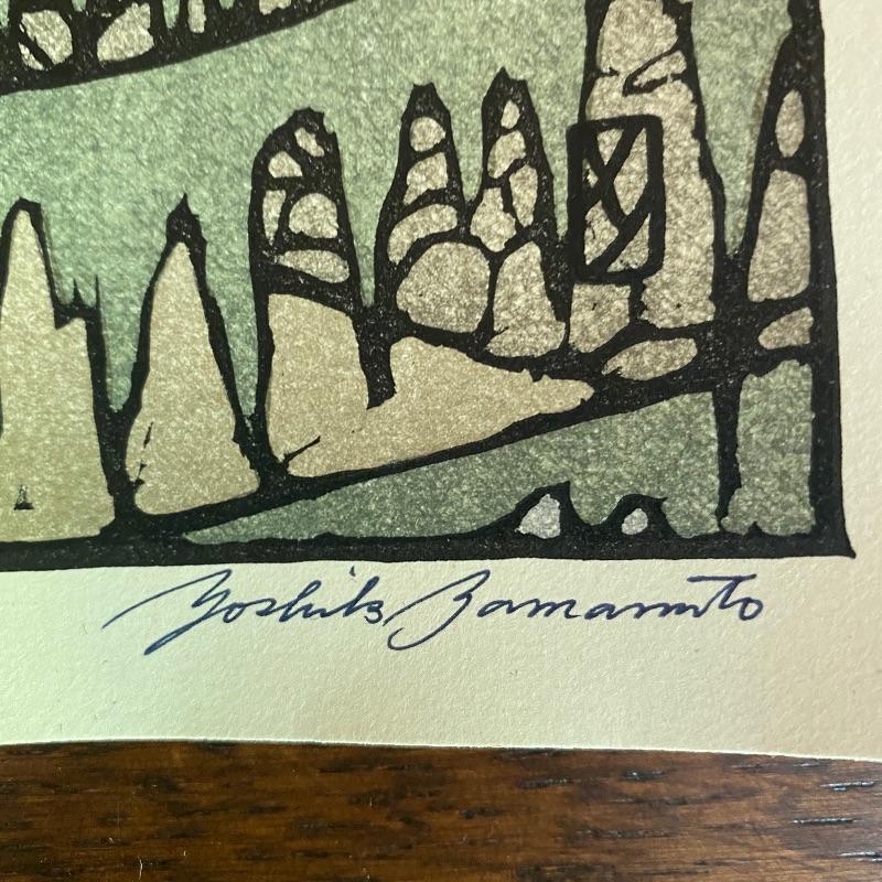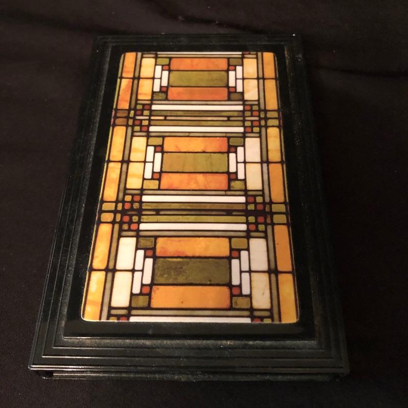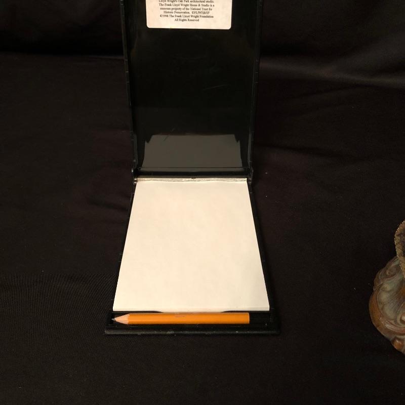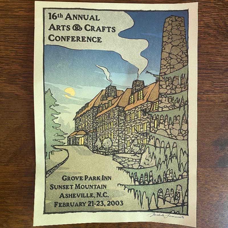 This beautifully carved wooden box is nice and heavy and well made. Similar to a jewelry casket box. Lot also includes a poster by Yoshiko Yamamoto and a catalog from the 2002 Grove Park Inn Arts & Crafts Conference. Some other items include a plastic notepad, and a woven mat.