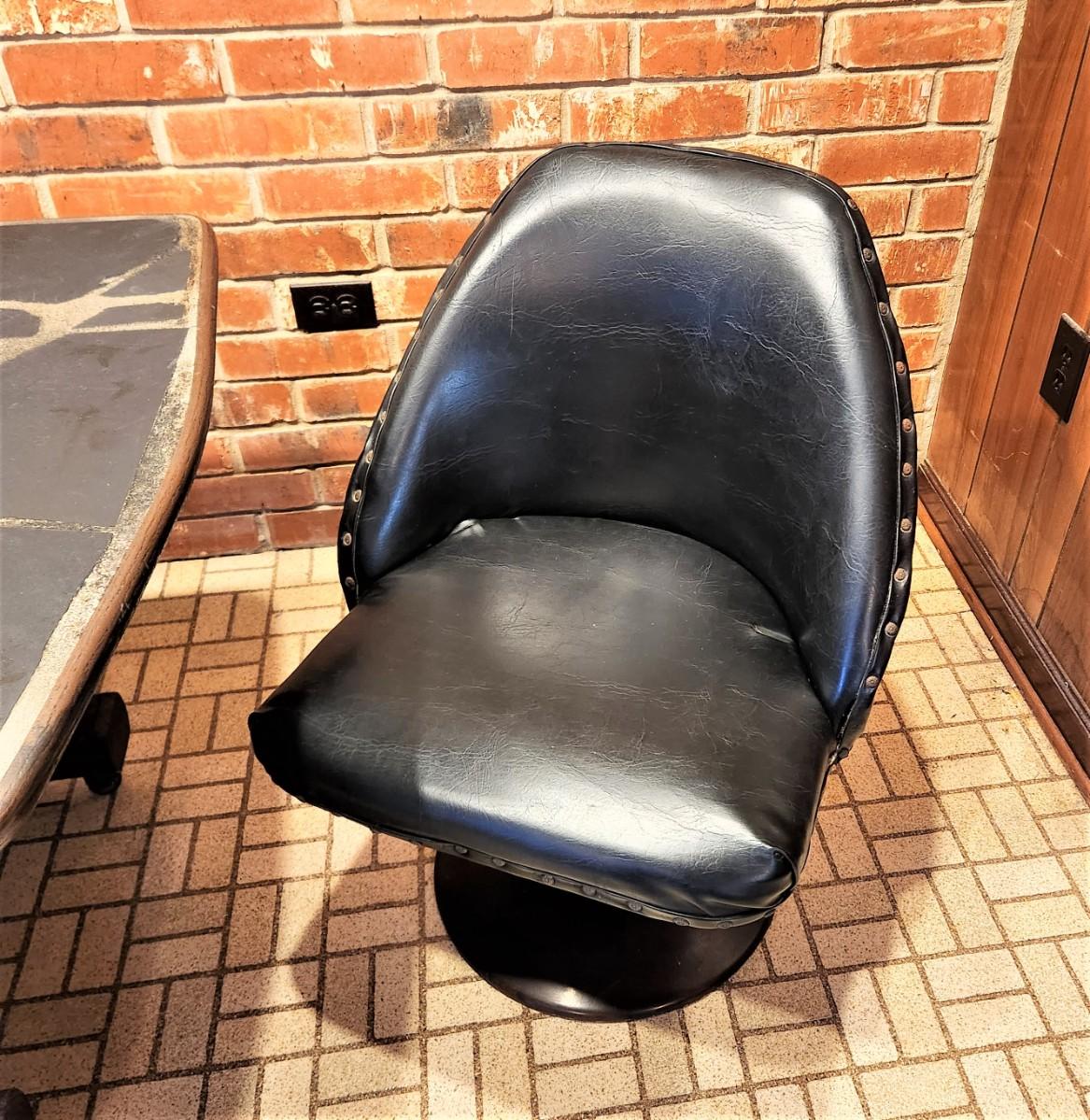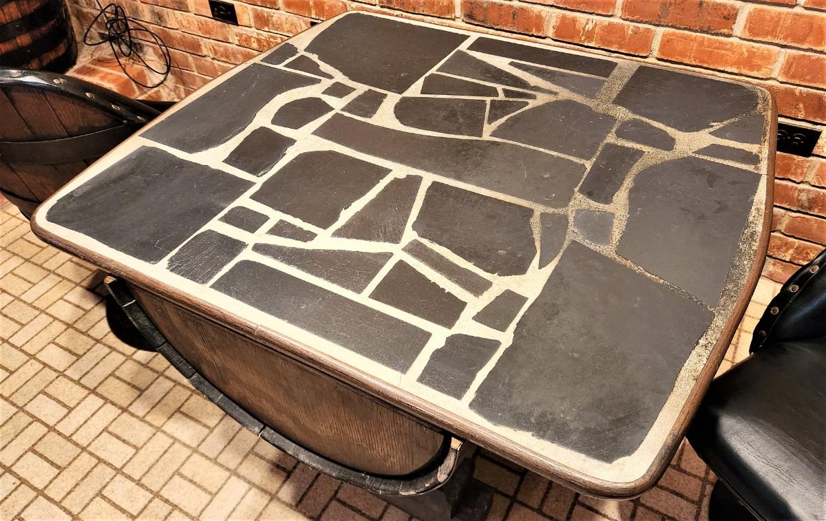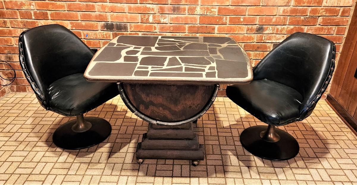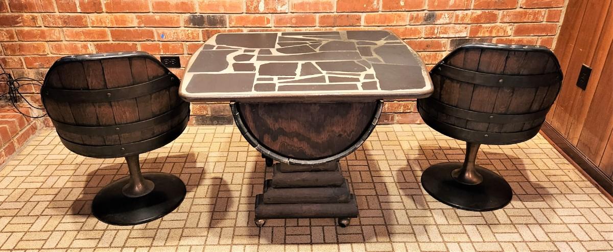 We have two sets of these in this sale - hand-crafted one of a kind items. Pub table and two matching chairs made from barrels - black slate top on table, swivel chairs. Table on wheels - heavy. Great vintage condition. Table measures 40" x 33", 28.5" tall. Chairs are 20" across, 32" tall at the back. You get what you see here. Perfect "man-cave" addition.