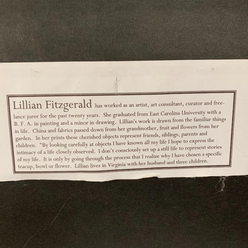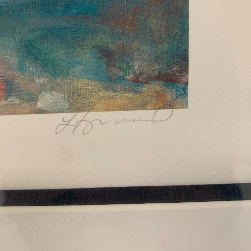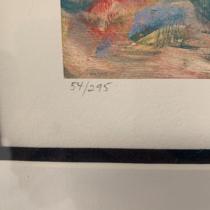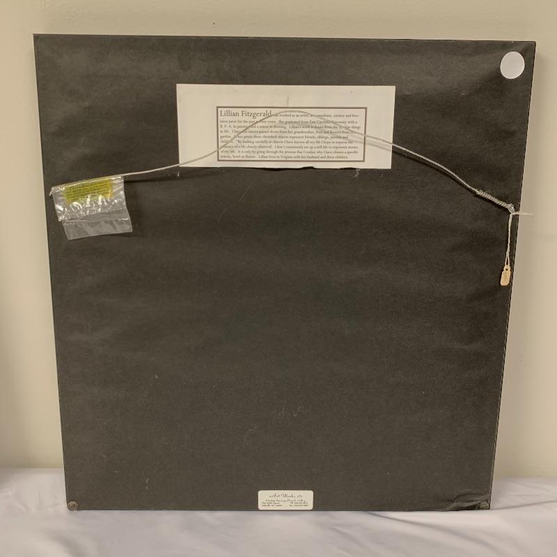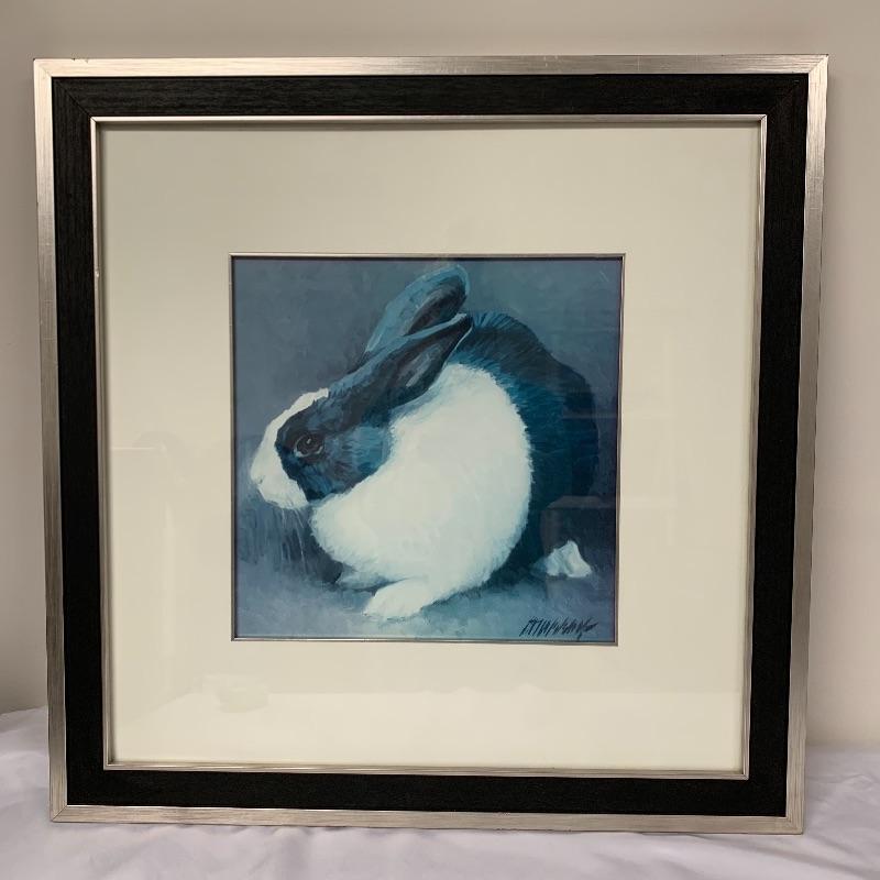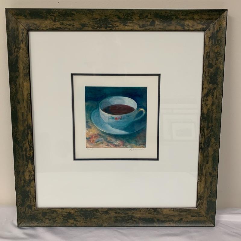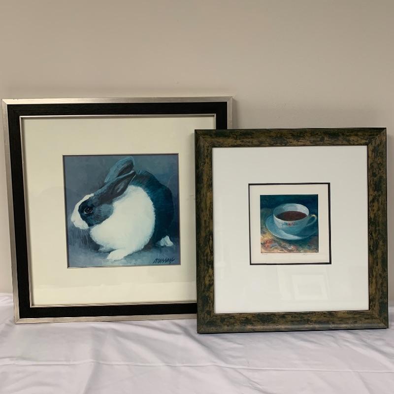 Signed and numbered (54/295) print of a tea cup by Lillian Fitzgerald. Art is behind glass and mated. About 19in x 20.5in. The bunny print artwork is by Richard Murray. See picture for details. Both professionally framed by Art Works Etc. Art behind glass and mated. About 23in x 23in x 1in.