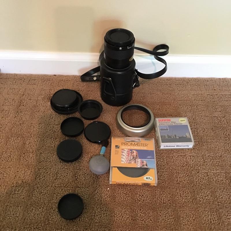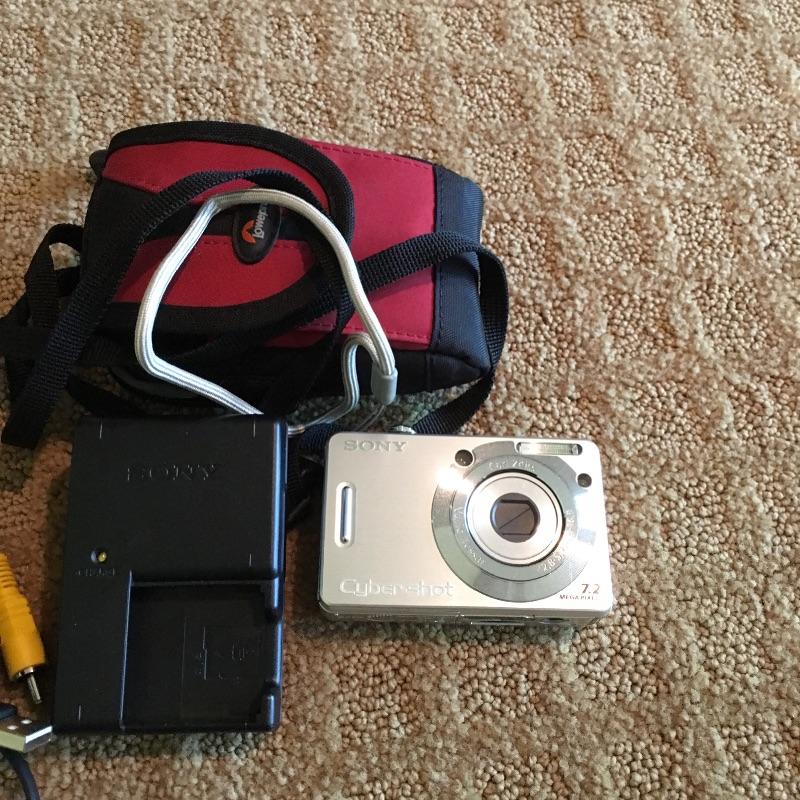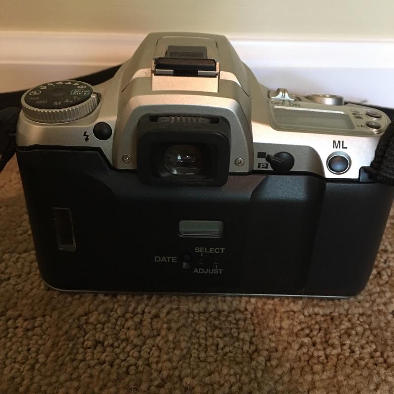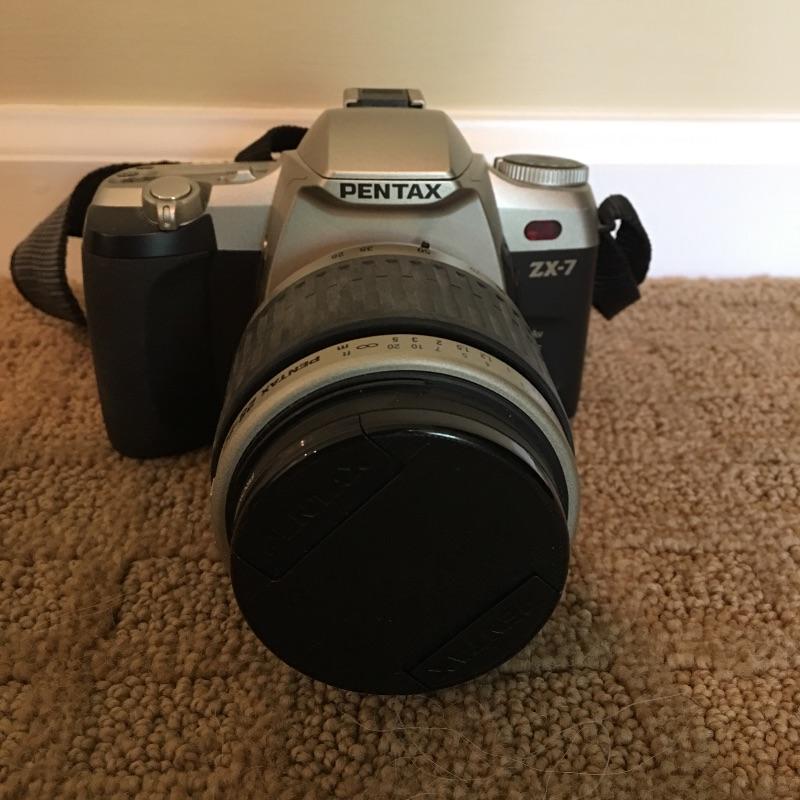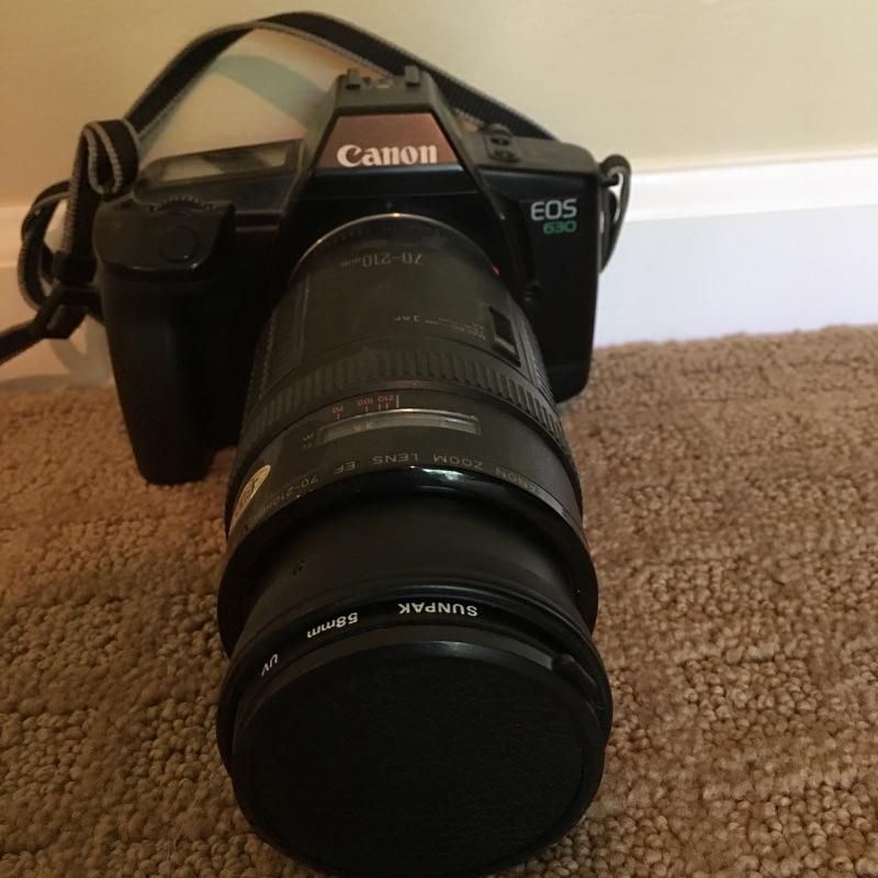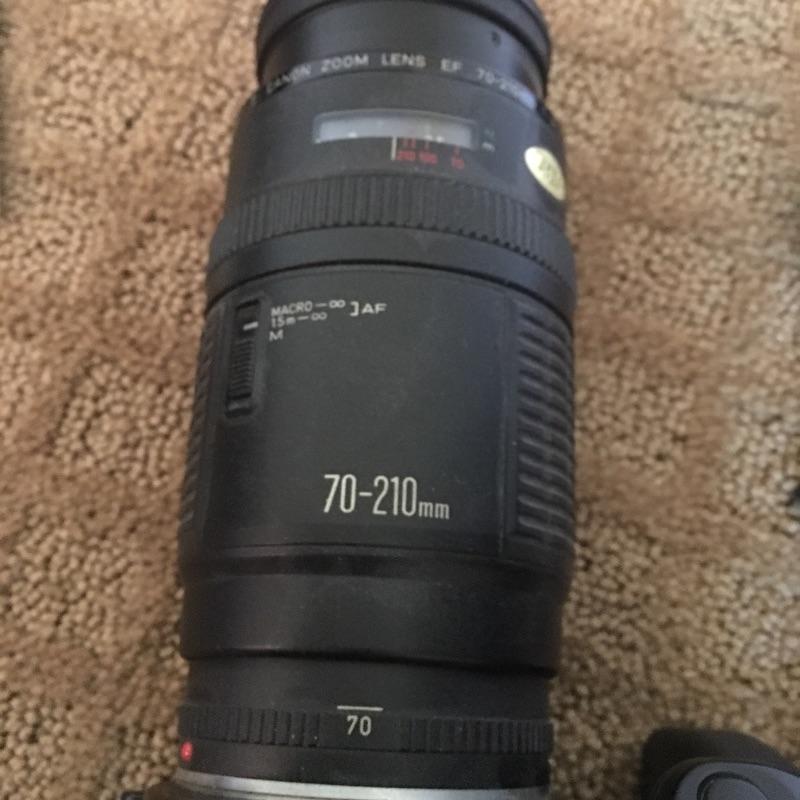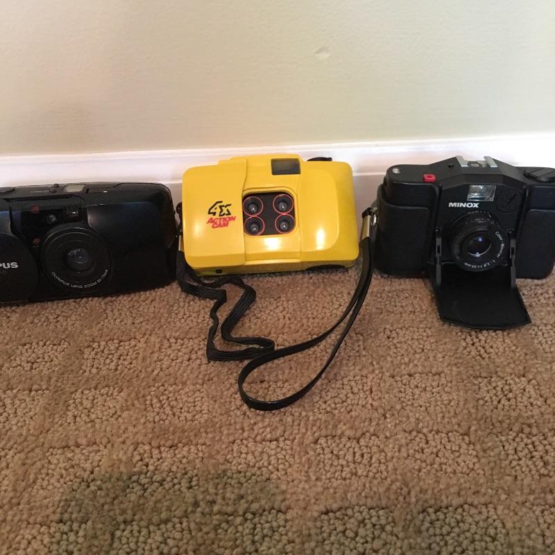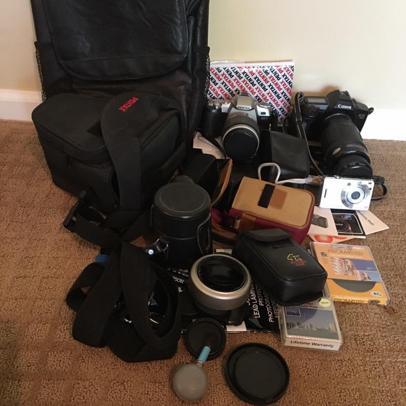 Nice assortment of cameras in many shapes and sizes including Canon EOS 630 with Canon 70-210 lense, Pentax ZX-7, Sony Cyber-shot and lots more camera things.