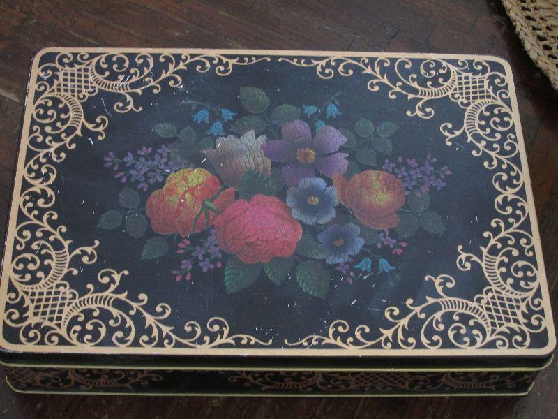 Fruit decorated rectangular tin made by Barringer Wallis and Manners from Mansfield, England.