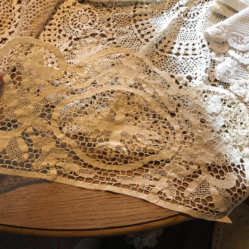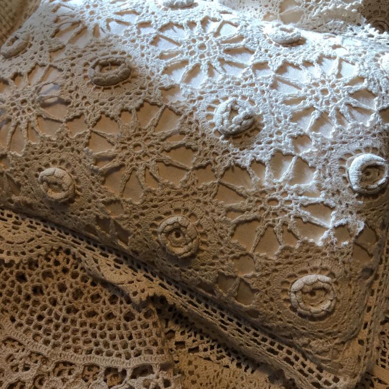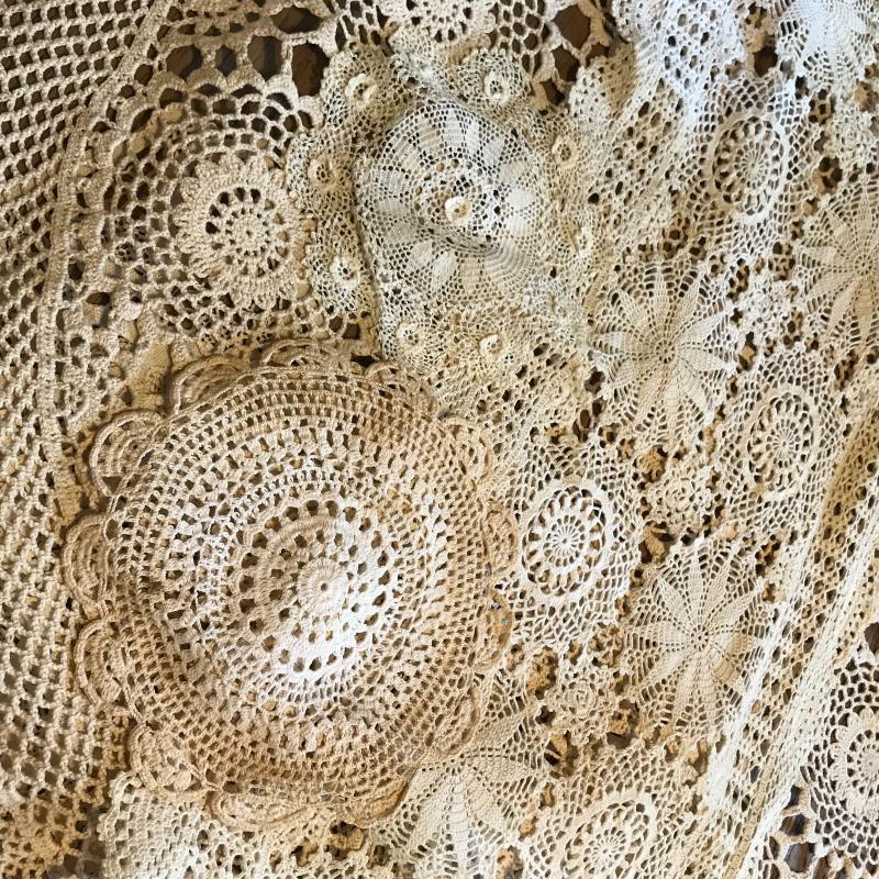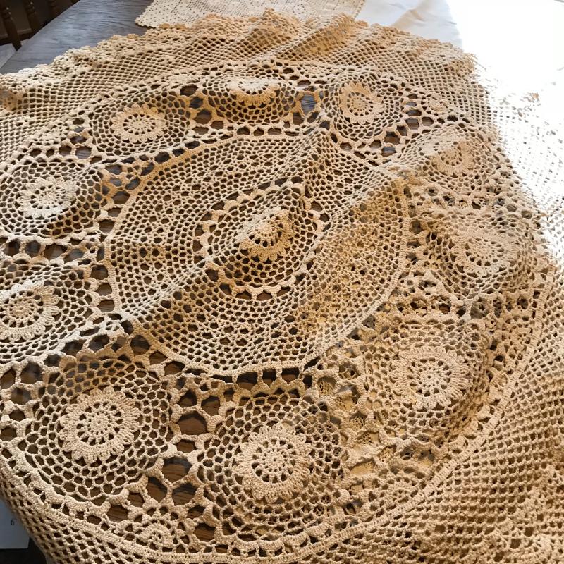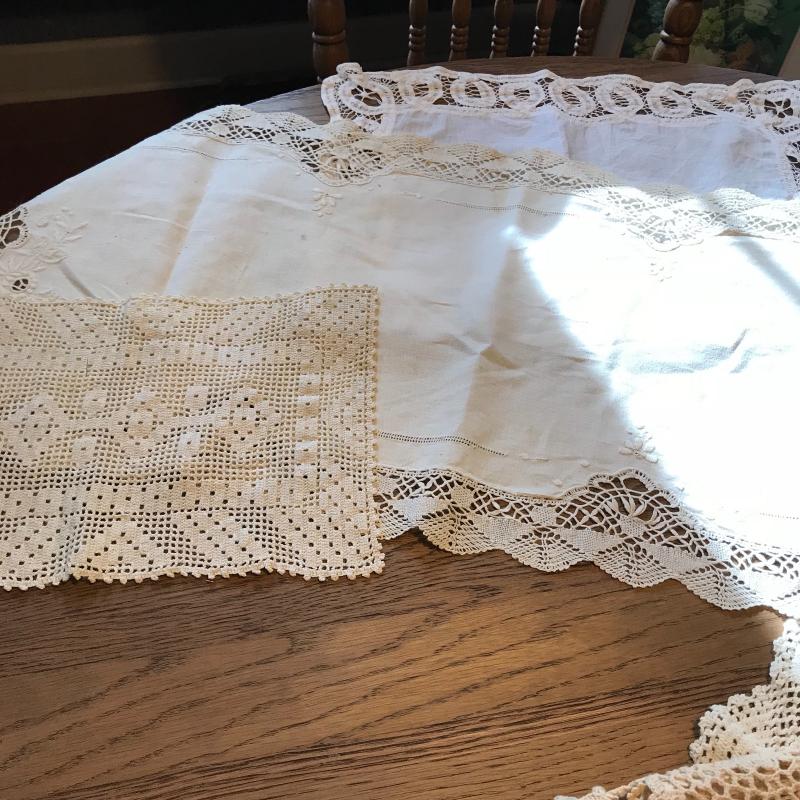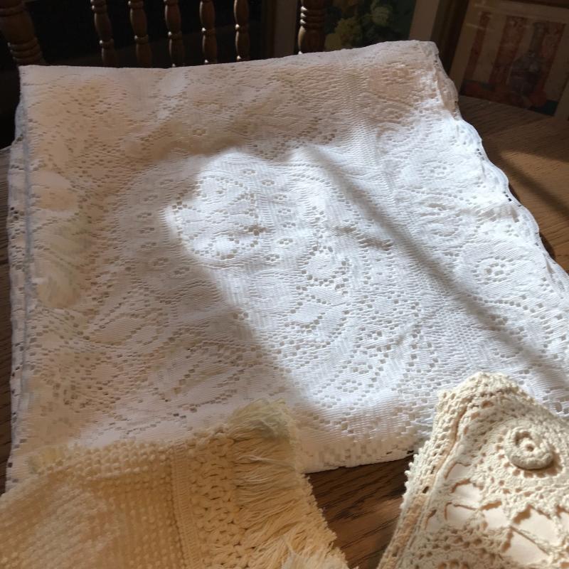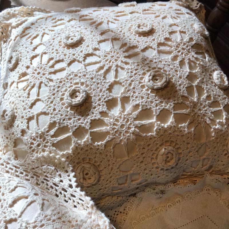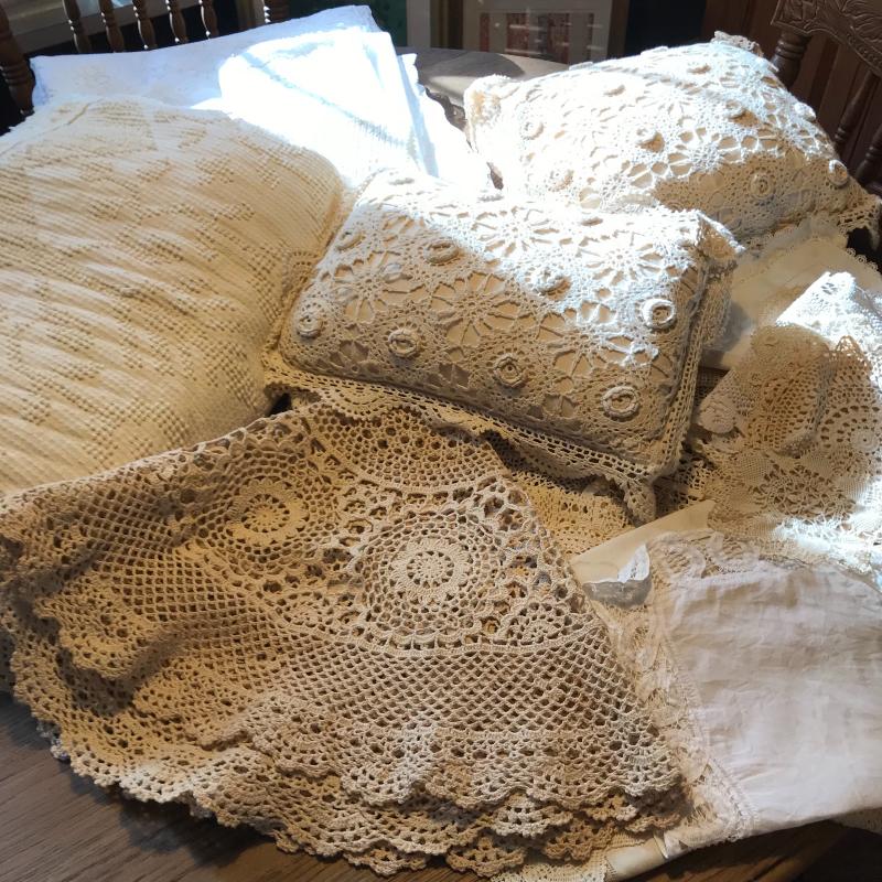 This lot contains many crocheted pieces, including pillows and doilies. Also includes a lacy shower curtain and bedspread. Shipping available or local pickup in Flat Rock, NC.