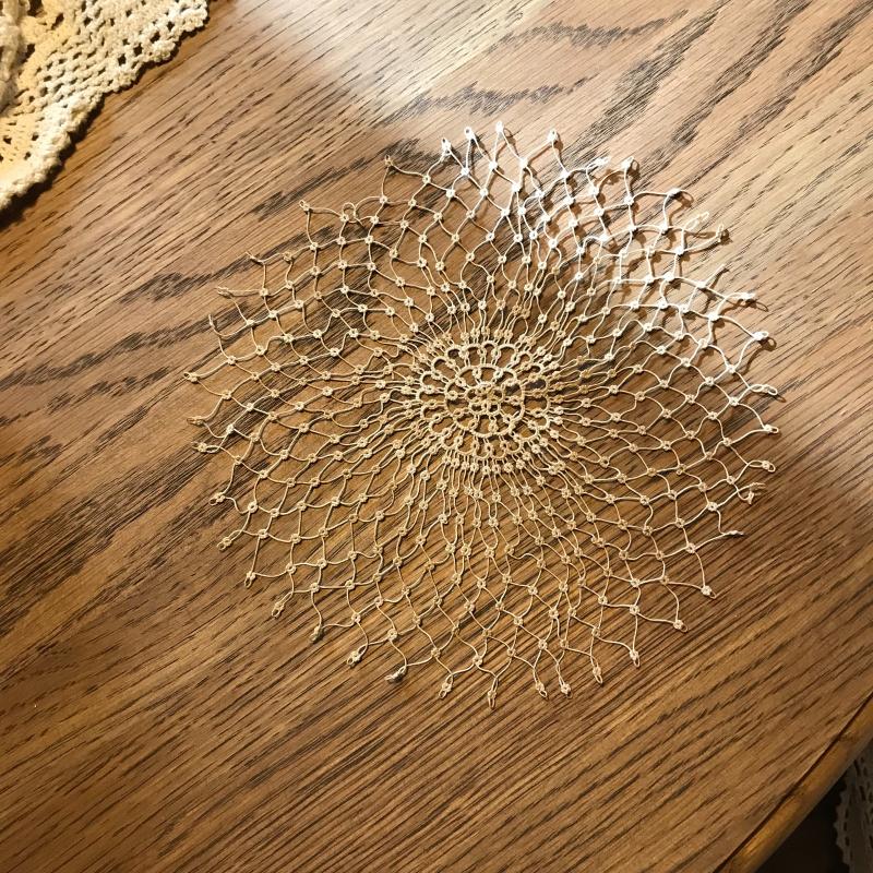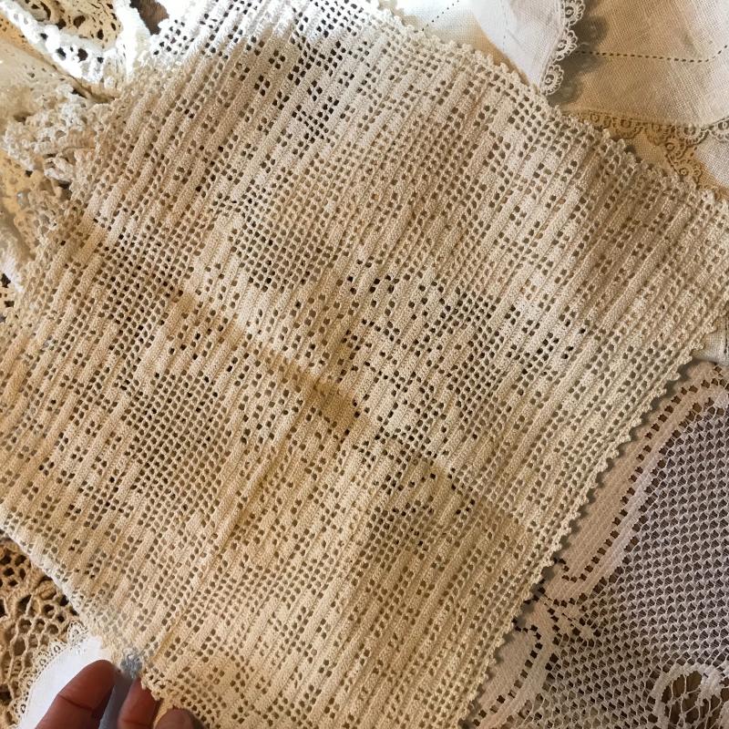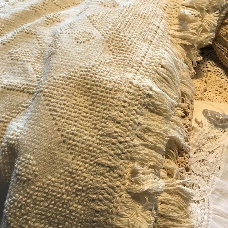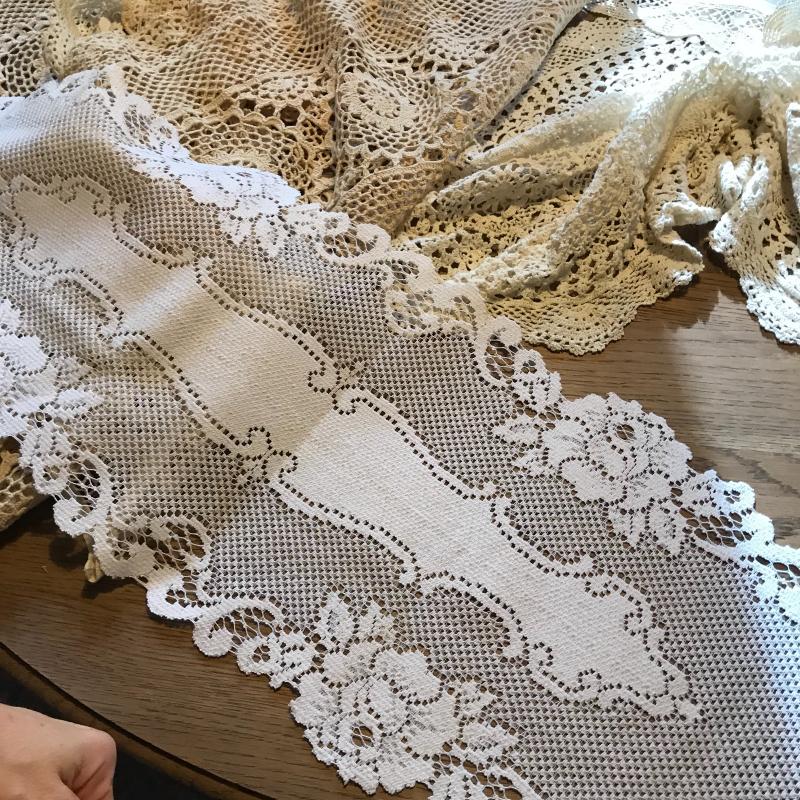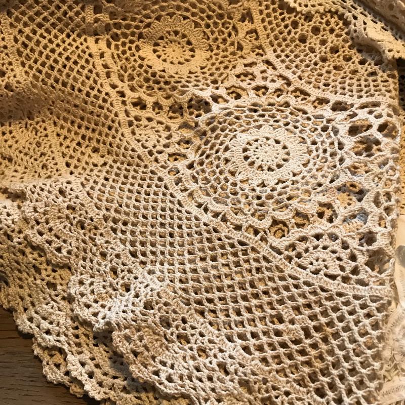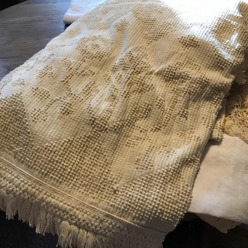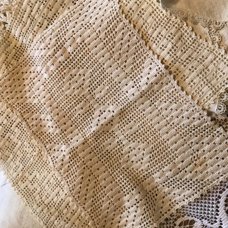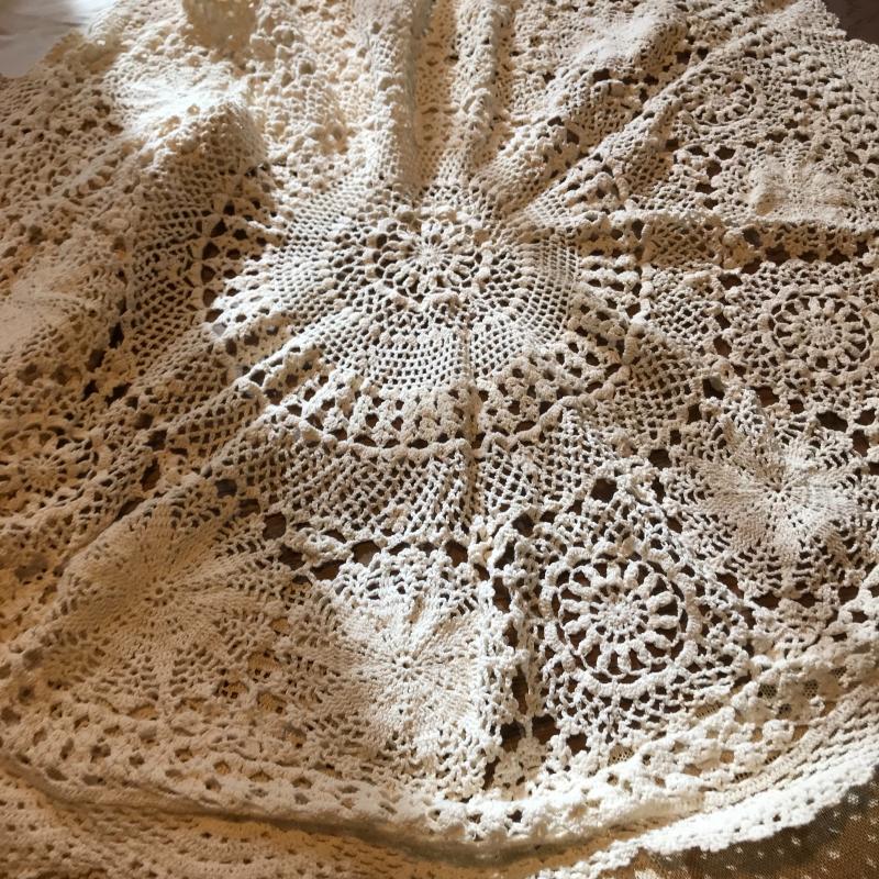 This lot contains many crocheted pieces, including pillows and doilies. Also includes a lacy shower curtain and bedspread. Shipping available or local pickup in Flat Rock, NC.