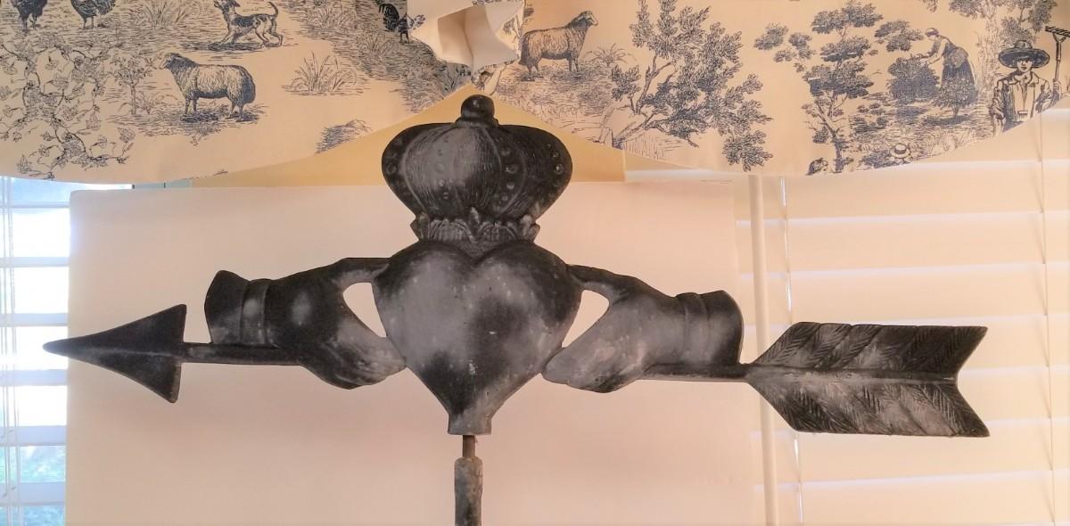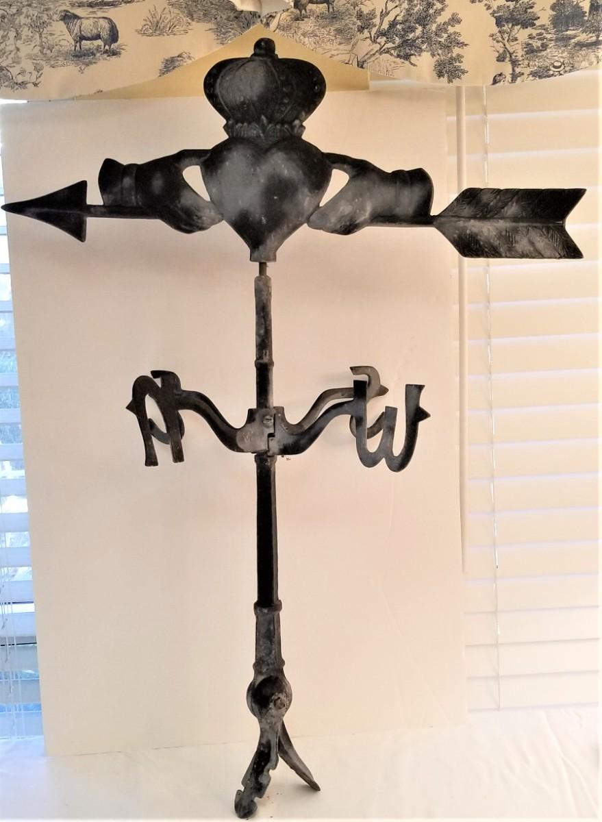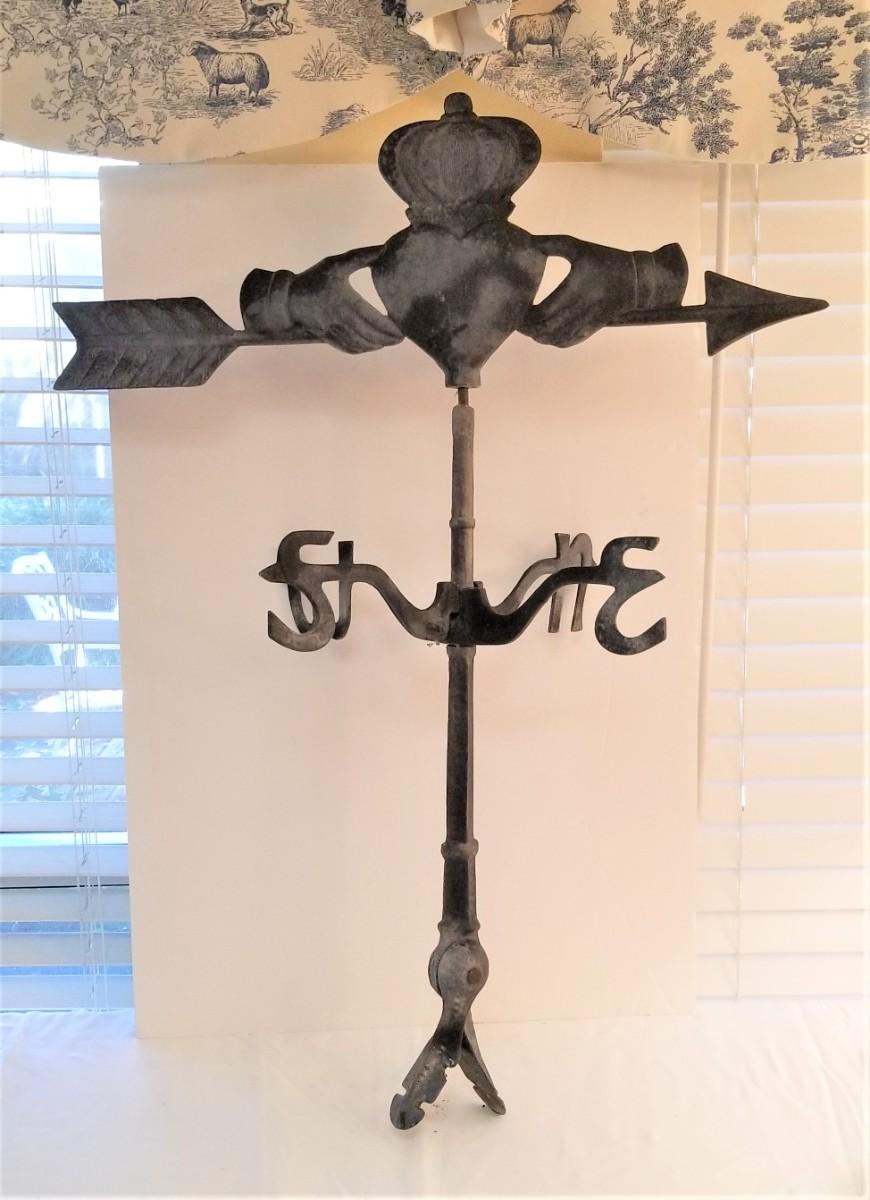 Contemporary cast aluminum weather vane - 31" tall, 23.5" across. Has North, South, East, West wind directions the the Irish Claddagh symbol on top.
