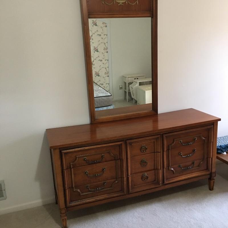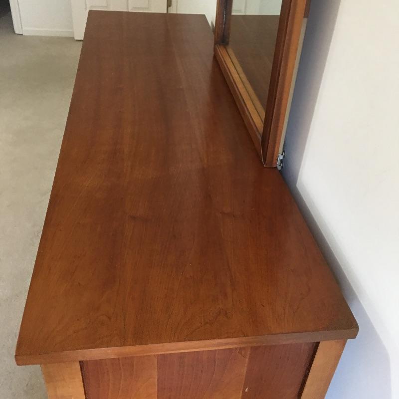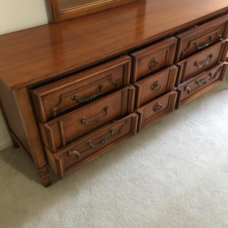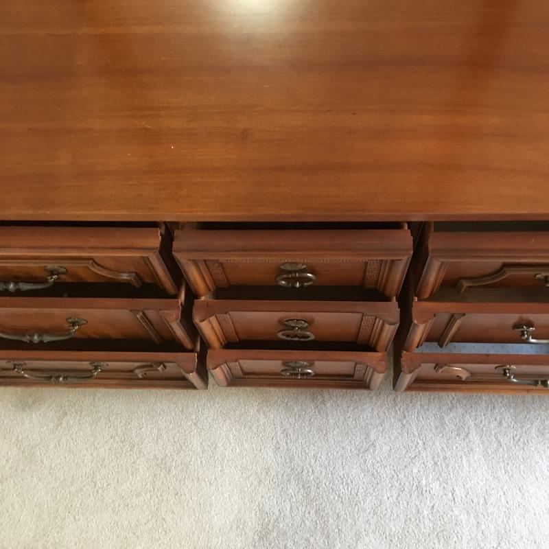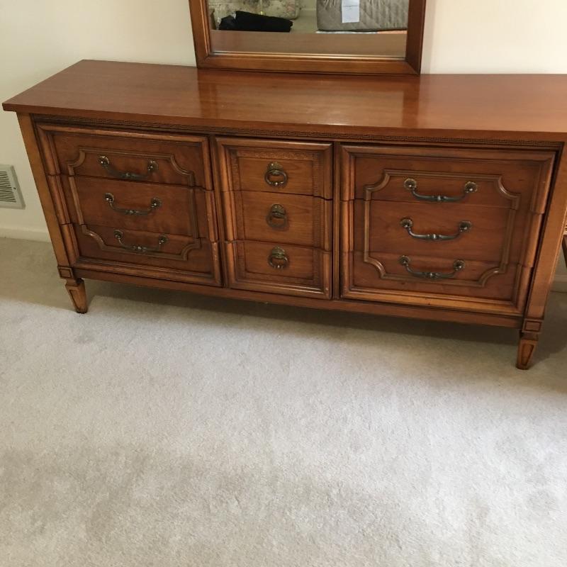 Dresser with nine dovetailed drawers and mirror. Nice large dresser to hold lots of your clothes. Dresser has a few scratches on top and back cover is loose, see pictures. Mirror can be removed for transport. Dresser measures 18.75” x 63.75” x 30.5” and mirror frame measures 29” x 50.5”. Item is substantial bring help.